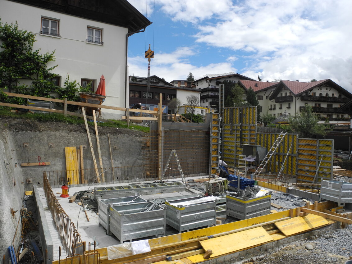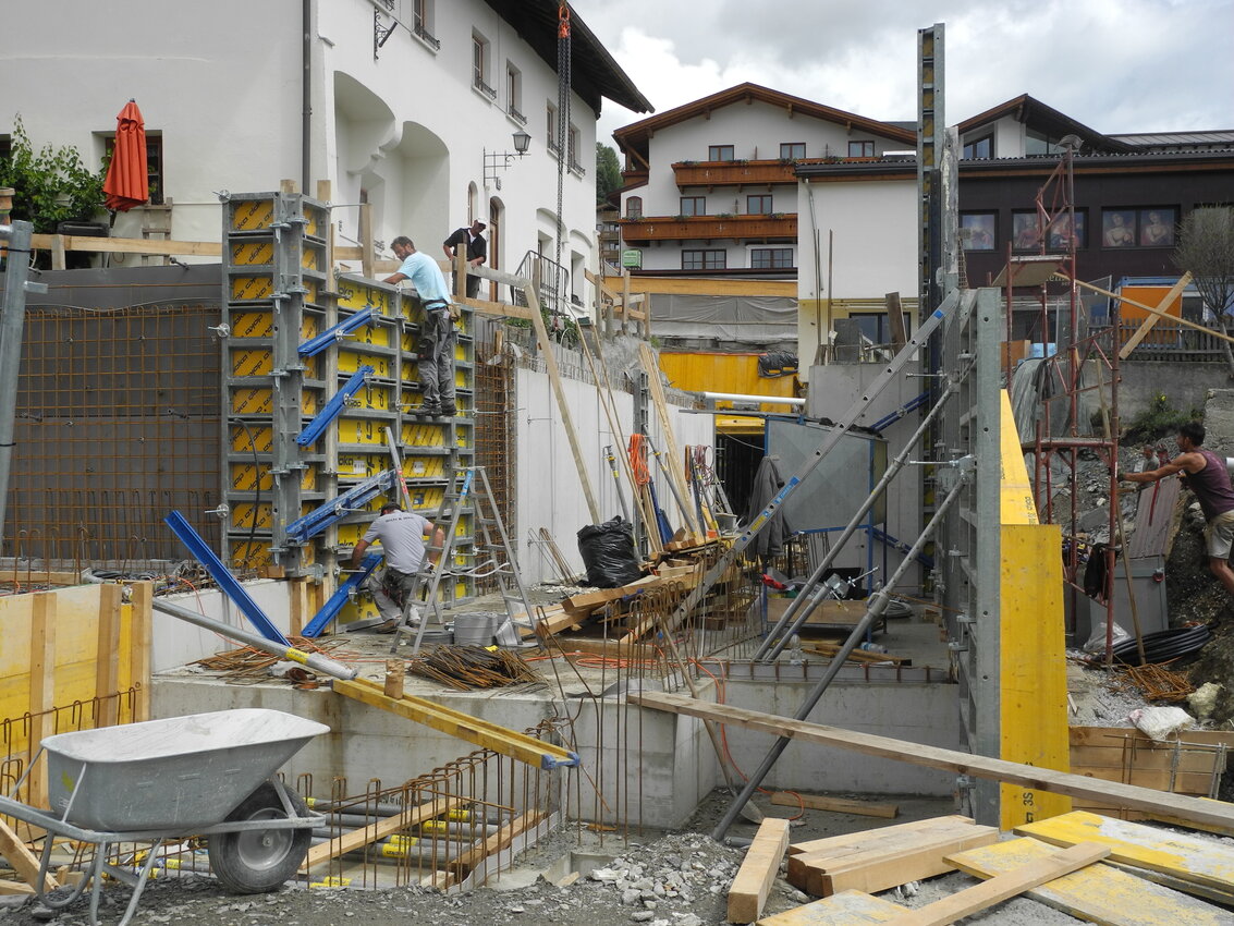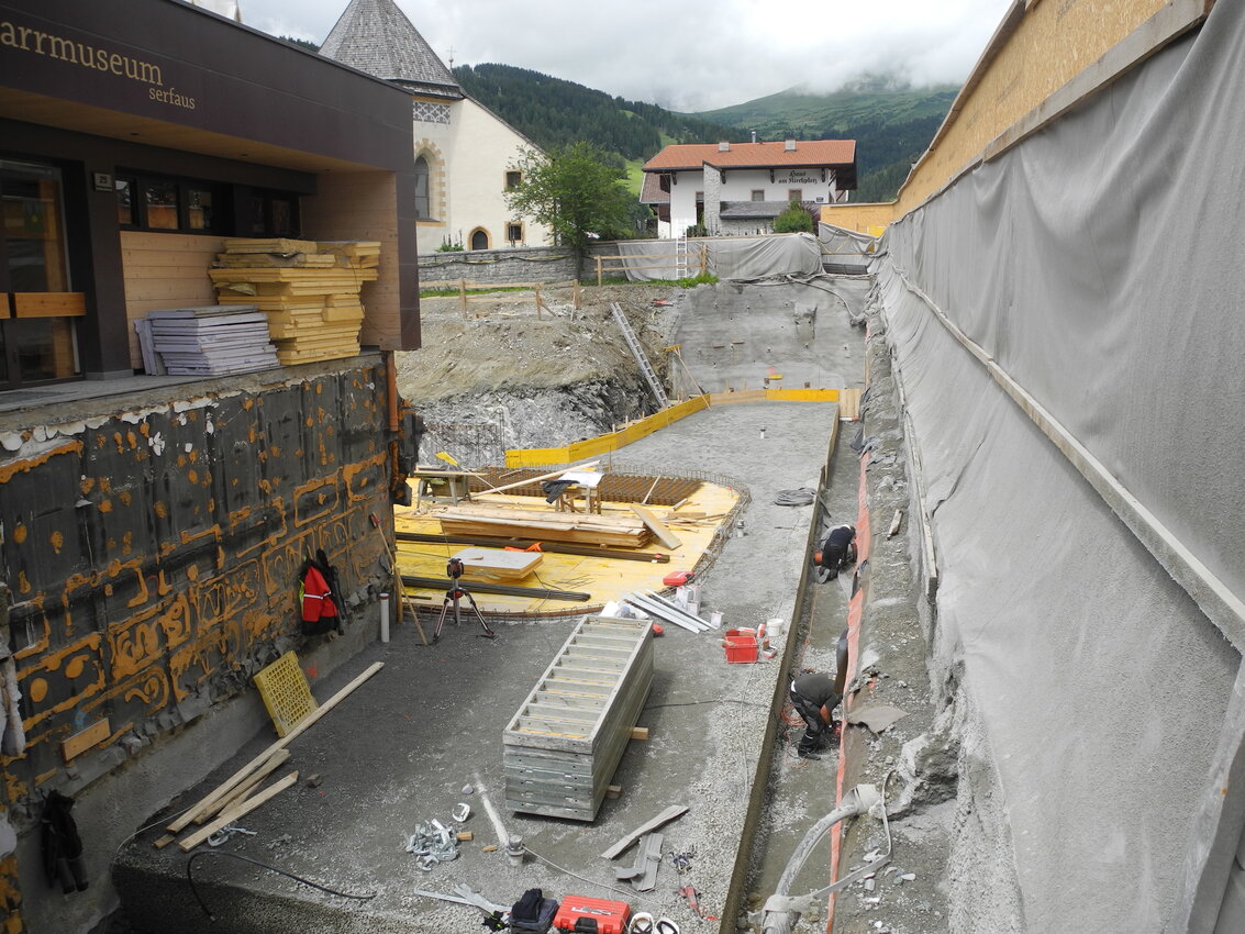 Die Bauarbeiten an der neuen Station Kirche laufen während der Sommermonate auf Hochtouren weiter, damit auch diese Station den Gästen im Dezember 2017 zur Verfügung steht. Momentan wird die erste Decke, sowie der Zugangstunnel Richtung Kirchgasse geschalt und betoniert. Die Bodenplatte von der Garage beim Widum ist bereits fertig gestellt. Auch die Betonschneidearbeiten für die neuen Türen im bestehenden Tunnel sind mittlerweile abgeschlossen.