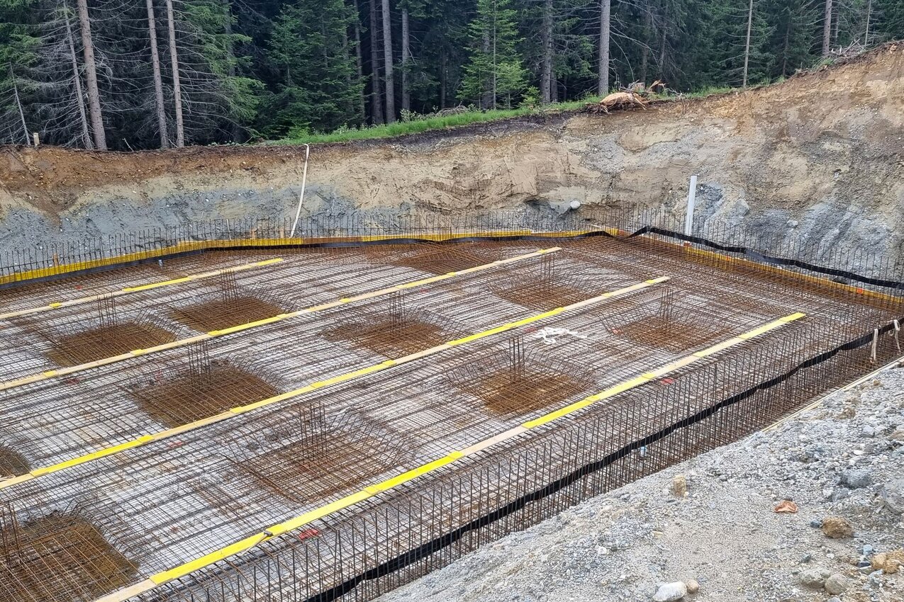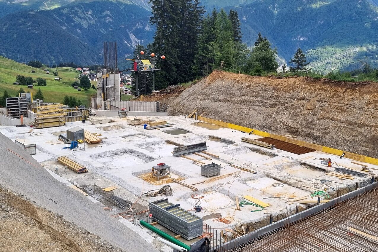 Der Aushub ist bereits komplett erledigt, die ersten Betonarbeiten am Fundament des Kellerbahnhofs sind abgeschlossen (z. B. der vordere Bereich, in dem sich die Kompressorstation befinden wird). Nahezu das gesamte Aushubmaterial wurde im Bereich der Mittelabfahrt zur Pistenkorrektur wieder eingebaut. Das noch verbliebene Material wird für die Hinterfüllung der Station verwendet. Modernste Technik ist auch hier im Einsatz. So sind die Bagger mit einem System ausgestattet, das per GPS die Höhen exakt angibt und die Bagger keine unnötigen Grabungen durchführen müssen.