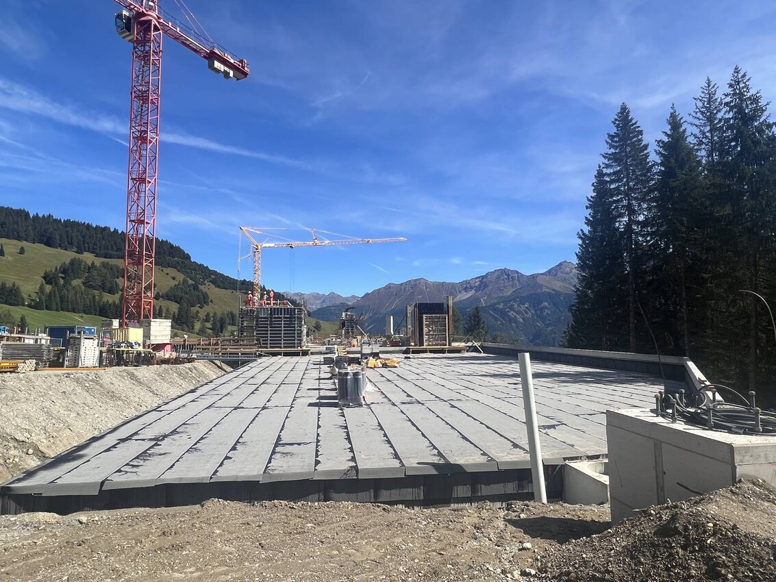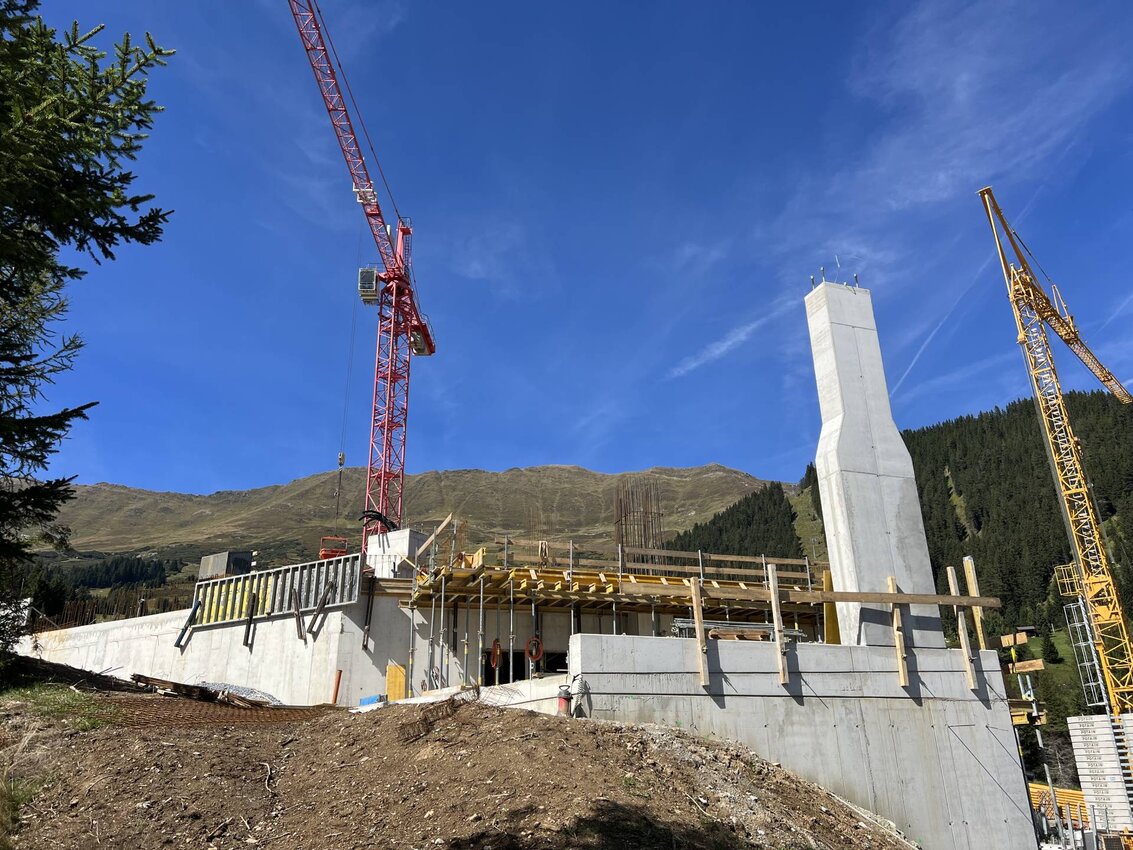 Die Rohbauarbeiten an der Zwischenstation gehen zügig voran. Der Gondelbahnhof für die im Erstausbau 104 Gondeln sowie die Wände für das restliche Untergeschoss sind bereits fertiggestellt. Die Betonarbeiten an der Kellergeschossdecke werden demnächst abgeschlossen. Derzeit wird mit Hochdruck am Mannschaftsraum, den (öffentlichen) WC-Anlagen und einem Lagerraum gearbeitet. Im heurigen Jahr werden sämtliche Rohbauarbeiten abgeschlossen. Der restliche Ausbau bzw. die Montage und Fertigstellung der Station erfolgt im nächsten Jahr. Im südlichen Bereich wurde der Bahnhof bereits komplett hinterfüllt. Die Decke wird derzeit vollständig geflämmt, damit diese heuer noch humusiert werden kann. Der Bahnhof ist nach Fertigstellung von Außen nicht mehr sichtbar und komplett in das Landschaftsbild integriert.