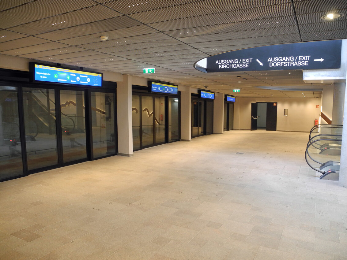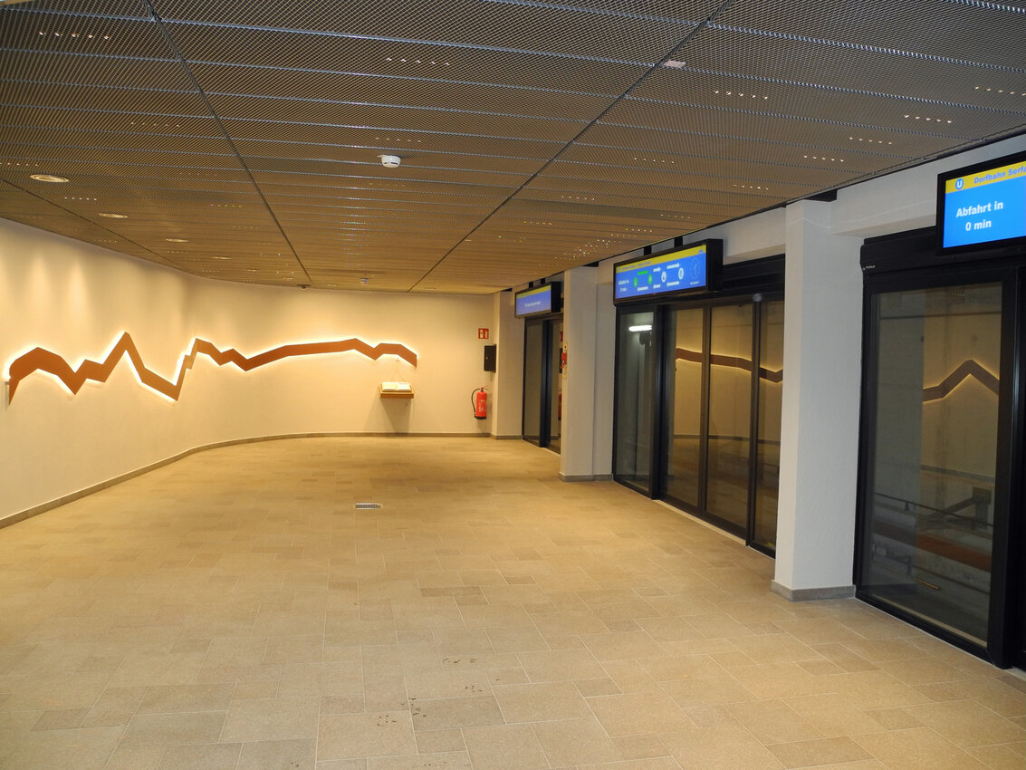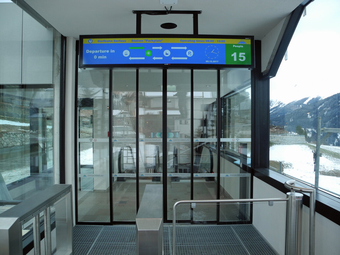Schon am Ortseingang ist unschwer zu erkennen, dass die erste Phase der Erneuerung abgeschlossen ist. Von der Dorfbahnstraße aus ist die Station Parkplatz ganz bequem über Rolltreppen bzw. einen Aufzug zu erreichen. Der Zugang vom Parkplatz zur Station ist nach wie vor derselbe. Schon beim Betreten der „neuen“ Station wird man von der Helligkeit und der offenen Bauweise positiv überrascht. Und was ist das? Man sieht jetzt sogar den Tunnel, in dem sich die Bahn fortbewegt – großzügige Fensterfronten ermöglichen diesen neuen Einblick. Über den Türen sind große Bildschirme angebracht, auf denen man abwechselnd den aktuellen Bahnstatus, sowie Wetterinfos, aber auch Livebilder aus dem Skigebiet verfolgen kann. Diese Bildschirme sind übrigens in allen neuen Stationen installiert.