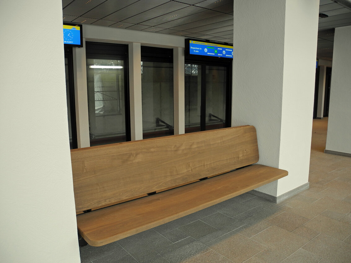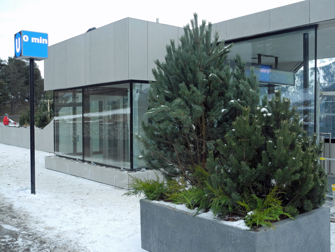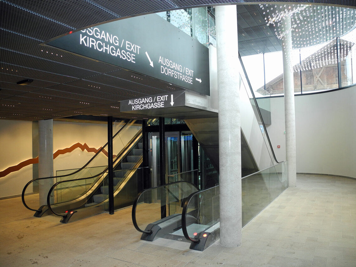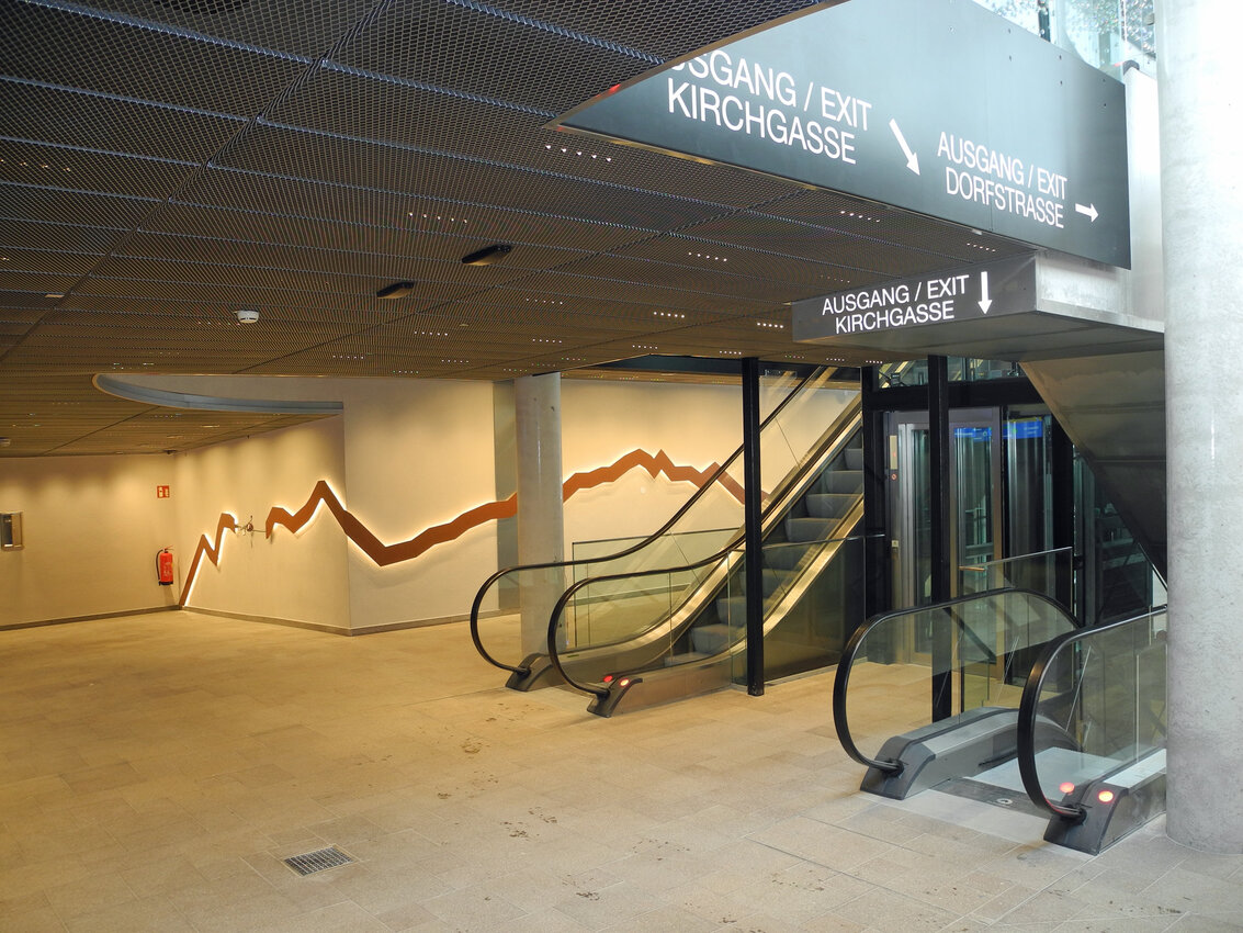 Schon am Ortseingang ist unschwer zu erkennen, dass die erste Phase der Erneuerung abgeschlossen ist. Von der Dorfbahnstraße aus ist die Station Parkplatz ganz bequem über Rolltreppen bzw. einen Aufzug zu erreichen. Der Zugang vom Parkplatz zur Station ist nach wie vor derselbe. Schon beim Betreten der „neuen“ Station wird man von der Helligkeit und der offenen Bauweise positiv überrascht. Und was ist das? Man sieht jetzt sogar den Tunnel, in dem sich die Bahn fortbewegt – großzügige Fensterfronten ermöglichen diesen neuen Einblick. Über den Türen sind große Bildschirme angebracht, auf denen man abwechselnd den aktuellen Bahnstatus, sowie Wetterinfos, aber auch Livebilder aus dem Skigebiet verfolgen kann. Diese Bildschirme sind übrigens in allen neuen Stationen installiert.