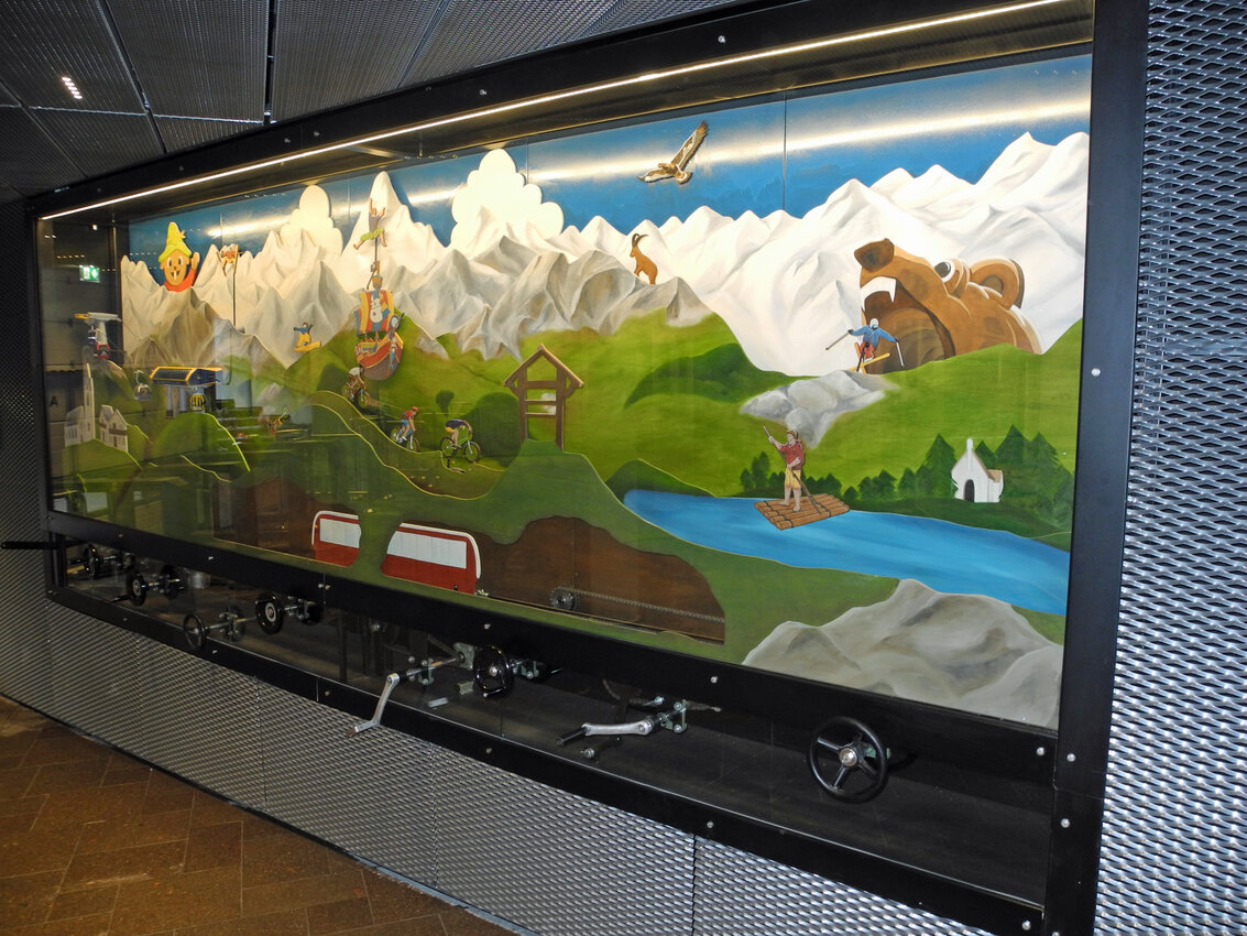 Weiß jemand, was eine Erlebnismaschine ist? Nein? Dann ist ein Besuch der Seilbahn Endstation ein absolutes MUSS. Dort verbirgt sich hinter einer großen Glasscheibe nämlich ein tolles, interaktives Bild, welches nicht nur bestaunt werden will! Über verschiedene Hebel und Kurbeln kann das Bild bewegt und verändert werden, so fahren zum Beispiel Biker entlang einer Radstrecke oder das Maskottchen Murmli winkt immer wieder hinter den Bergen hervor. Auch für Interessierte der U-Bahn-Technik wurde ein eigener Bereich eingerichtet, in dem die Entstehungsgeschichte der U-Bahn Serfaus von Zeitzeugen erzählt wird.