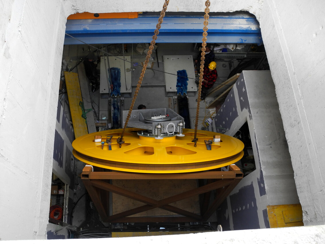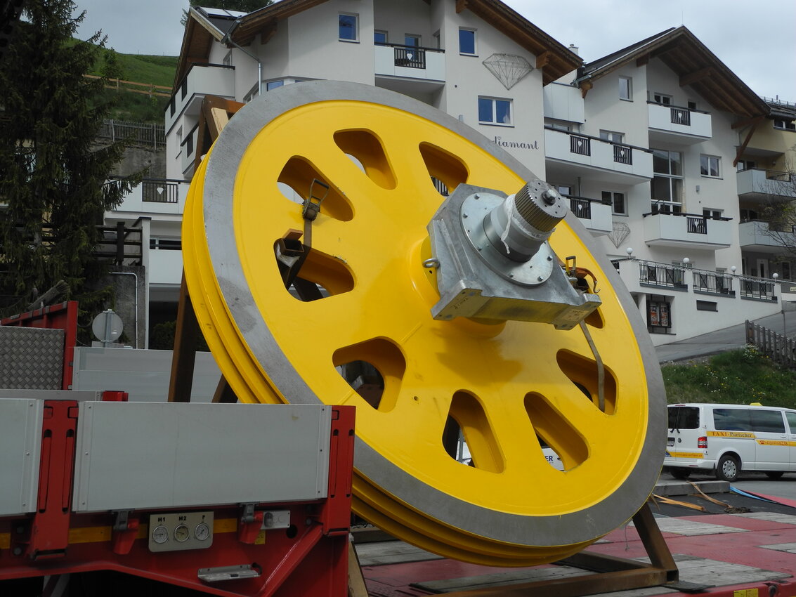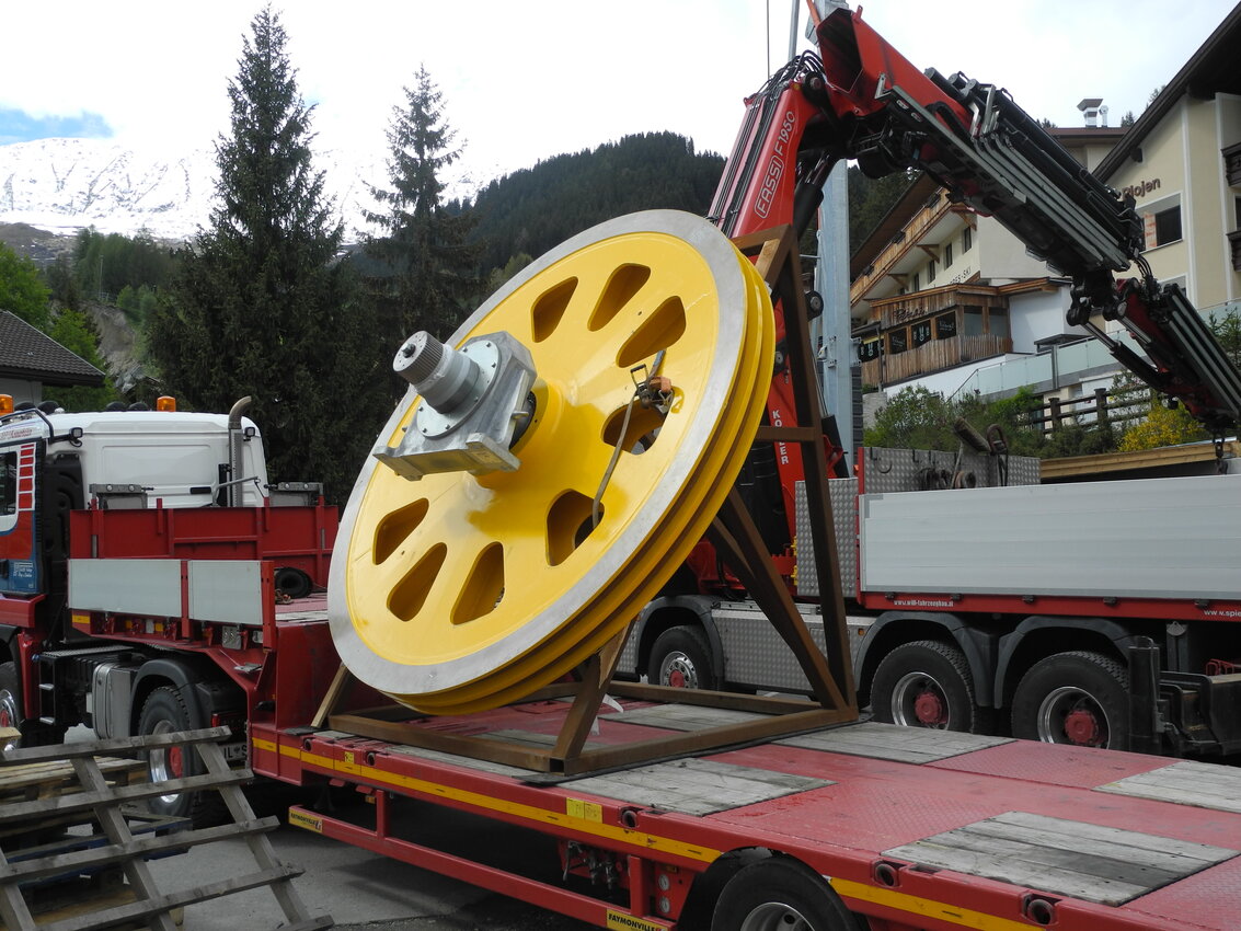 Mit gespanntem Blick konnte man beobachten, wie die beiden neuen Seilscheiben der U-Bahn Serfaus an die richtigen Stellen gehoben wurden. Zentimeter für Zentimeter wurden die ca. 8,5 Tonnen schweren Scheiben abgelassen, die nun an ihren neuen Bestimmungsorten für die nächsten Jahrzehnte verbleiben werden.