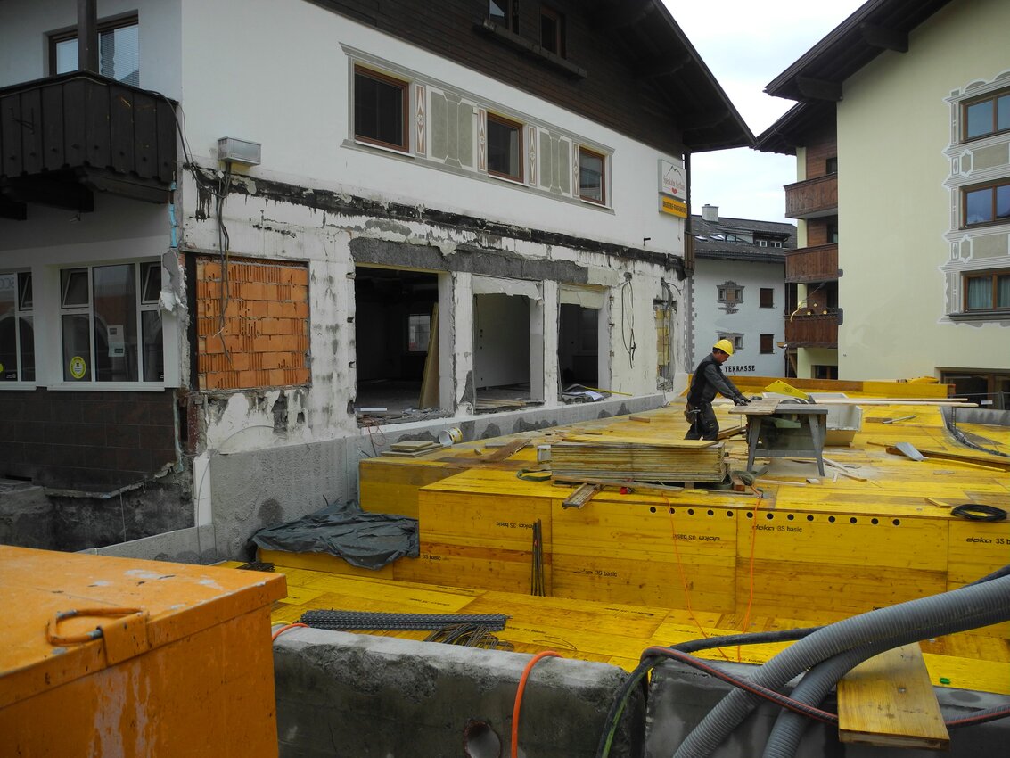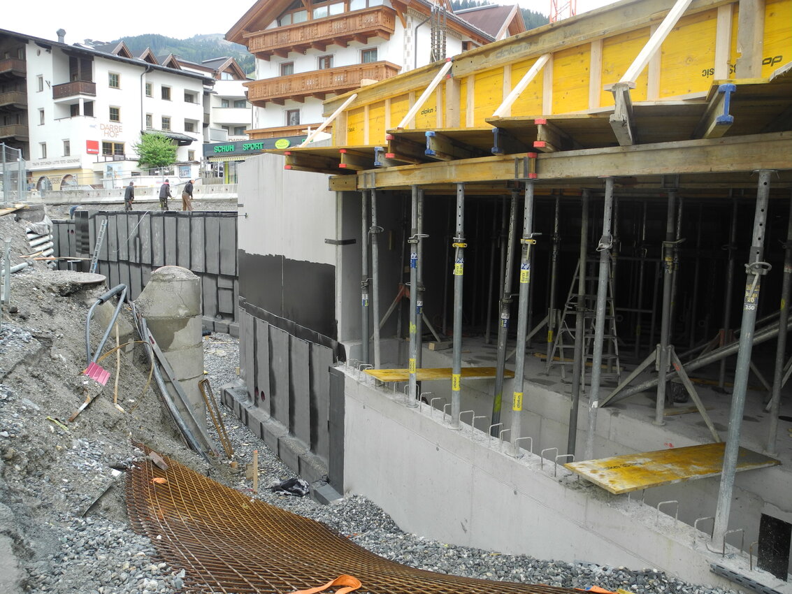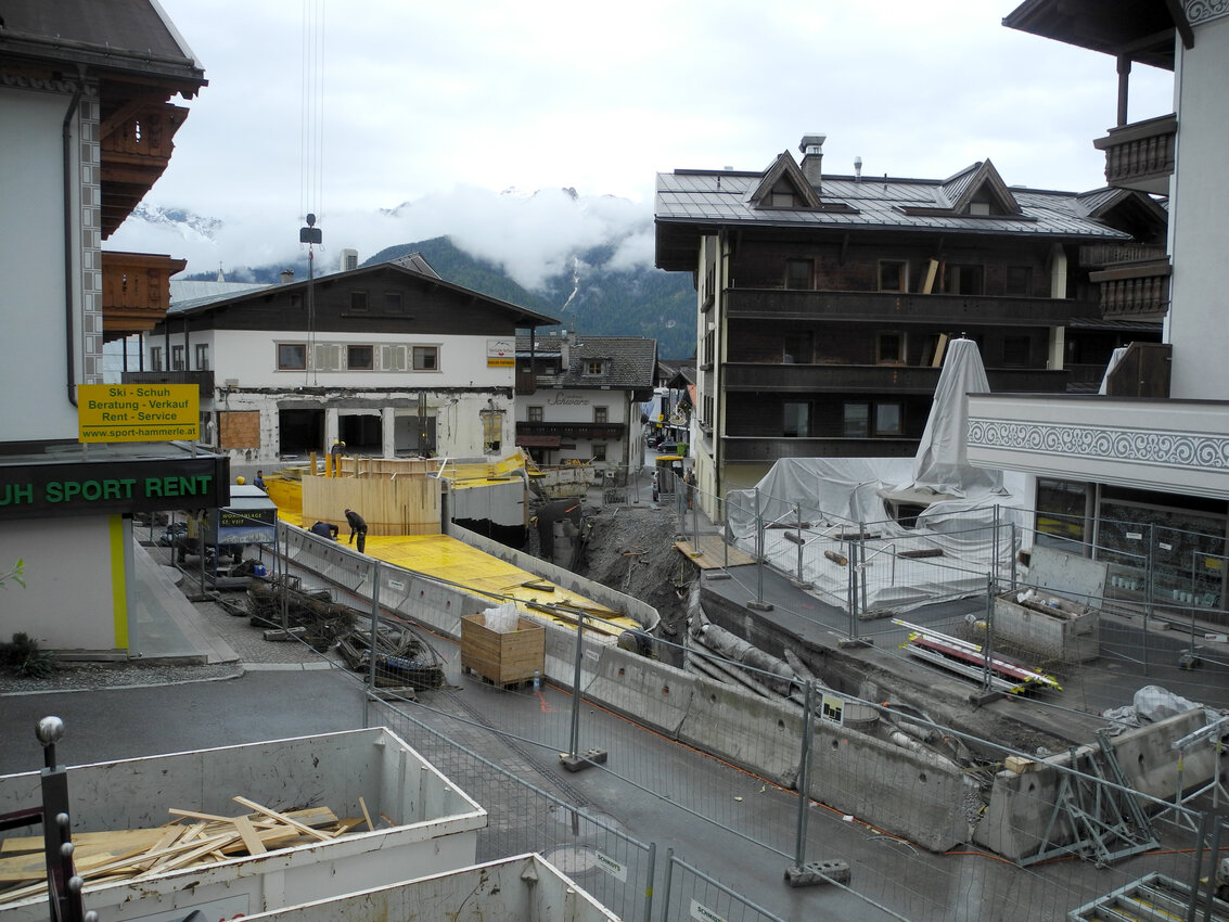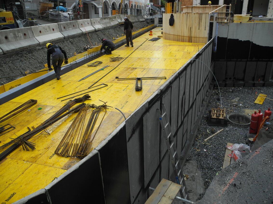 In der Station Zentrum schreiten die Arbeiten ebenfalls sehr zügig voran, sodass aktuell nicht im Zweischichtbetrieb gearbeitet werden muss (dies war ja ursprünglich so geplant). Seit Ende der Wintersaison wurde der gesamte Aushub erledigt, die Bodenplatte betoniert, die Fertigteil-Elementwände aufgestellt und die Decke geschalt. Diese kann demnächst betoniert werden.
