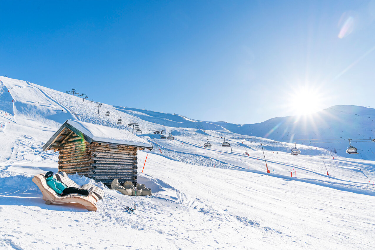 Auch für alle, die zwischendurch eine kleine Pause einlegen möchten, haben wir einen Tipp: Im Skigebiet gibt es an verschiedenen Stellen sogenannte «Wohlfühlstationen». Diese sind mit Liegen, Hängematten und Loungemöbeln ausgestattet und laden dazu ein, die Seele baumeln zu lassen. Hier könnt ihr einen Moment innehalten, die Aussicht genießen und die letzten Sonnenstrahlen des Tages tanken.