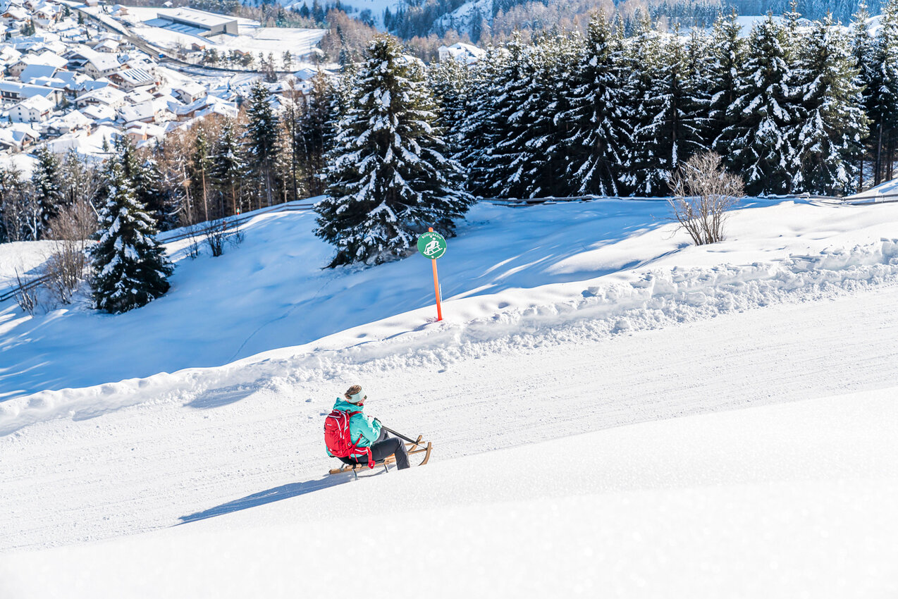 Wer wie wir keine eigene Rodel in den Winterurlaub mitbringt, der kann diese übrigens unkompliziert in den Sportgeschäften an den Talstationen mieten.