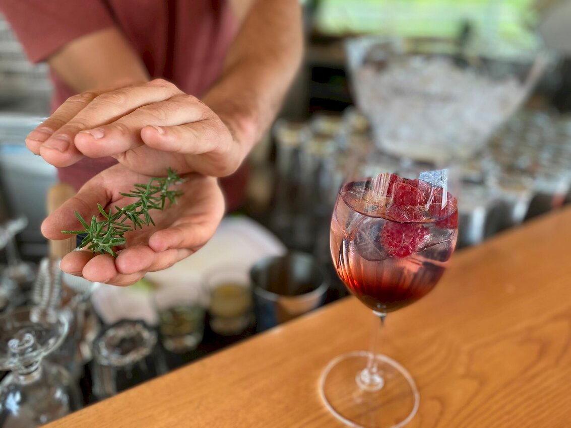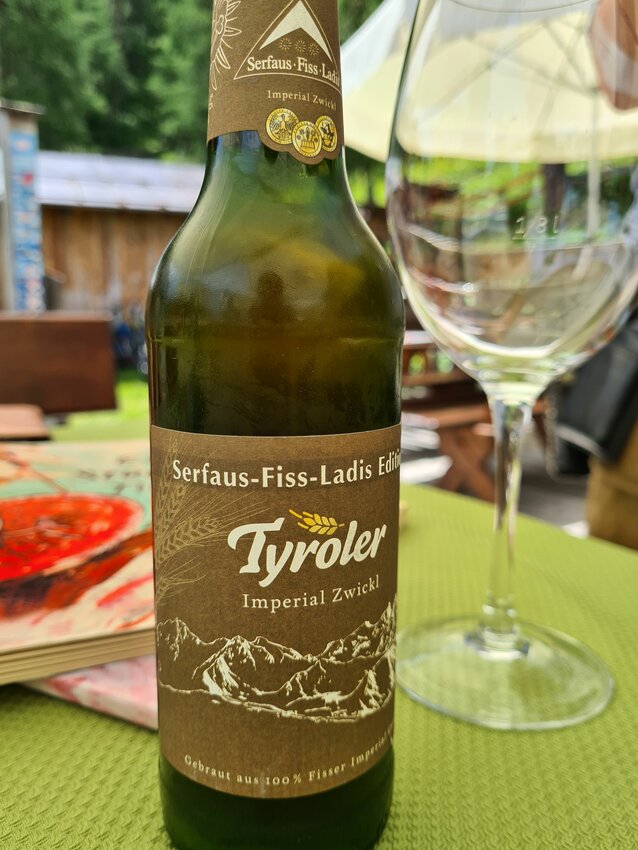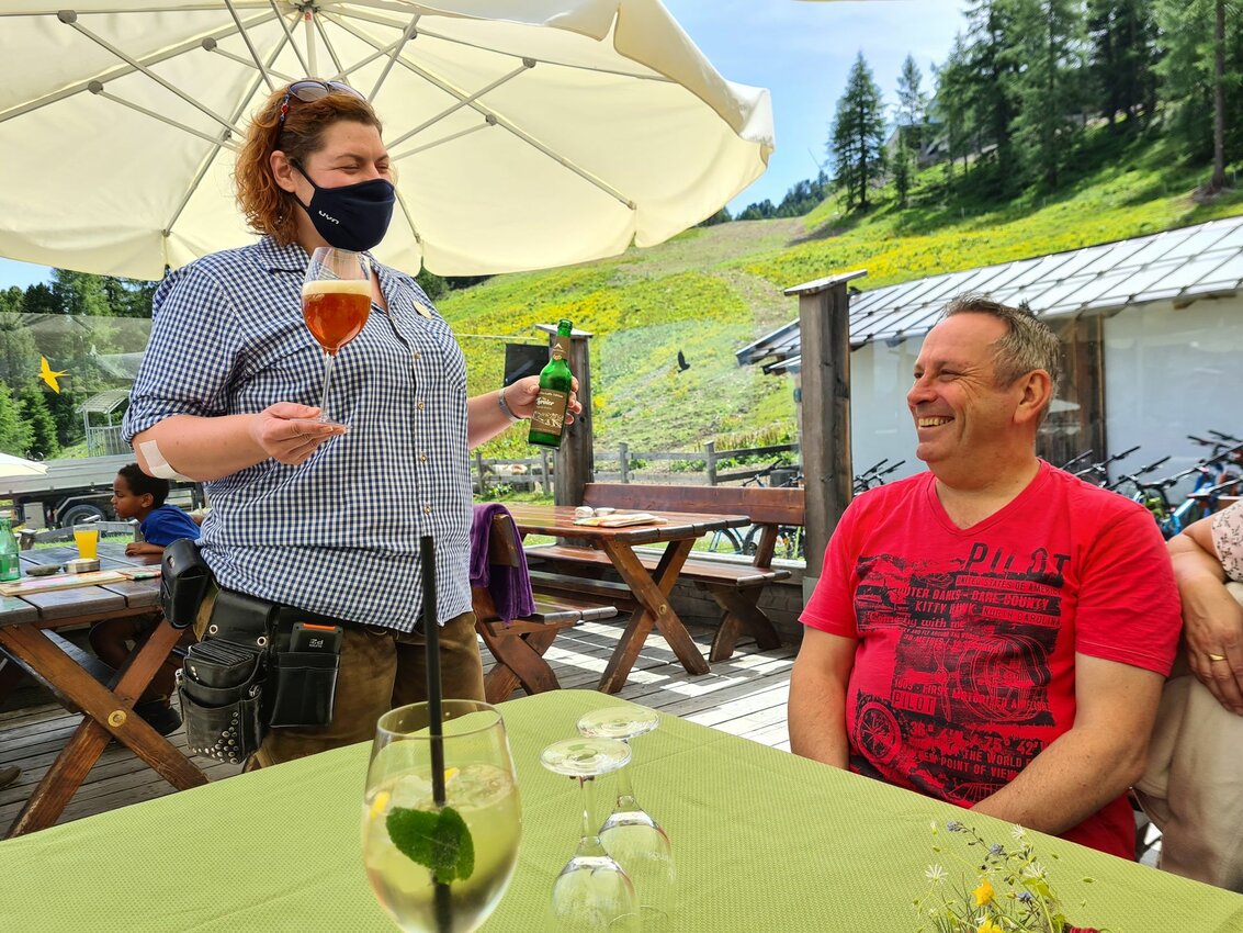 Ich bestelle mir ein Tyroler Imperial Zwickl, gebraut aus der Fisser Imperial Gerste. Was für eine regionale Erfrischung! Schon probiert? Dazu bestellen wir noch eine Flasche Tiroler Sauerbrunn, ein prickelndes Mineralwasser aus Obladis. Direkt vor der Hütte wachsen allerlei Kräuter, die in Topf und auch Hugo-Glas wandern. Womit erfrischst du dich?