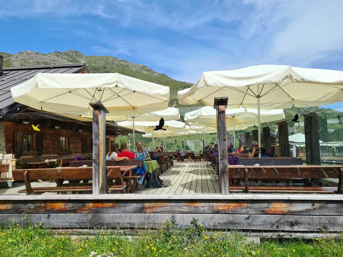 Nach rund zwei Stunden Tiefblicke erreichen wir die Schöngampalm auf 1.878 m. Meine Füße brauchen nun eine Wanderpause und mein Gaumen eine Stärkung bzw. Erfrischung. Unter dem weißen Sonnendach auf der gemütlichen Holzterrasse lassen wir die Wanderung Revue passieren.