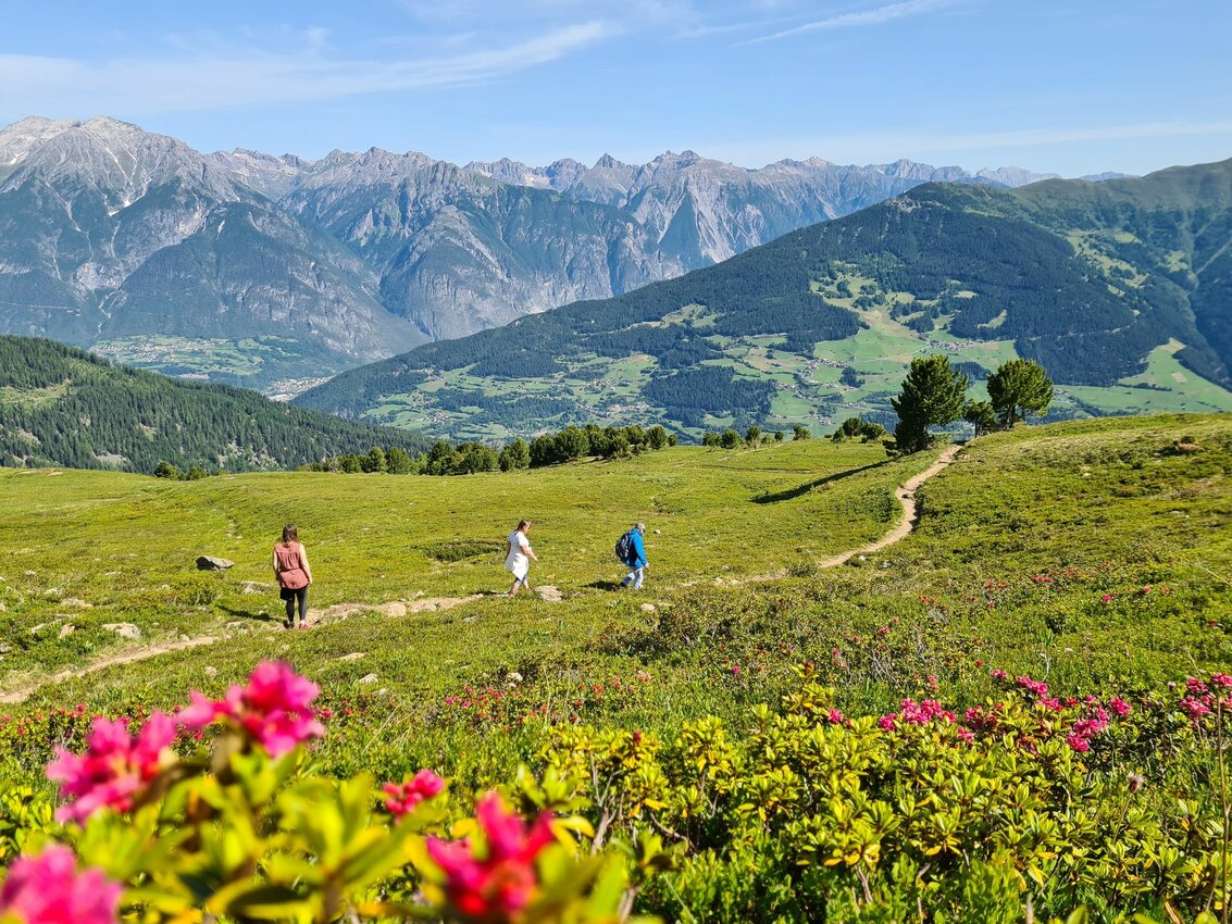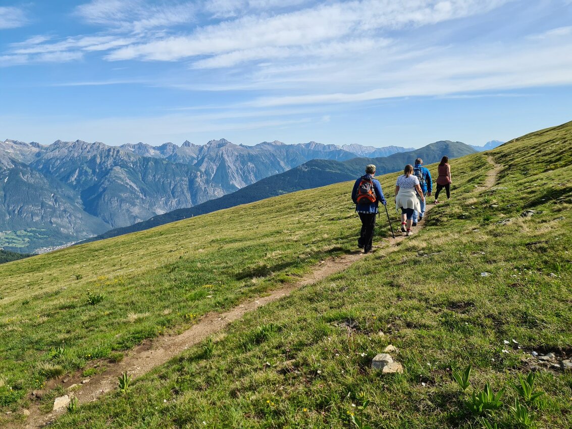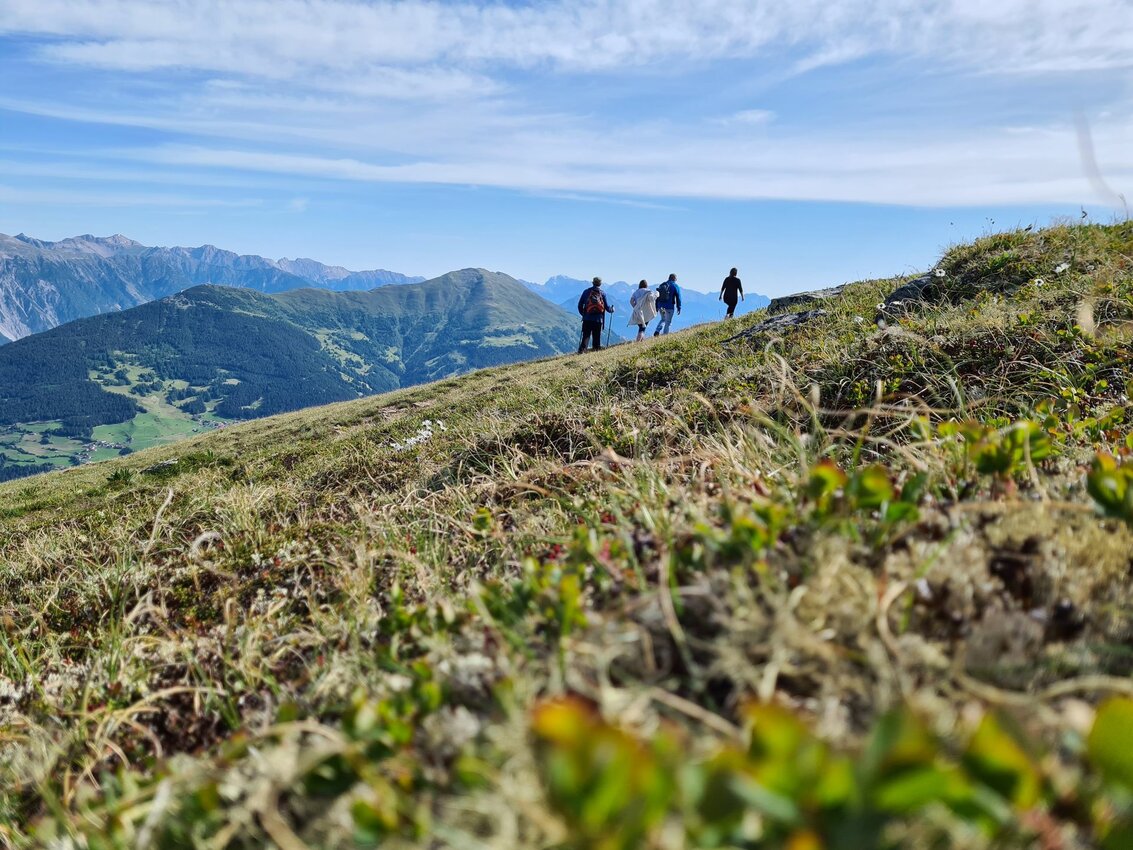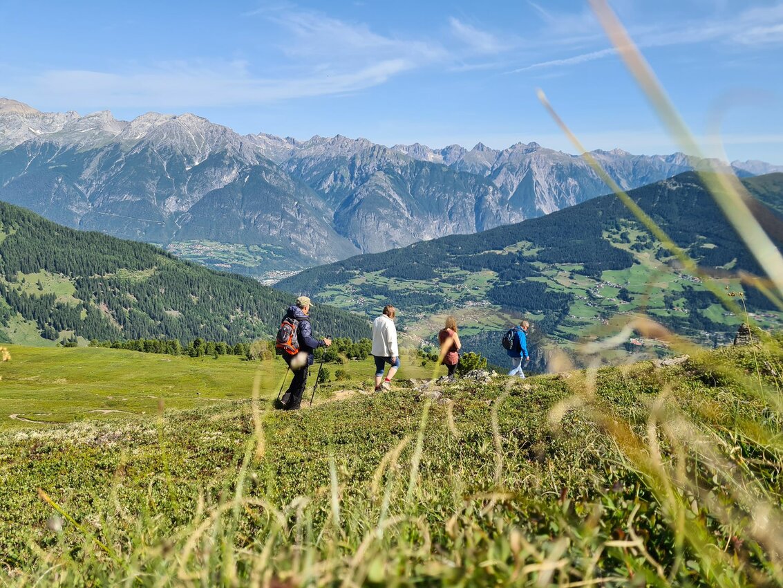 Nachdem die ersten Fernsicht-Schnappschüsse im Kasten sind, erkunden wir nun im Viererpack die Fisser Nordseite. Der mittelschwere Naggalunsteig führt uns verspielt hinunter zur Talstation der Schöngampbahn, an der sich im Winter Wintersportler tummeln, vorbei an der Zirbenhütte zur Schöngampalm. Für die 5-Kilometer-Tour benötigen wir etwa zwei Stunden. Ab der Zirbenhütte führt ein breiter Fahrweg entspannt zu unserem Almziel. Der Steig ist das Ziel: Der schmale steinig-erdige Naggalunsteig bietet neben imposanten Ausblicken auf die Frommes-Speicherteiche und die umliegenden Dörfer im Oberen Gericht auch Fernblicke auf die Zugspitze. Kannst du sie erkennen?