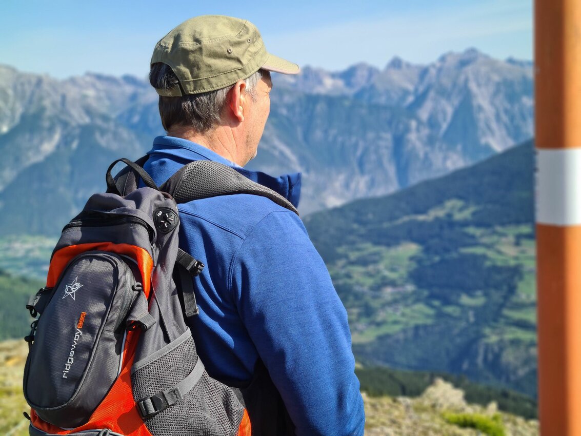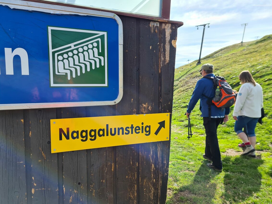 Mit der Schönjochbahn überwinden wir 1.000 Höhenmeter und steigen erwartungsvoll bei der Bergstation auf 2.436 m aus. Es bläst uns bereits ein kühlerer Wind entgegen. Den Bergwind hätten wir schon mal in der Tasche. Den ganzen Sommer hat es am „Joch“ angenehme Temperaturen. Eine Jacke mehr im Rucksack empfiehlt sich also mitzunehmen. Die kühlere Luft sollte aber nicht darüber hinwegtäuschen, dass du keine Sonnencreme benötigst. Die Sonne küsst in Himmelsnähe nämlich besonders intensiv.