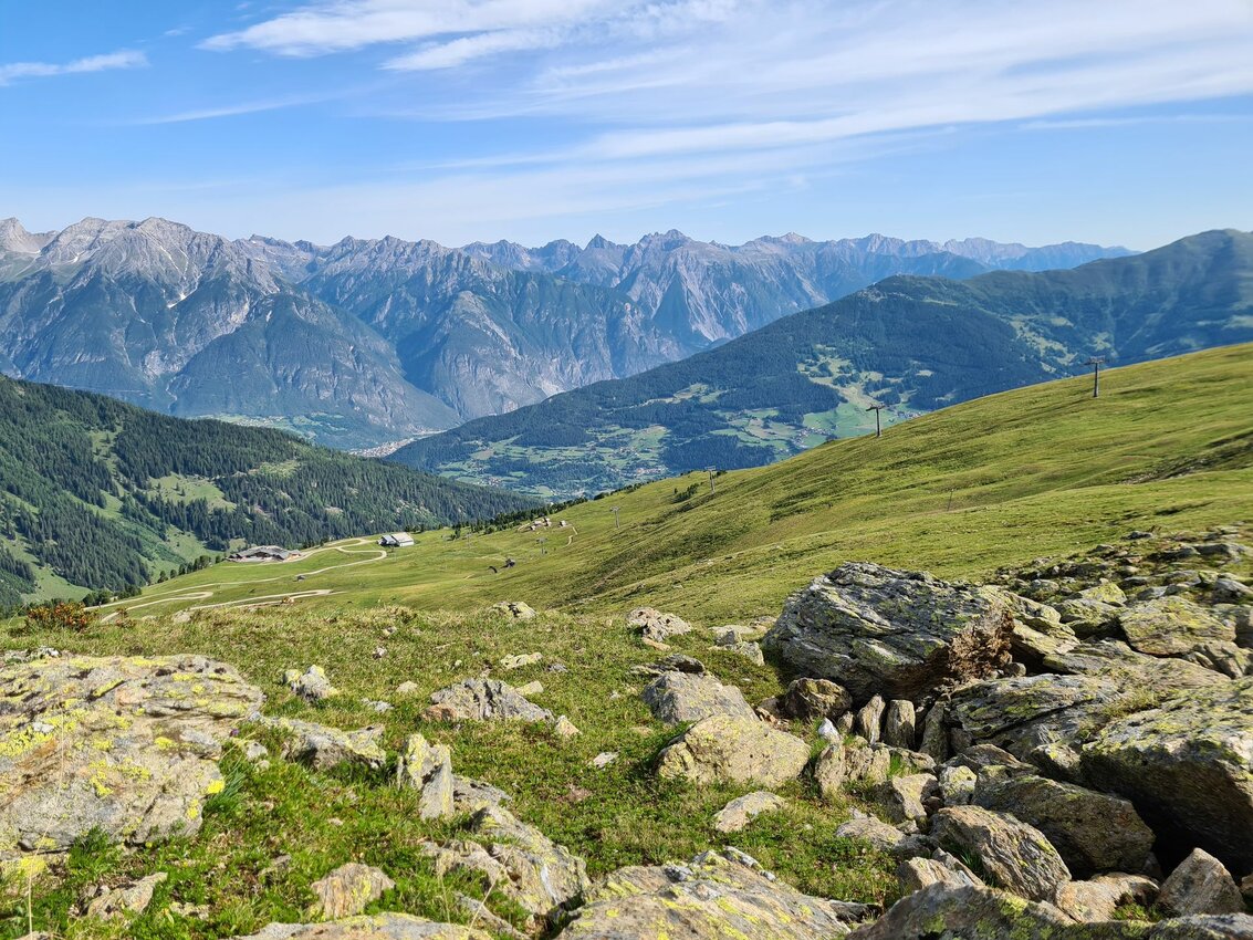 Nach dem erfrischenden Erlebnis im Urgtal treten wir wieder unseren Marsch zurück nach Fiss an. Dazu wandern wir etwa 20 Minuten zur Almbahn, die uns hinauf auf den Zwölferkopf befördert. Dort sehen wir bereits unseren Ausgangspunkt, der sich zu unseren Füßen befindet: die Bergstation der Schönjochbahn.