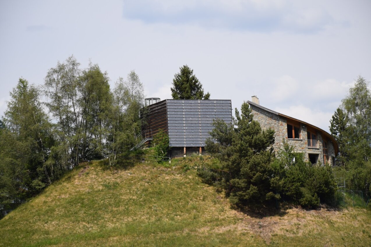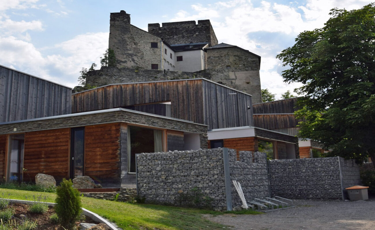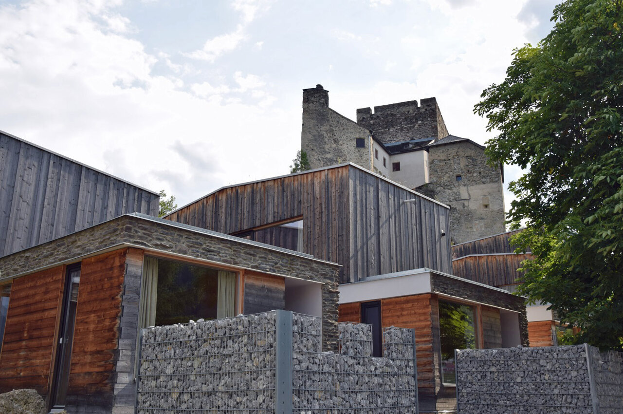 In enger Zusammenarbeit mit Denkmalamt und Naturschutz entwickelte ein Architektenteam ein Designer-Bauwerk in zeitgenössischer Architektur. Das Baukonzept wurde exakt auf diesen konkreten Ort abgestimmt und sollte dabei den Stallungen der Burg nachempfunden sein. Dabei wurden vor allem ortstypische, heimische und natürliche Materialen verwendet. Als ich dieses Bauwerk das erste Mal sah, war ich davon nicht sehr begeistert. Jedoch nach einem Gespräch mit dem Bauherrn ging bei mir sozusagen „ein Licht auf“ und in der Zwischenzeit finde ich es total gelungen und passend.
