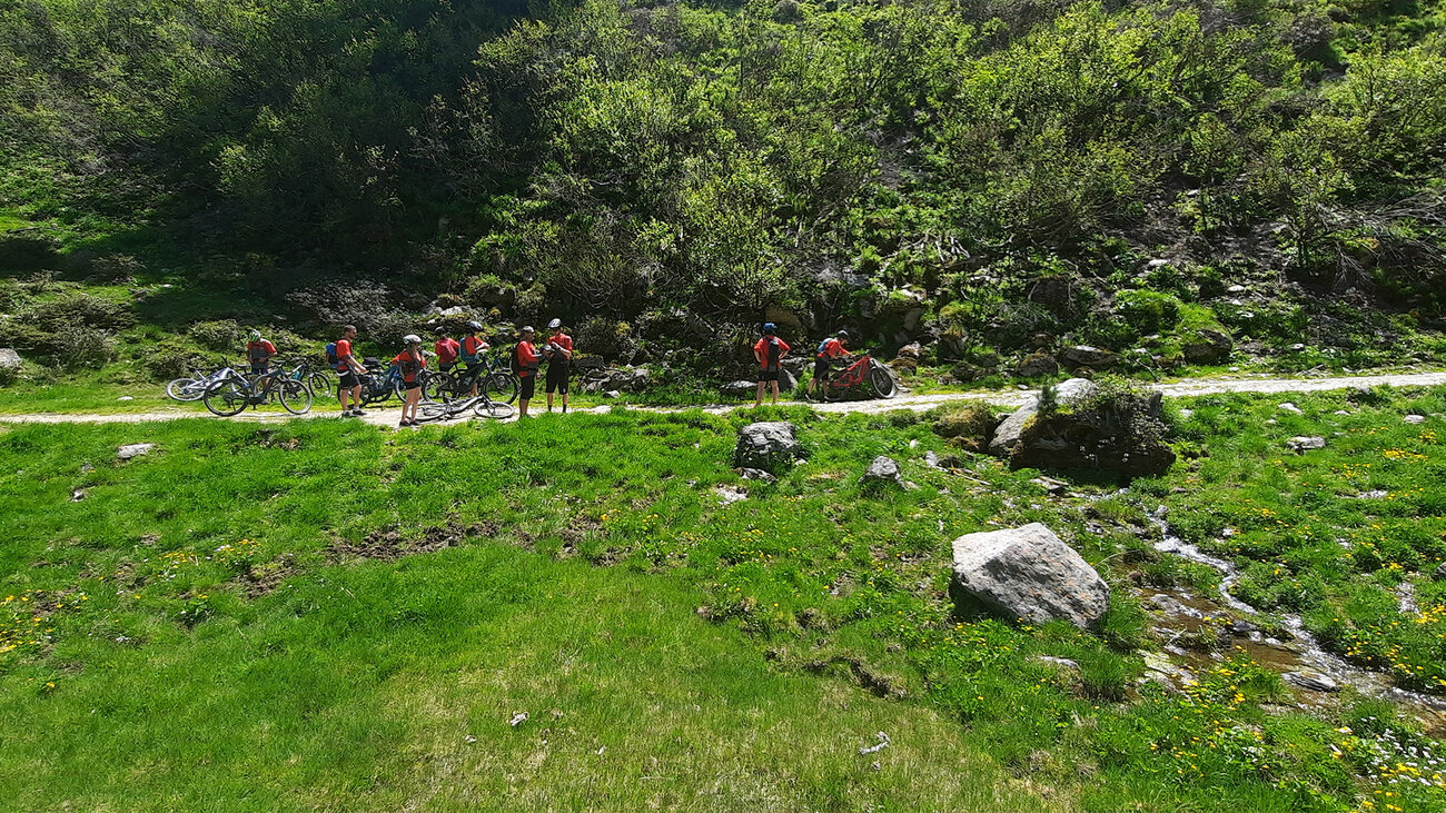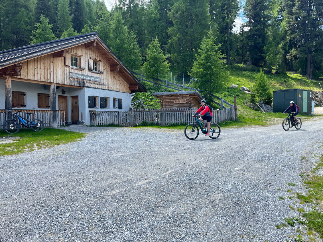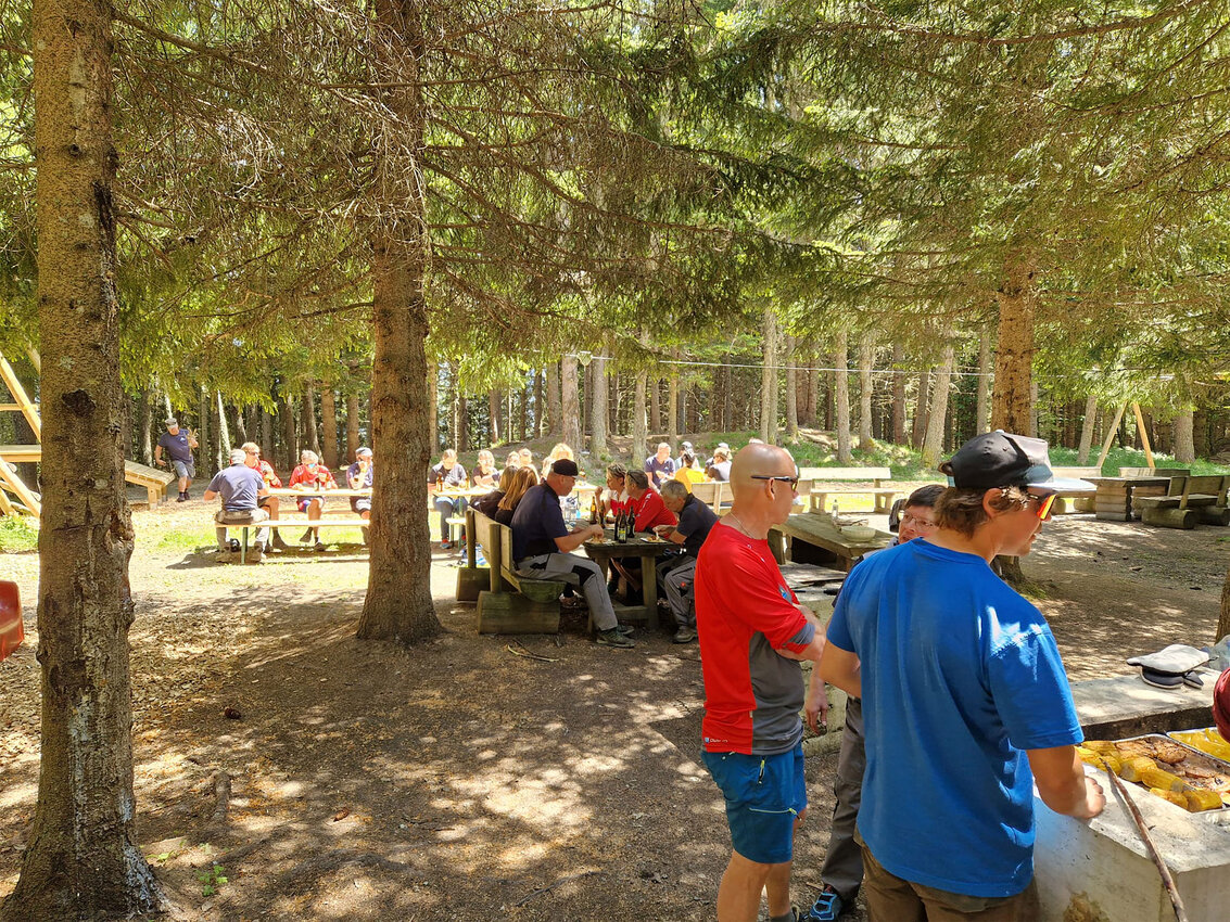 Die größte Hürde hatten wir nun geschafft und rauschten mit dem Fahrtwind im Gesicht talwärts. Nach einer Weile erreichte uns der verlockende Duft von gebratenen Würsteln, der unsere Vorfreude auf eine köstliche Stärkung noch mehr ankurbelte. Am ruhigen Grillplatz in Rabuschl wurden wir bereits von unseren geschätzten Kollegen erwartet. Mit großer Herzlichkeit und Freude verwöhnten sie uns mit leckeren Grillspeisen und erfrischenden Getränken. Es war eine wahrhaft genussvolle Zusammenkunft, bei der wir uns von der Anstrengung der Fahrt erholen und die Gemeinschaft mit unseren Kollegen in vollen Zügen genießen konnten. Voller Energie brachen wir Richtung Ziel der Etappe auf. Vom Rabuschl aus folgten wir dem breiten Weg in Richtung Serfaus.