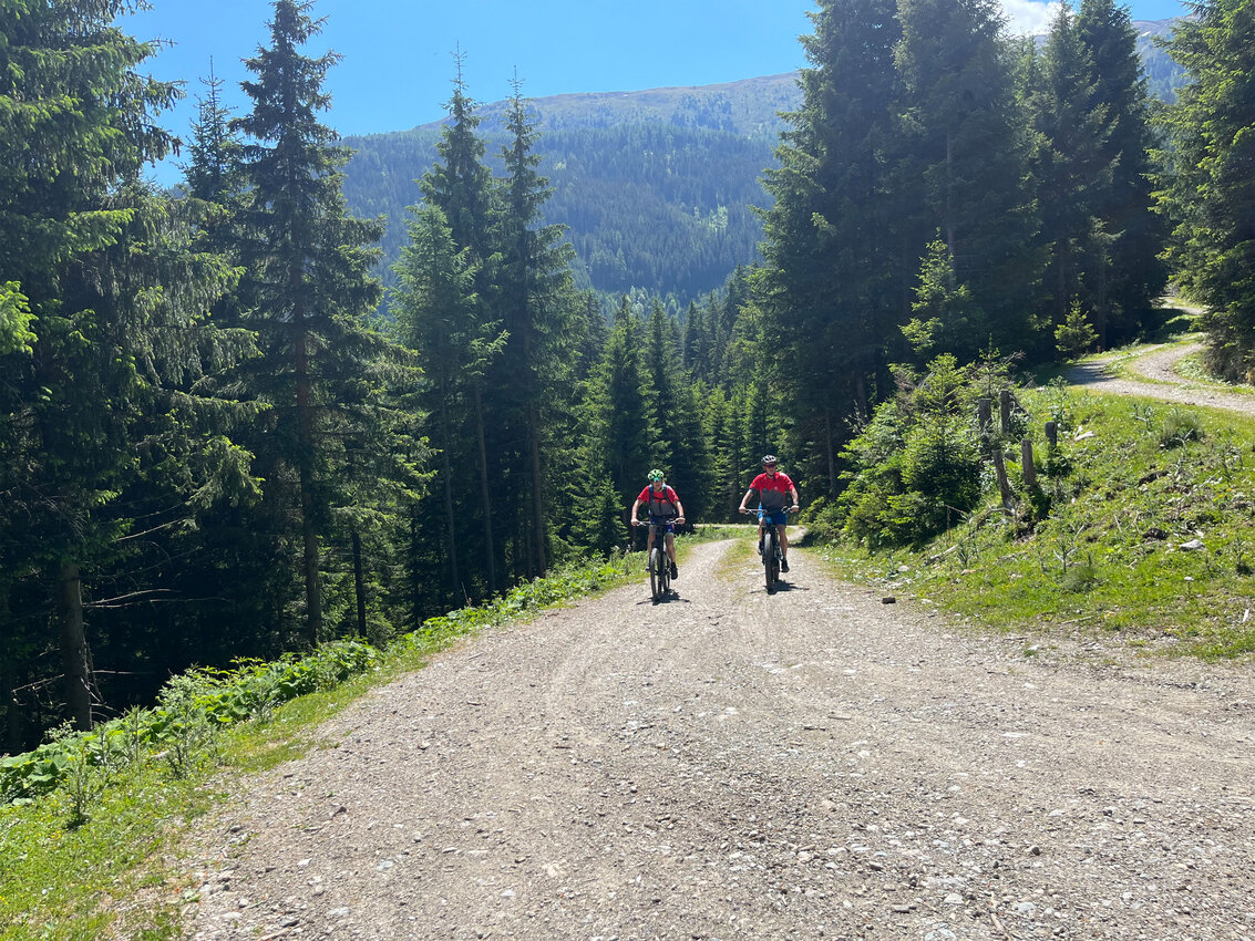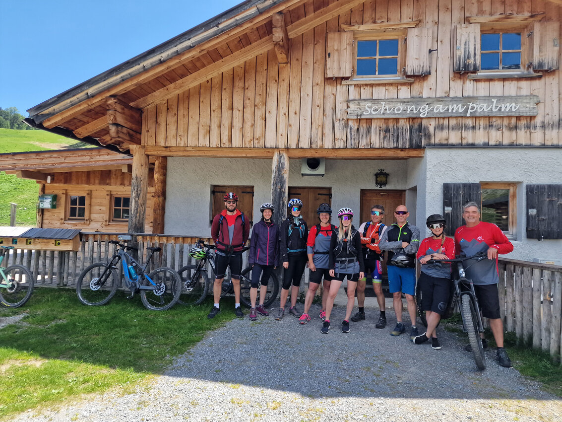 Nach der kurzen, rasanten Abfahrt überquerten wir den Inn. Für einen Moment konnten wir tief Luft holen, denn jetzt stand uns die eigentliche Herausforderung bevor. Ein steiler Anstieg von 1.000 Höhenmetern erwartete uns auf dem Weg bis zur Schöngampalm. Der breite Fahrradweg schlängelte sich inmitten der grünen Wälder bergaufwärts. Während wir uns auf unserem Weg nach oben kämpften und uns eine Stärkung gönnten, wurden wir immer wieder mit grandiosen Panoramen belohnt.