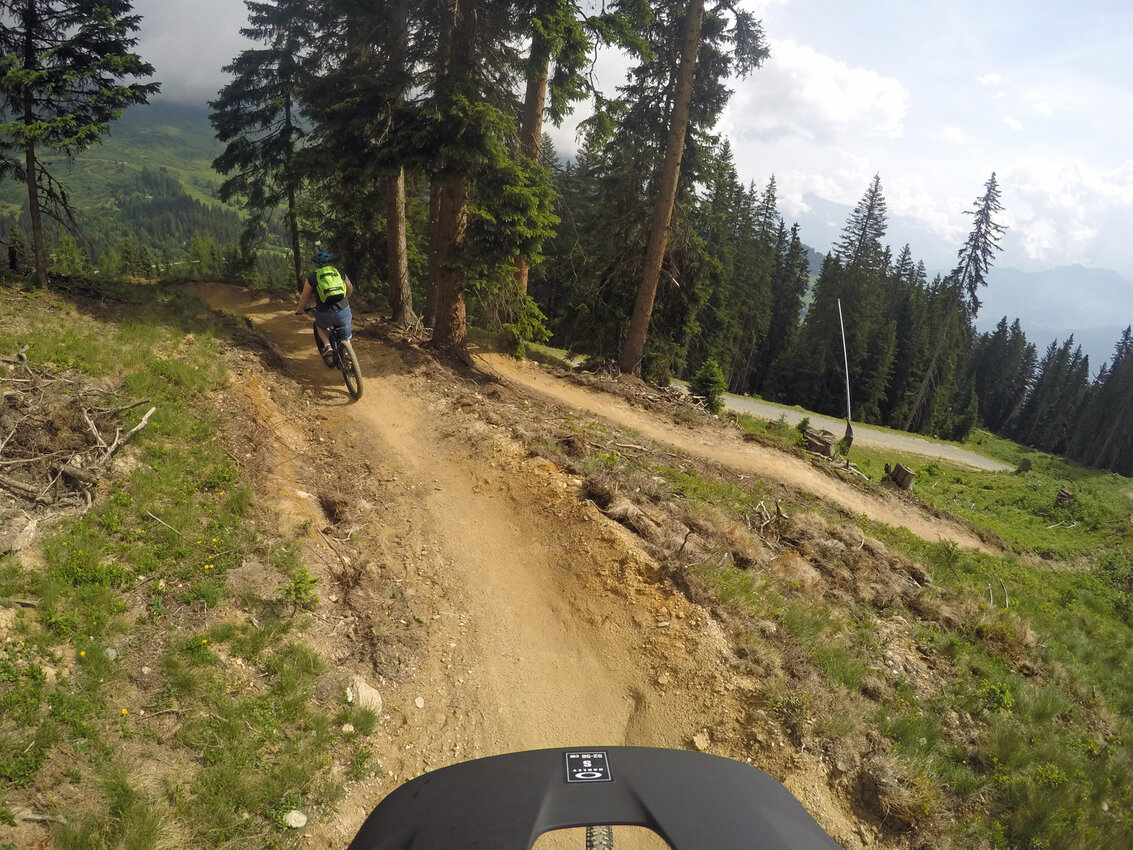 • Nicht mit dem Lenker stark lenken. Verwende deinen Körper. Drehe den Kopf immer mit, damit du den Trailverlauf gut siehst.