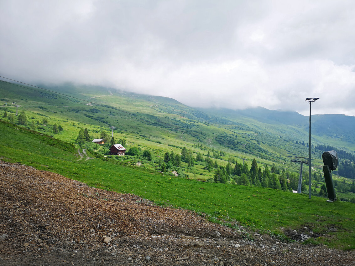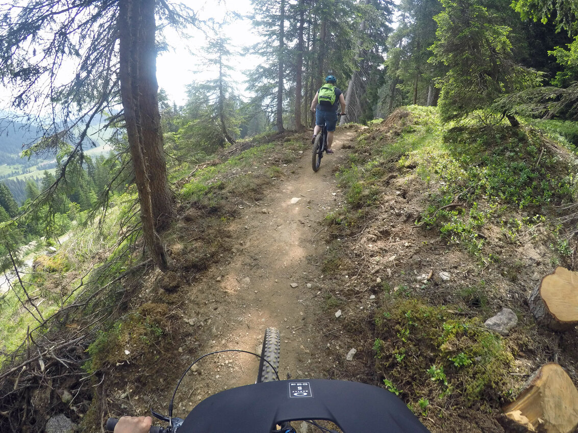 Der blaue Högtrail kann entweder im Anschluss des grünen Alpkopftrails bezwungen werden oder die Alpkopfbahn befördert Biker bis zur Zwischenstation, an der sich der Traileinstieg befindet. Raus aus der Bahn, rechts abbiegen und los geht’s!