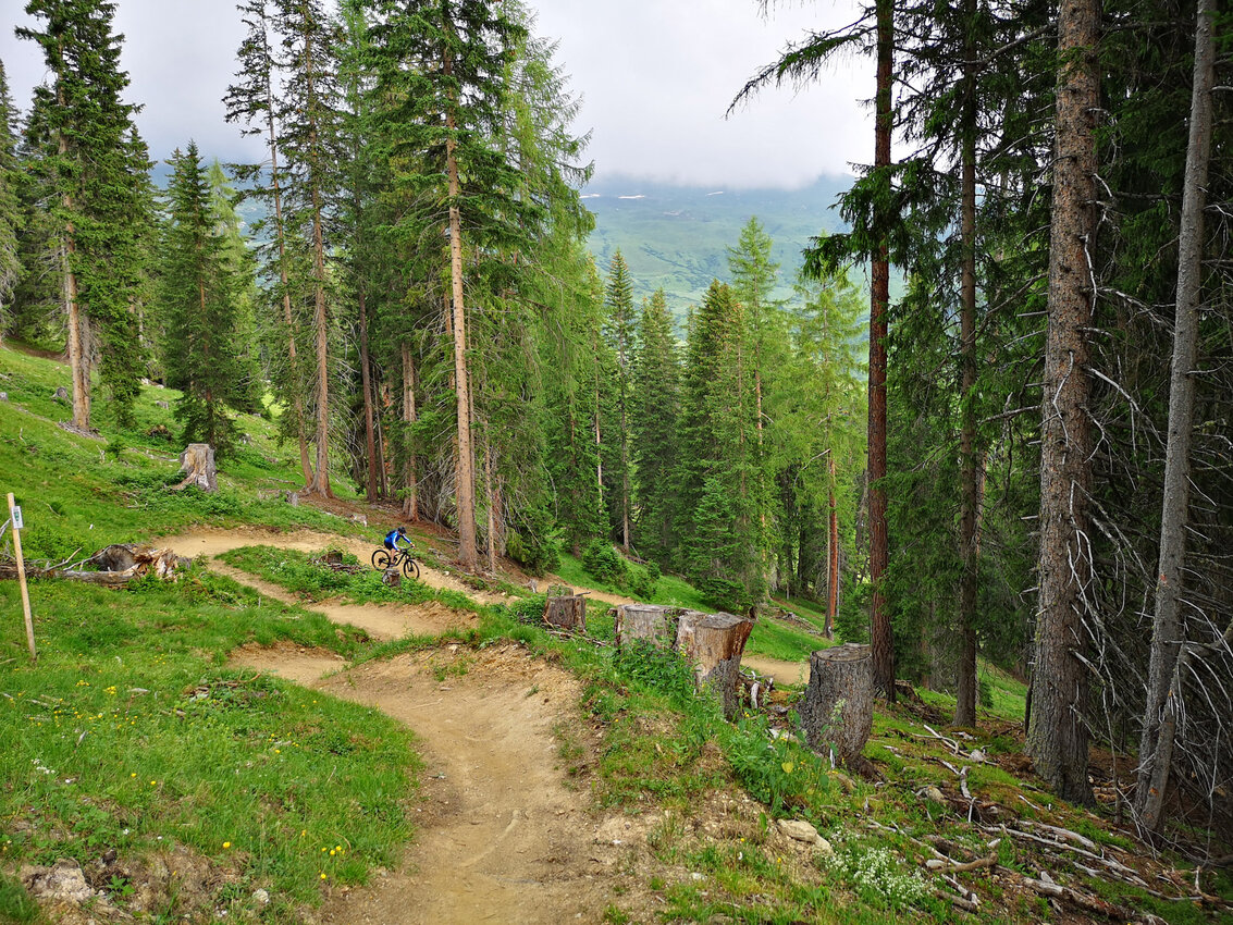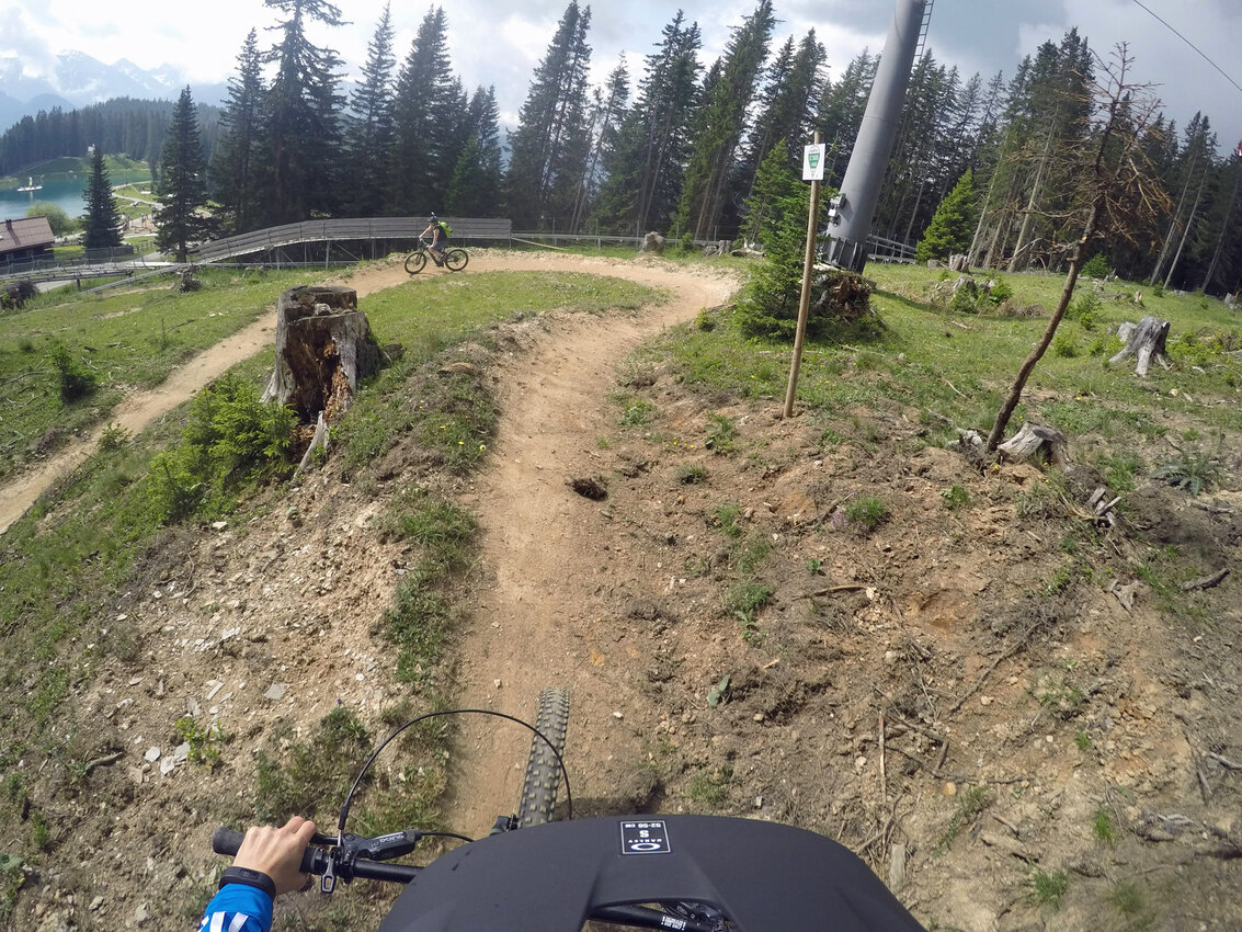 Dieser Singletrail ist der leichteste von allen sieben in Serfaus-Fiss-Ladis und ein perfekter Einsteiger-Trail, um erste MTB-Erfahrung zu sammeln. Dass das aber nicht bedeutet, dass er weniger Spaß bereitet, zeigte unsere Testfahrt. Zum „grünen“ Singletrail gelangen Biker mit der Alpkopfbahn. Oben angekommen, startet der Trail bereits gleich rechts vom Ausstieg. Sanft führt der 2,6 km lange Trail durch subalpines Gelände den Berg hinab bis zum Erlebnispark Hög. Im zweiten Abschnitt überrascht er dann mit spielerischen Eigenschaften. Perfekt zum Üben und Kennenlernen. Über den geschlängelten Trailabschnitt erreichen Zweiradkünstler dann den Högsee – das Ende des grünen Trails. Tipp: Das Restaurant Seealm Hög an der Zwischenstation der Alpkopfbahn ist perfekt für eine kulinarische Einkehr. Zudem können die angestrengten Wadeln in den erfrischenden Högsee gesteckt werden. Herrlich!
