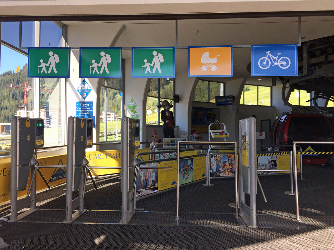 Der Einstieg in die Gondel ist stressfrei. An den Gondelbahnen, die Bikes transportieren können (alle Sommerbahnen außer Möseralmbahn), gibt es separate Bike-Eingänge. Das jeweilige Ticket einfach an den Sensor halten und rechts das Bike durchschieben. Ein Kinderspiel!