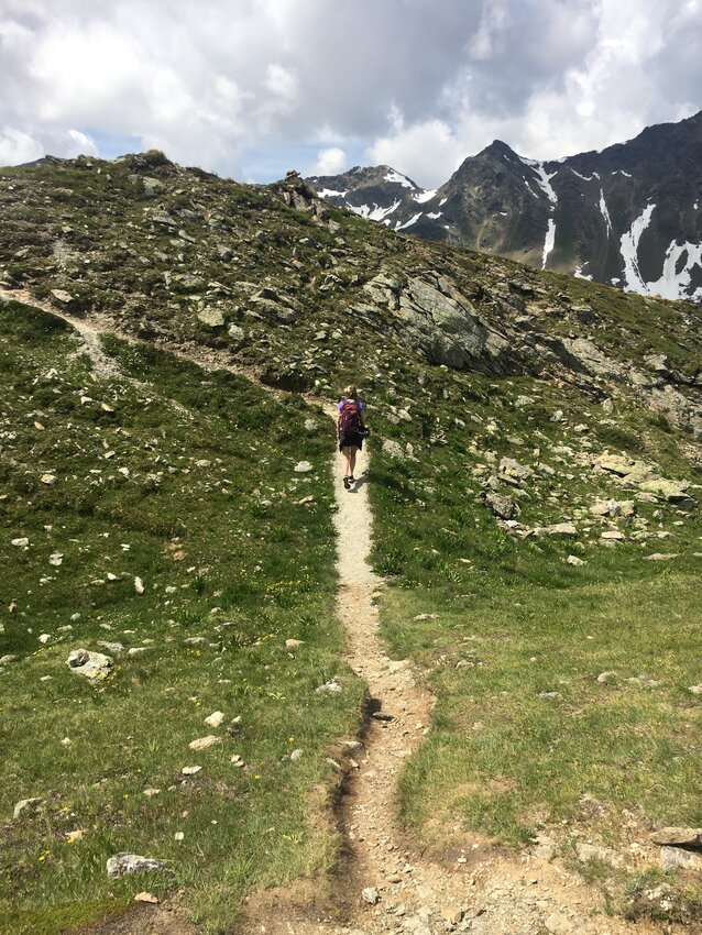 Zeitig in der Früh ging es für uns mit der Schönjochbahn bei traumhaftem Wetter hinauf aufs Fisser Joch. Dort erwartete uns bereits eine atemberaubende Aussicht auf die umliegende Bergwelt. Nachdem wir diesen besonderen Moment mit einem Foto festgehalten hatten, machten wir uns auf den Weg. Zunächst führte uns der neu angelegte „Goldene-Mann-Weg“ hinauf zur Aussichtsplattform Z1. Entlang des Themenweges gilt es, zahlreiche Rätsel rund um die Sage des Goldenen Mannes zu lösen, der dort einst, gemeinsam mit fiesen Gnomen, hauste. Nach etwa einer Stunde Gehzeit, wurden wir zum Abschluss noch vom Goldenen Mann persönlich empfangen.