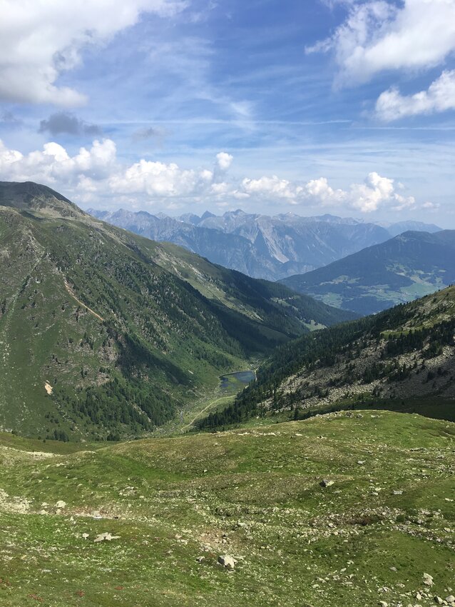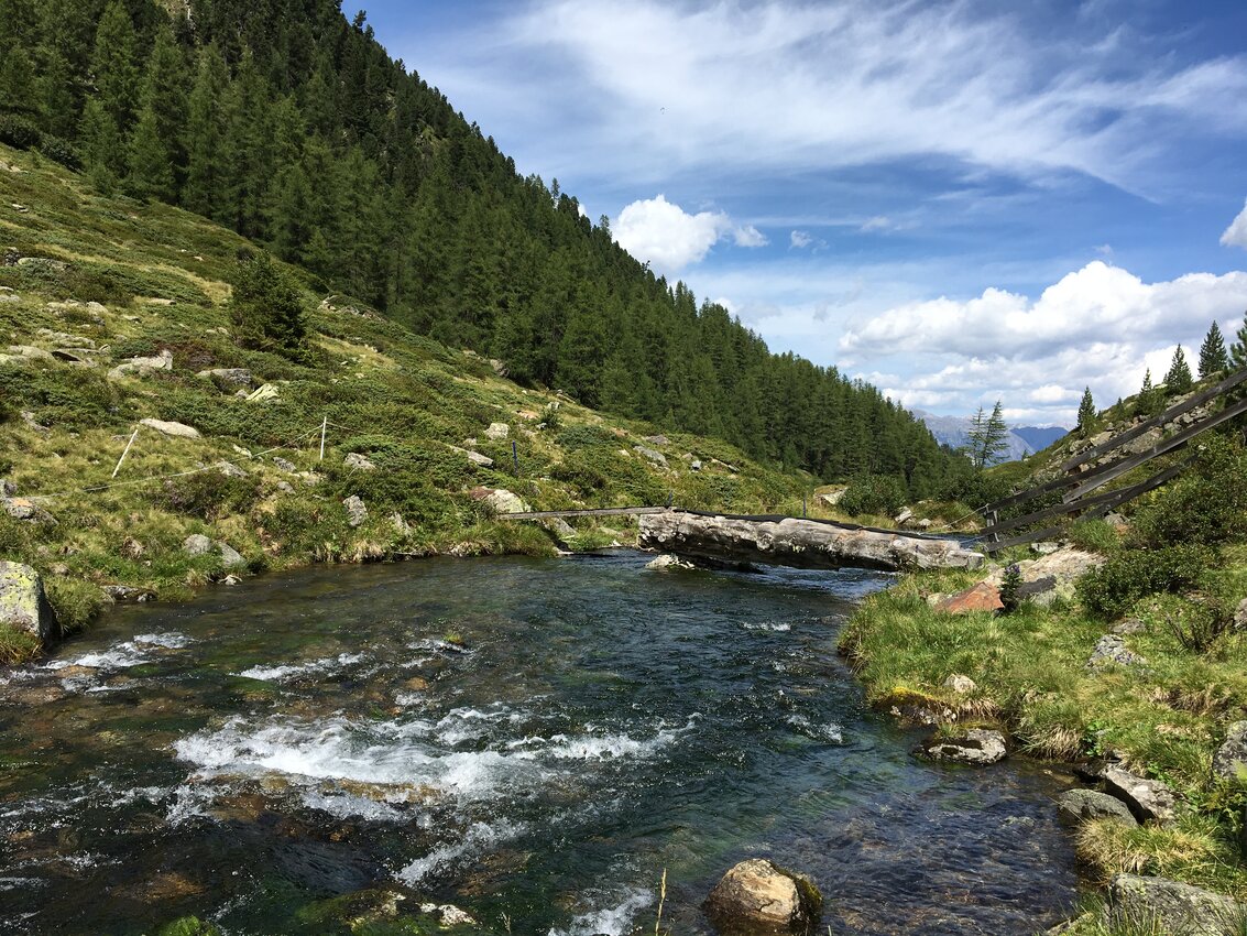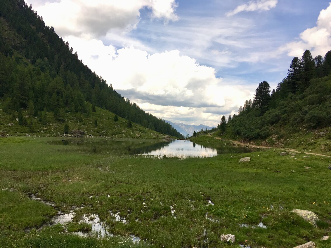 Der Ausblick, der sich uns dabei bot, war wirklich traumhaft schön. Idyllisch führte der Weg durch das saftige Grün der Bergwiesen, vorbei an zahlreichen blühenden Almrosen und anderen schönen Blumen. Da der Weg hauptsächlich neben dem Urgbach verlief, begleitete das sanfte Plätschern unsere Schritte. Aufgrund der sommerlichen Temperaturen, war das kühle Nass eine willkommene Abkühlung für uns. Nachdem rund eine weitere Stunden Wanderzeit verging, gelangten wir zum Eingang des Tales, wo der Urgbach in einen kleinen See mündet. Der Platz neben diesem Natursee, mit Blick auf das Seitental, lädt definitiv zum Verweilen ein. Da uns jedoch noch einiges bevorstand, gönnten wir uns lediglich eine kurze Verschnaufpause.