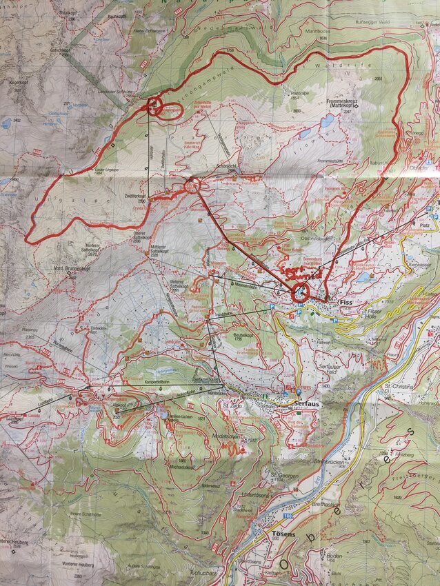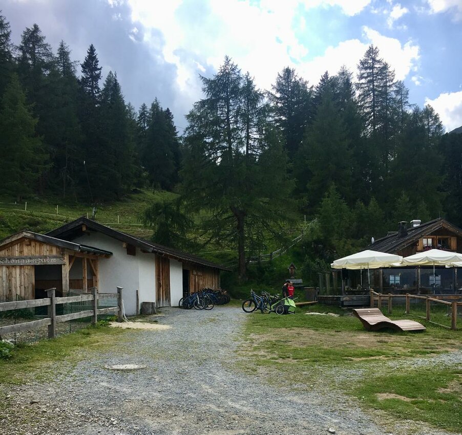 Gestärkt machten wir uns anschließend auf zum Bikeverleih, welcher sich direkt neben der Alm befindet. Die freundlichen Mitarbeiter Daniel und Matti statteten uns mit modernen und bestens gewarteten Mountainbikes aus und passten diese fachkundig an unsere Körpergröße an. Und sogleich schwangen wir uns auf unsere Bikes und radelten motiviert und voller Vorfreude los in Richtung Fiss. Zunächst folgten wir dem Schotterweg in Richtung Talstation der Almbahn. Ein breiter Forstweg führte uns anschließend durch sanfte Wälder. Ab diesem Zeitpunkt konnten wir das Rad größtenteils laufen lassen und mussten nur wenige Male in die Pedale treten. Wir ließen uns den Fahrtwind um die Nase wehen und hatten sichtlich Spaß am Radvergnügen.