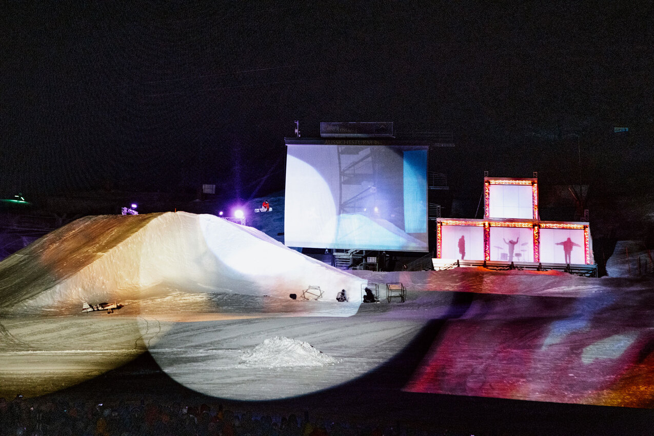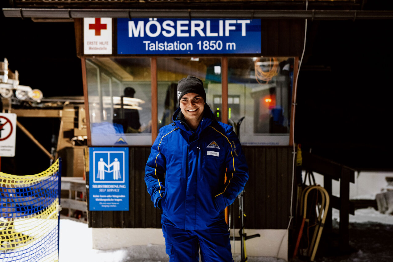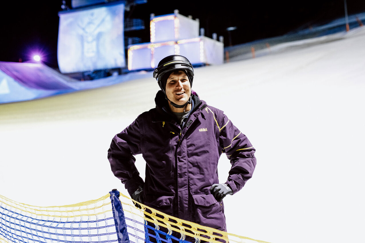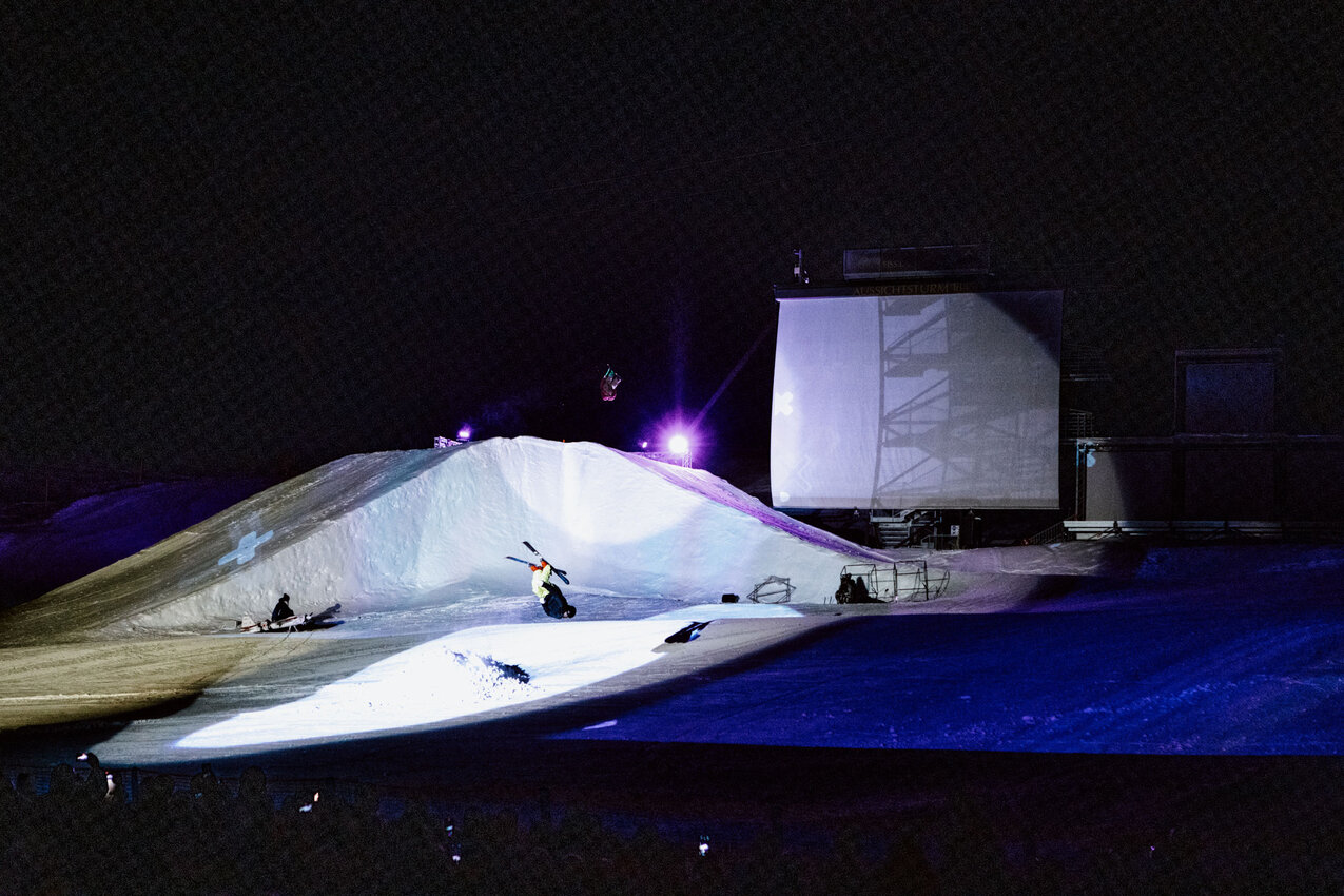 Viele Leute, das ist tatsächlich ein Stichwort: Denn nicht nur auf den Zuschauerrängen und am Platz vor der Möseralm herrscht großer Andrang, auch auf der Piste sind viele Menschen unterwegs: “Bis zu 170, 180 Personen sind jedes Mal dabei“, erzählt Daniel stolz. Dass die Teilnehmer mit Begeisterung dabei sind, spürt man. „Es hat wahrscheinlich noch fast keinen Nightflow ohne mich gegeben“, sagt Goffi Gram. Er ist in der Region für die Snowparks zuständig und baut als Shaper mit seinem Team anspruchsvolle Kicker. Beim Nightflow in Fiss und auch bei der Skishow Adventure Night in Serfaus ist er wöchentlich mit seinem Profiteam dabei und zeigt auf der Schanze die wildesten Tricks. „Ich mag die Shows, weil ich mit meinen Freunden unterwegs sein kann. Und wenn die Bedingungen vom Schnee her gegen Ende der Saison schwieriger werden, macht das für mich den Reiz aus.“ Ganz ungefährlich ist der Einsatz der Freeskier-Truppe nicht, ab und zu passiere es, dass ein Sprung im Sturz ende, erzählt Goffi und startet mit seinem Team los, um sich aufzuwärmen.