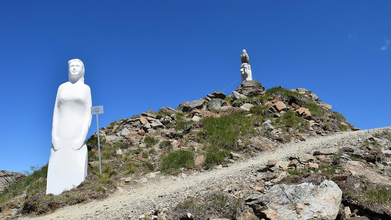 Also mache ich mich gemeinsam mit meinem kleinen Sohn auf den Weg um das neue Angebot am Fisser Schönjoch zu testen. Gestartet wird das Abenteuer mit der Schönjochnbahn bis zur Bergstation Schönjoch. Schon von der Gondel aus kann man die ersten Kunstwerke und den Einstieg bzw. das Ende des Weges sehen. Meine Empfehlung ist allerdings nicht direkt bei der Schönjochbahn den Weg zu starten, sondern zuerst am Fahrweg in Richtung Schöngampbahn zu gehen.