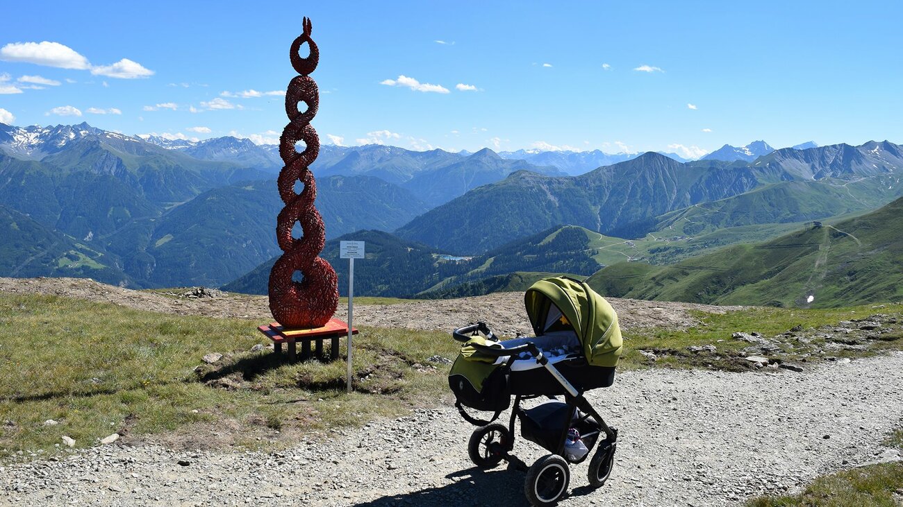 Mit dem Kinderwagen auf dem Kunstweg am Schönjoch Fiss