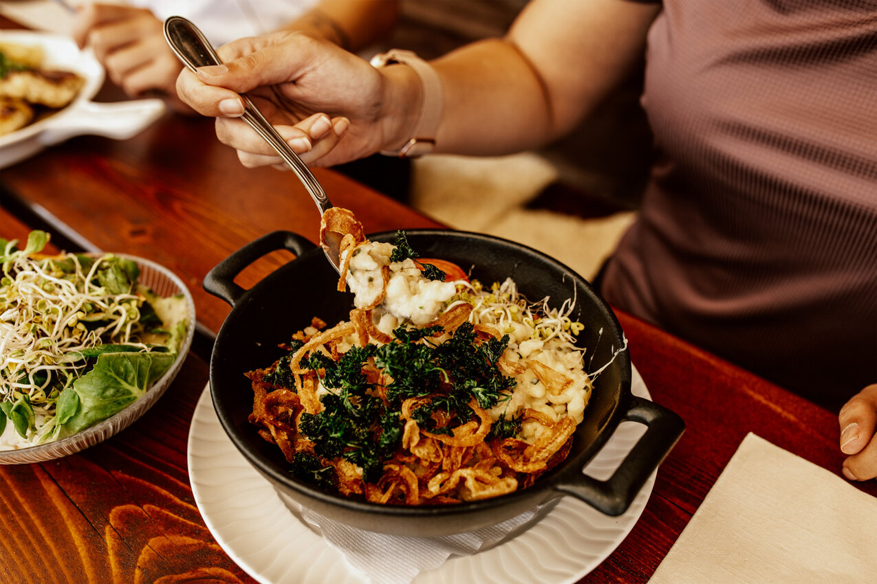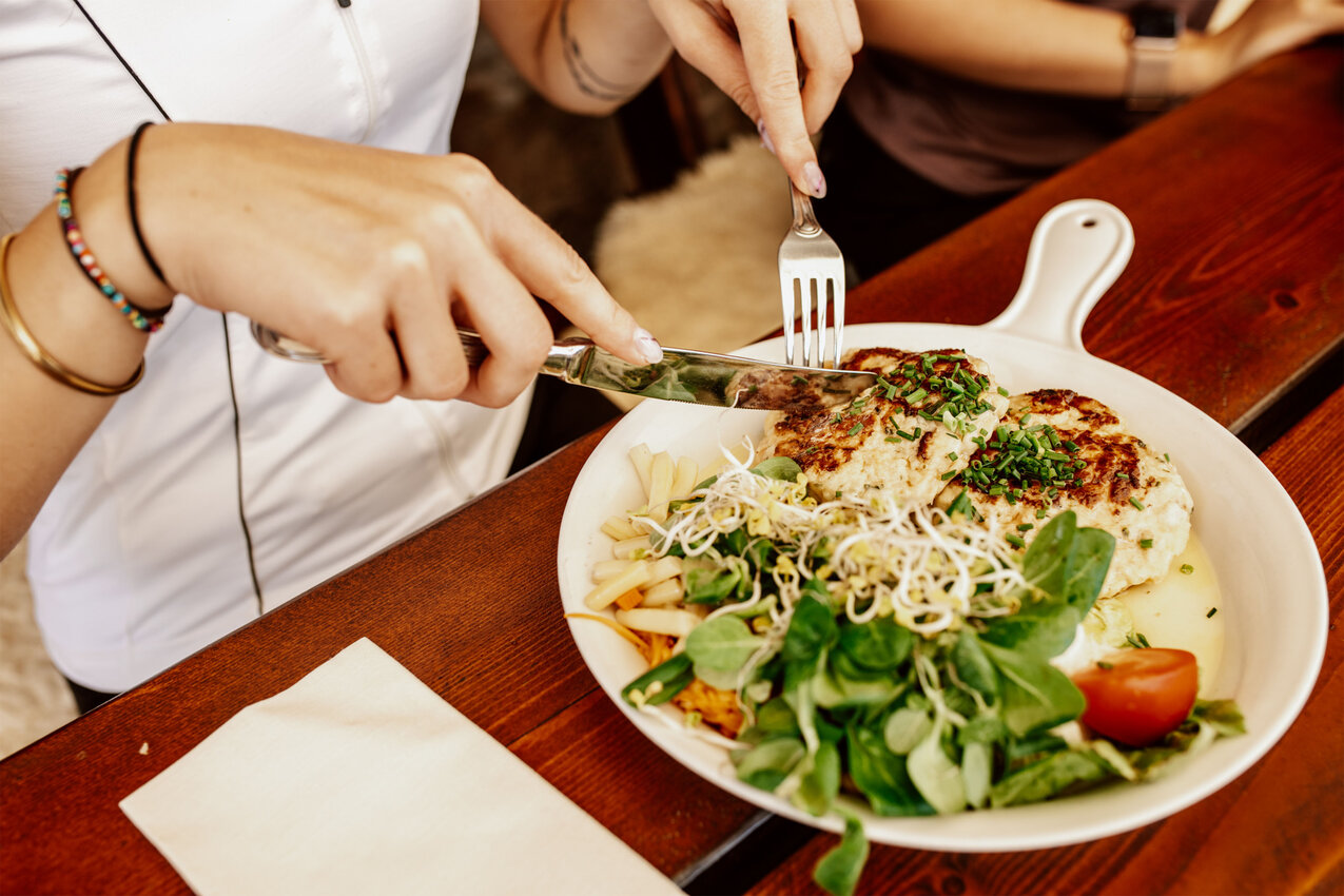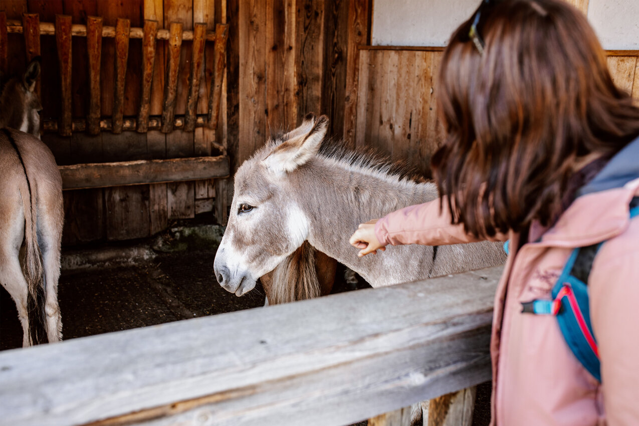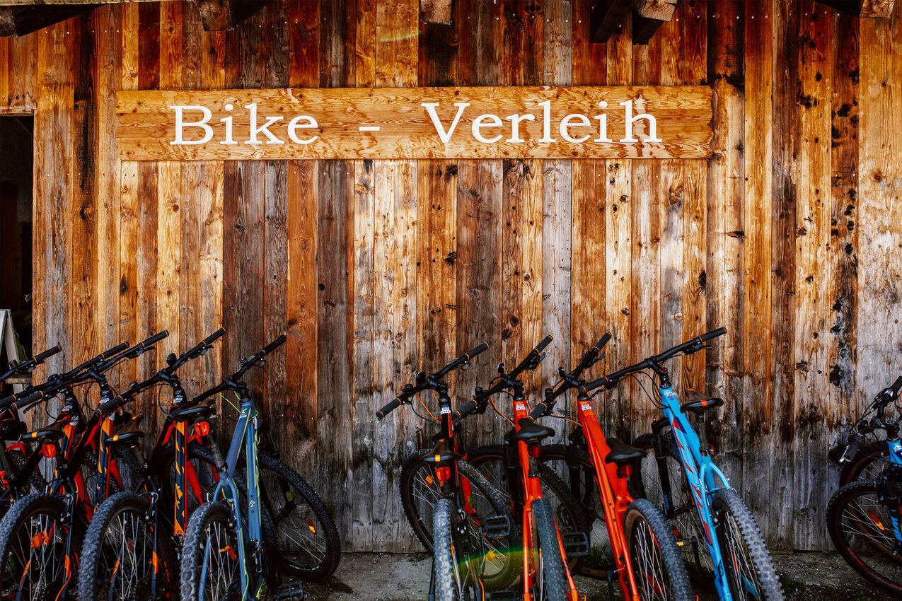 Um die Mittagszeit meldet sich dann der Hunger. Zeit, zur Schöngampalm zu fahren. Wir fahren an Bäumen und Farnen vorbei zurück auf die Hauptroute und meistern die letzten zwei Kurven bis zur Schöngampalm. Hier können Biker nicht nur ihre E-Bikes laden, es gibt sogar einen Bikeverleih: „Dann können sich Wanderer für den Rückweg ein Bike schnappen“, weiß Yara. Seit letztem Jahr ist auch der Spielplatz vor der Alm gewachsen. Neben Wasserspielstation wartet jetzt auch ein großer Holztraktor mit Anhänger zum Klettern und Rutschen. Und natürlich freuen sich auch die Esel und Shetlandponys über einen Besuch.