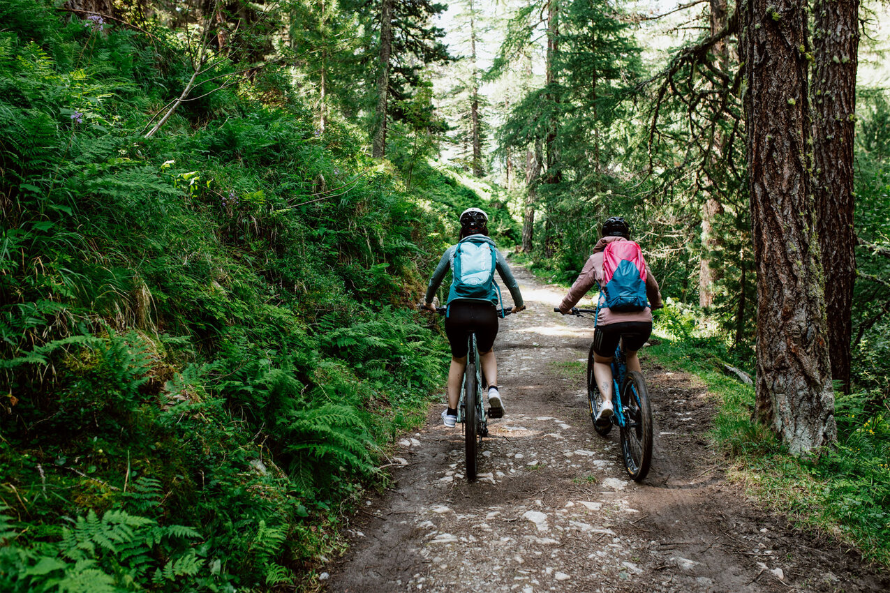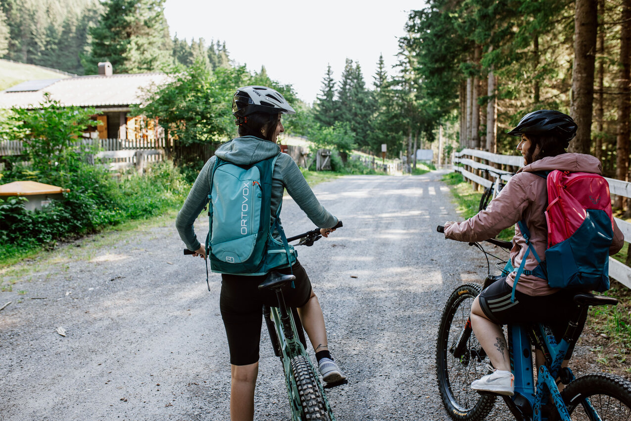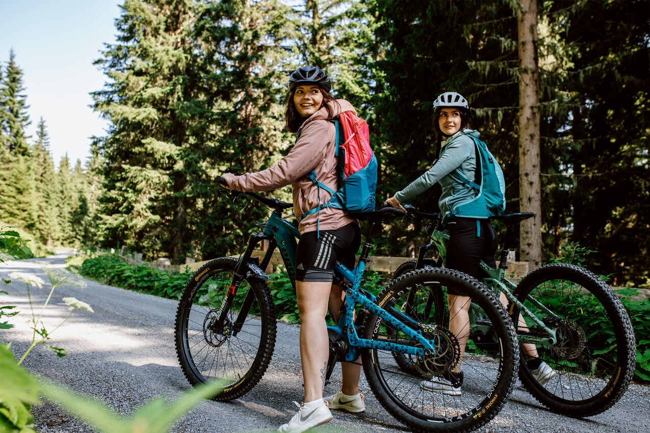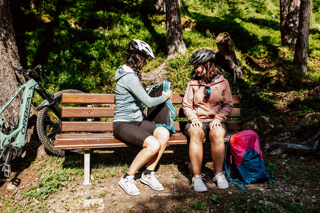 Die Strecke ins Urgtal auf der Fisser Nordseite ist mit dem E-Bike ganz leicht machbar. Der Weg zum Urgsee ist bis auf das letzte, kurze Stück (dazu später mehr) eine breite Forststraße. „Ich mag diese Tour, weil sie für alle machbar ist – Kinder, Omas und Opas, Große und Kleine“, sagt Yara Marktl, die uns heute begleitet. Gemeinsam mit ihrer Freundin Nadine ist die Serfauserin oft in der Region unterwegs und unser heutiges Ziel, der Urgsee, zählt definitiv zu den Favoriten der beiden Bikerinnen. „Ich war im letzten Sommer mindestens zehn Mal am See. Es ist der perfekte Spot für ein Picknick oder um ganz einfach die Natur zu genießen“, schwärmt Nadine. Wir sind gespannt!