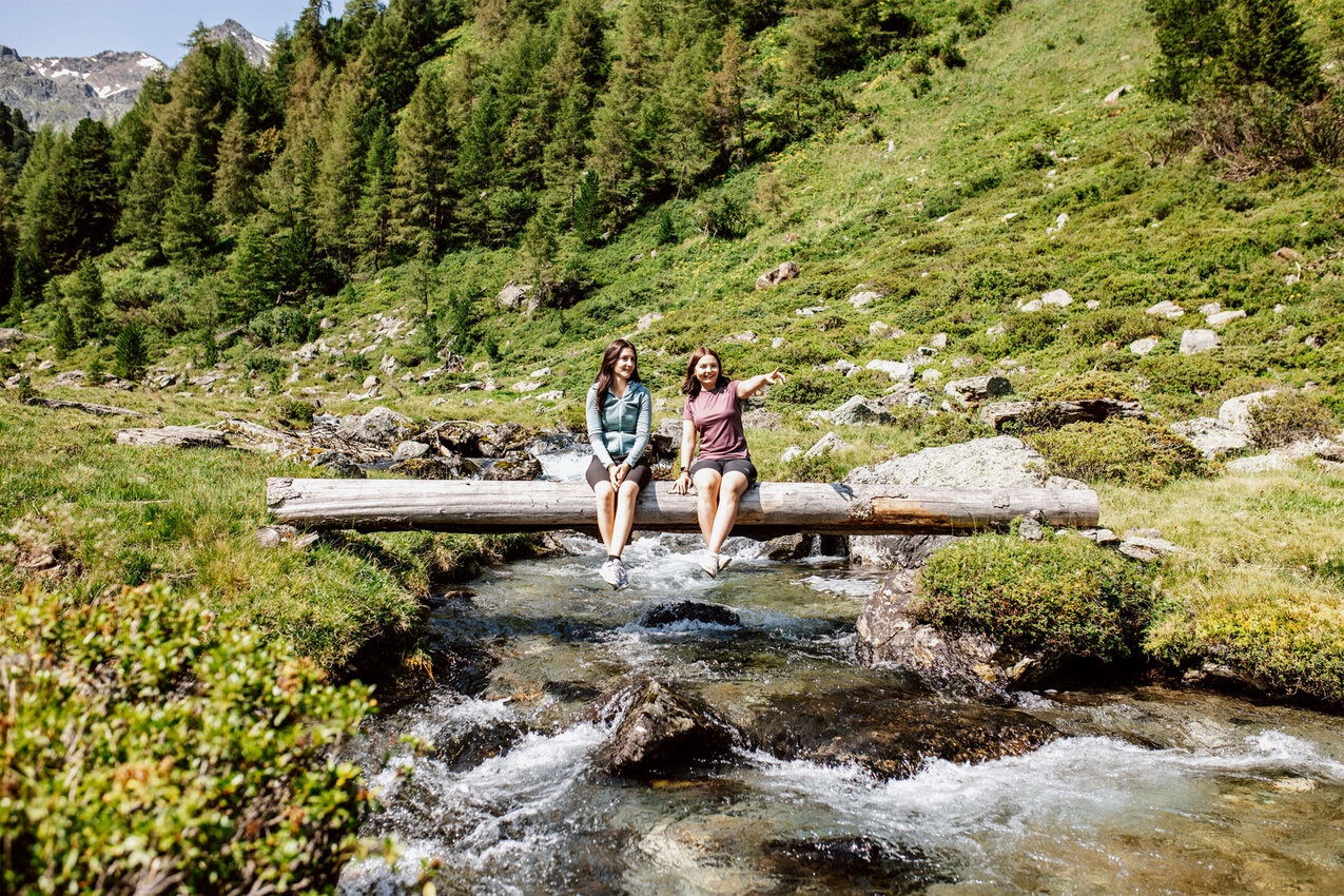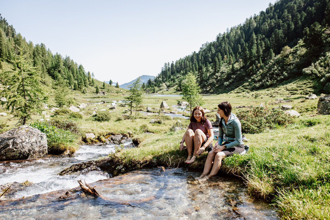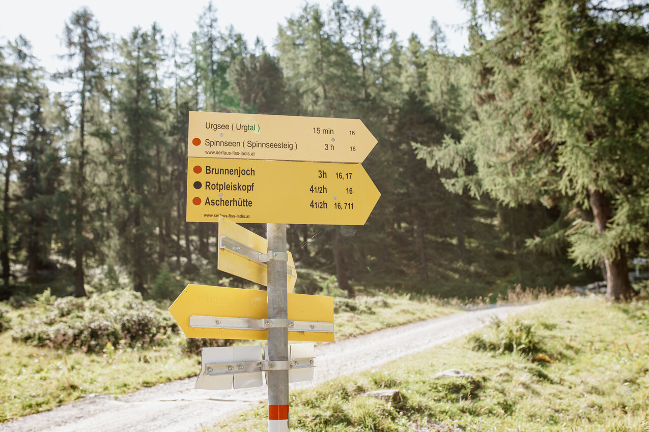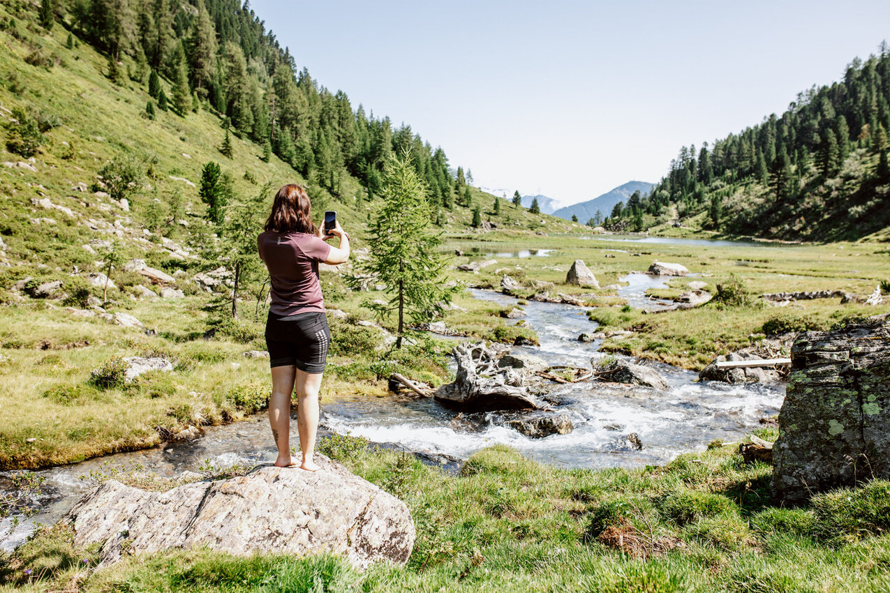 Die Strecke ins Urgtal auf der Fisser Nordseite ist mit dem E-Bike ganz leicht machbar. Der Weg zum Urgsee ist bis auf das letzte, kurze Stück (dazu später mehr) eine breite Forststraße. „Ich mag diese Tour, weil sie für alle machbar ist – Kinder, Omas und Opas, Große und Kleine“, sagt Yara Marktl, die uns heute begleitet. Gemeinsam mit ihrer Freundin Nadine ist die Serfauserin oft in der Region unterwegs und unser heutiges Ziel, der Urgsee, zählt definitiv zu den Favoriten der beiden Bikerinnen. „Ich war im letzten Sommer mindestens zehn Mal am See. Es ist der perfekte Spot für ein Picknick oder um ganz einfach die Natur zu genießen“, schwärmt Nadine. Wir sind gespannt!