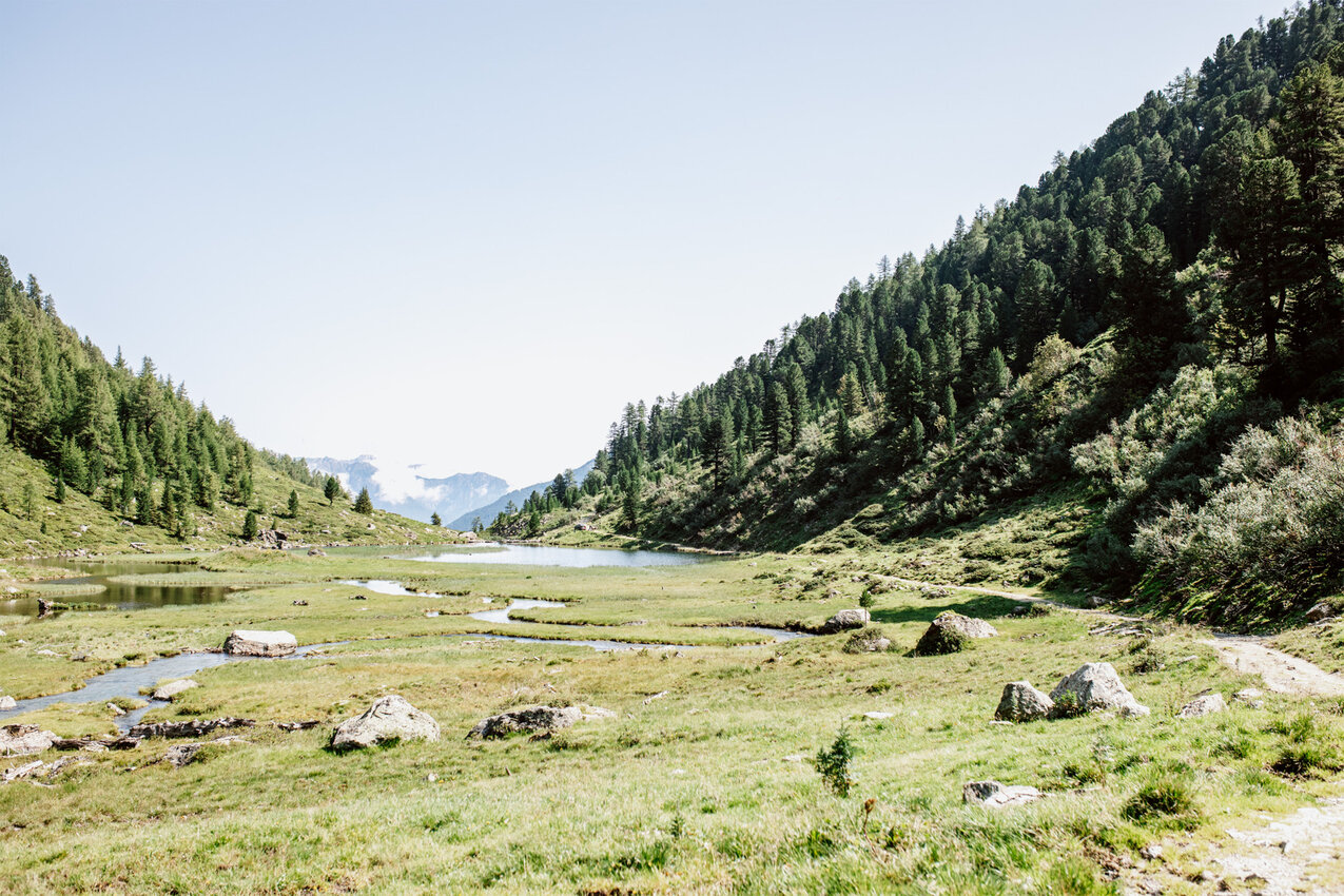 Dieser Tag könnte nicht besser sein: Schon um neun Uhr morgens ist der Himmel strahlendblau. Beste Bedingungen für eine E-Bike-Tour zu einem unberührten Lieblingsplätzchen, dem Urgsee. Die Tour startet beim Bikepark Fiss, hier gibt es eine von zahlreichen Bikeverleih-Stationen in Serfaus-Fiss-Ladis. Dann geht es quer durch Fiss entlang der Sägegasse und dem Almweg Richtung Rabuschl. Der gleichnamige Erlebnisspielplatz mitten im Wald ist der erste Stopp. Obwohl es noch früh am Vormittag ist, heizt die Sommersonne schon auf: Da kommt eine erste Trinkpause gerade recht.