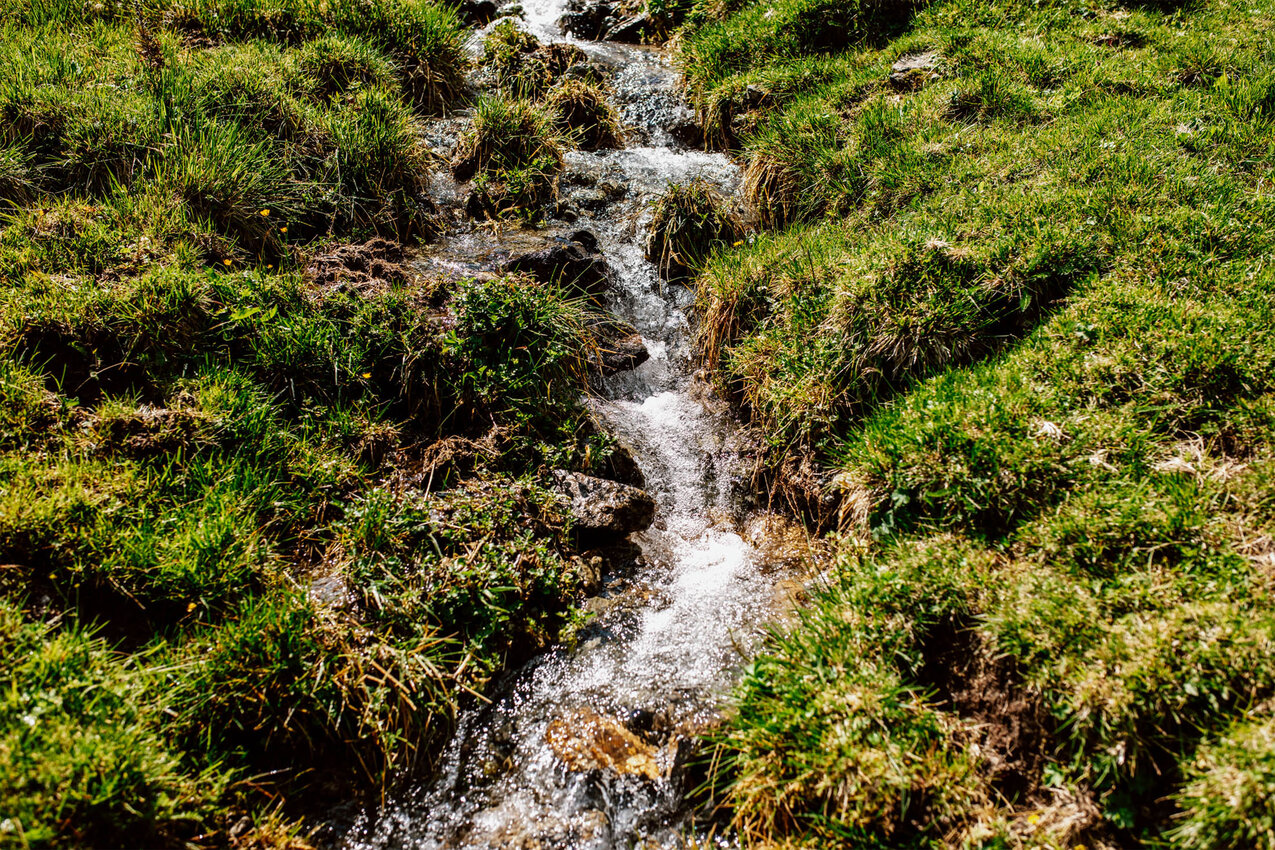 Natürlich müssen wir gleich die Wassertemperatur testen: Ganz schön kalt, um die Füße darin zu baden. „Ich liebe es, dass es am Urgsee so idyllisch und ruhig ist“, schwärmt Nadine. „Hier trifft man höchstens auf Hochlandrinder“, sagt sie und zeigt auf die Fellbüschel am Boden. Sie zeugen davon, dass die zotteligen Tiere vor kurzem auch hier am Bach eine Pause gemacht haben.