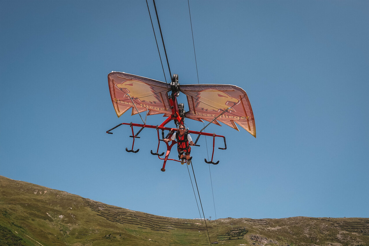 Zu den absoluten Highlights zählt der Fisser Flieger, ein Fluggerät, das vier Personen gleichzeitig in Bauchlage durch die Lüfte sausen lässt. Mit bis zu 80 Stundenkilometern „fliegst“ du über Almwiesen hinweg und fühlst dich schwerelos. Gleich daneben sorgt die Skyswing für Gänsehautmomente: Je nach Mut kannst du dich mit sanftem Schwung oder im freien Fall mit Überschlag durch die Luft katapultieren lassen.