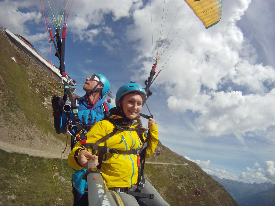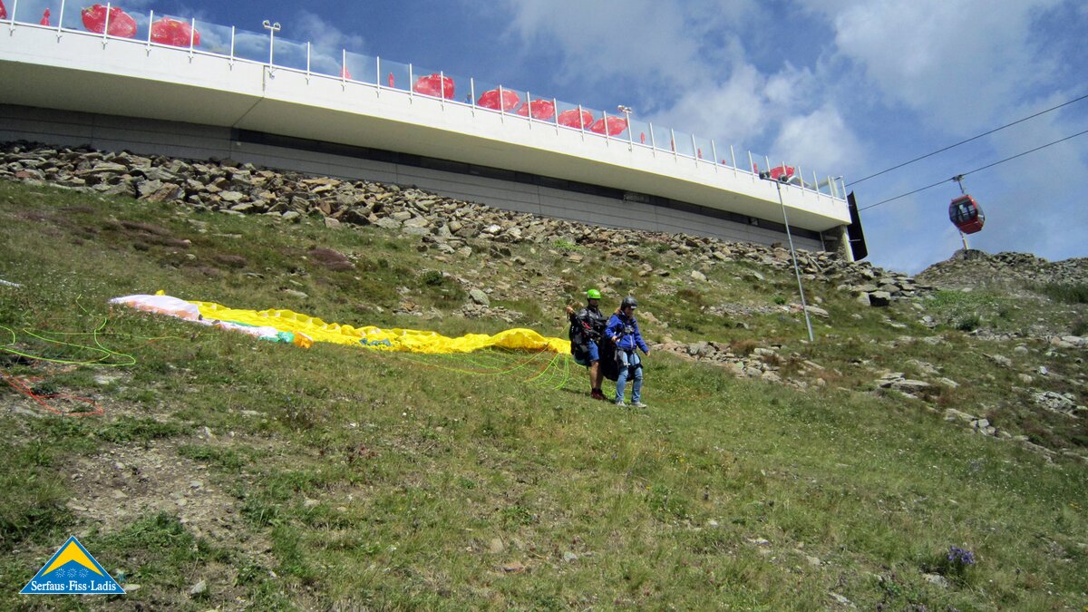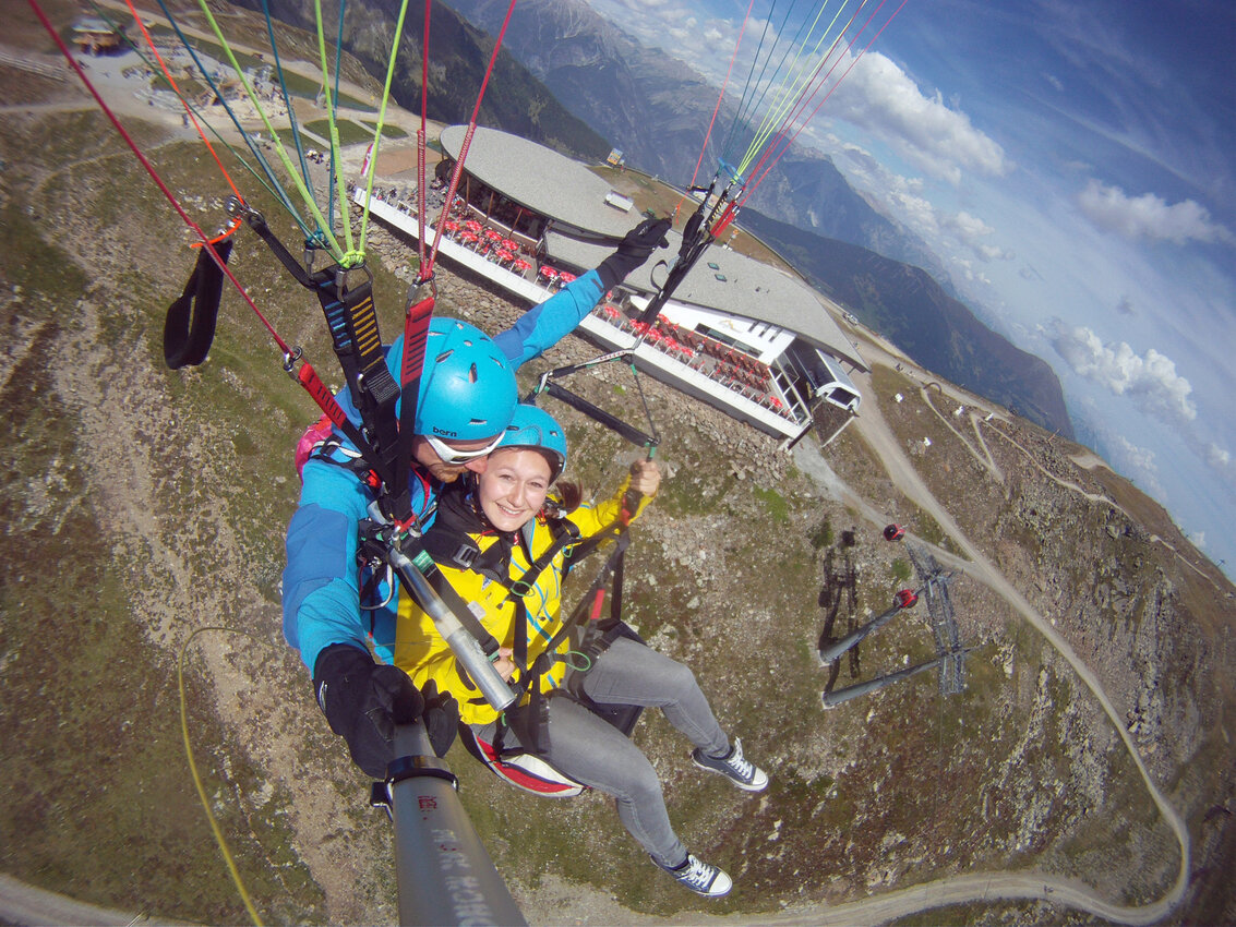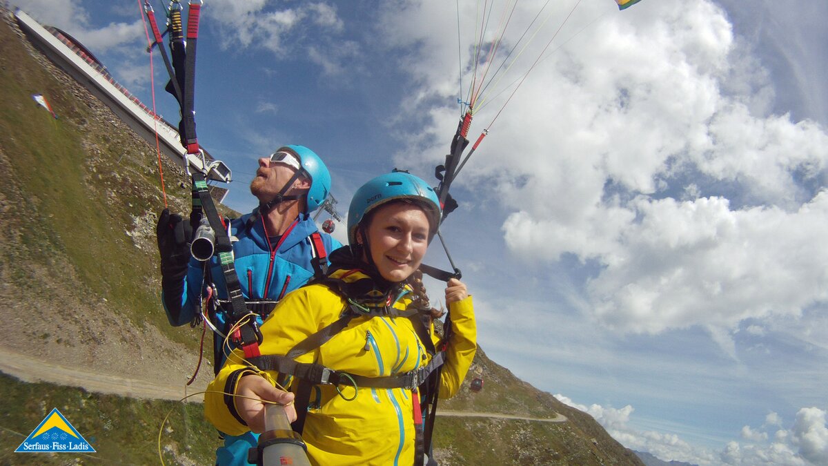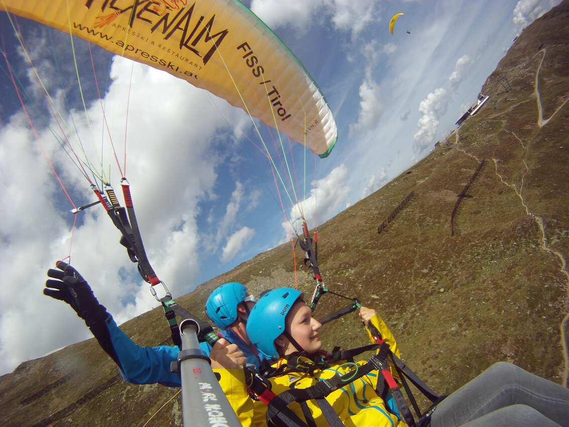 Alexandra: Als der Fluglehrer Roland vormittags anrief und uns sagte, dass an diesem Tag optimale Flugbedingungen herrschten und er noch 2 Plätze frei hätte, sagte ich sofort zu und die Vorfreude war sehr groß. Dennoch fing mein Herz an zu rasen und ich wurde sehr aufgeregt. Besonders als wir mit der Gondel zum „Abflugpunkt“ am Schönjoch in Fiss auf 2.436 m Seehöhe fuhren, gingen mir auf einmal tausend Gedanken durch den Kopf: Passt die Thermik? Hoffentlich kommt keine starke Windböe? Bin ich warm genug oder doch zu warm angezogen? Wird es mir tatsächlich Spaß machen? Kurzum: Wird alles gut gehen?