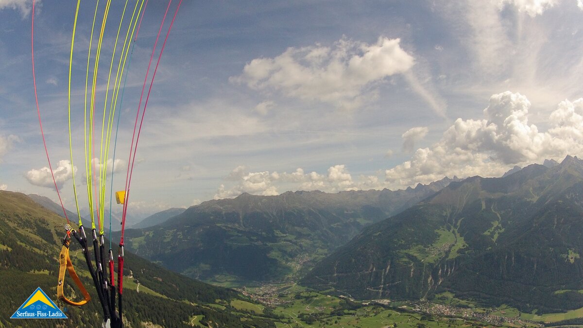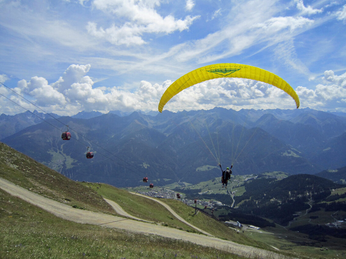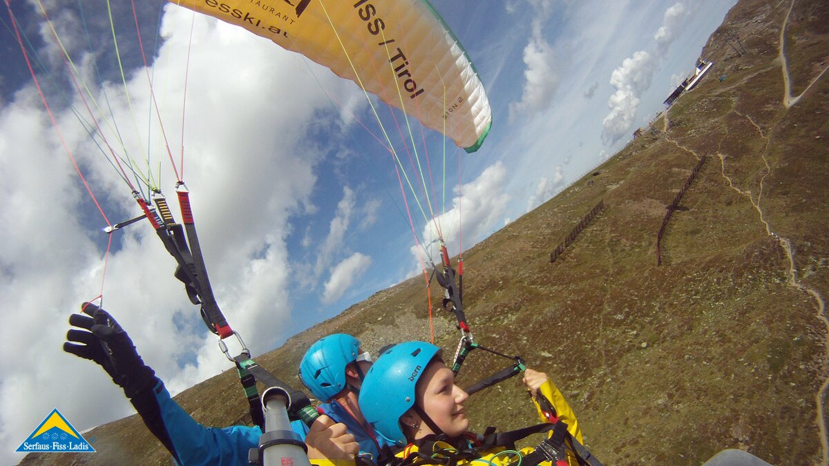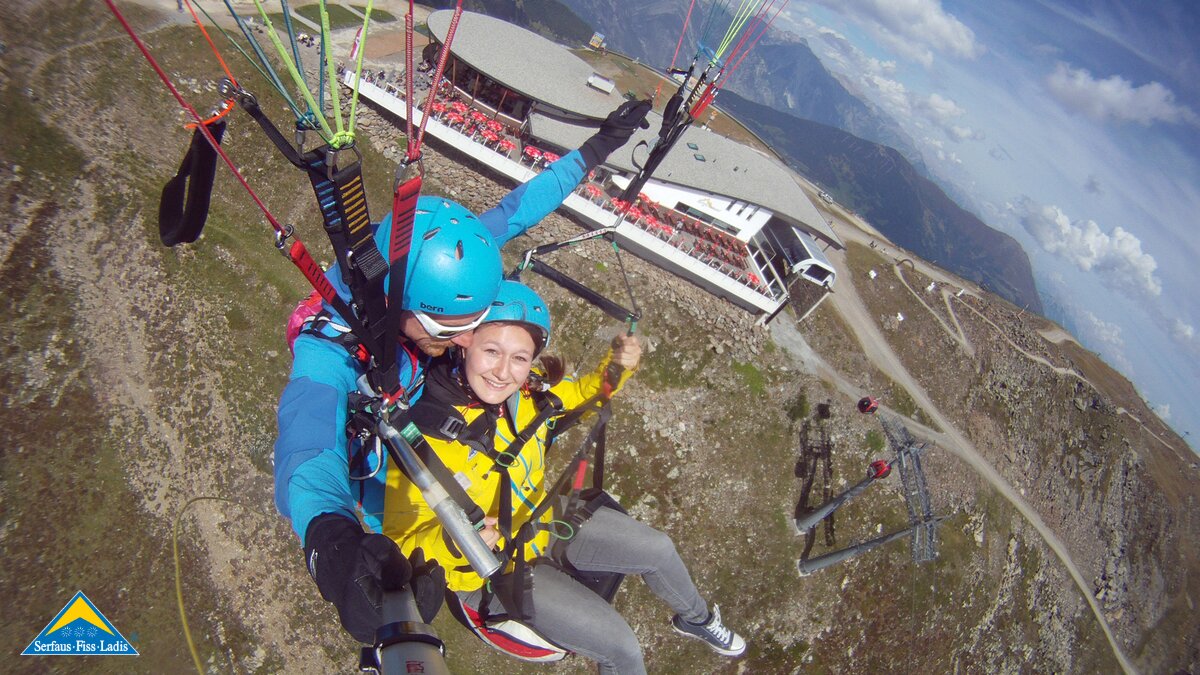 Alexandra: Als der Fluglehrer Roland vormittags anrief und uns sagte, dass an diesem Tag optimale Flugbedingungen herrschten und er noch 2 Plätze frei hätte, sagte ich sofort zu und die Vorfreude war sehr groß. Dennoch fing mein Herz an zu rasen und ich wurde sehr aufgeregt. Besonders als wir mit der Gondel zum „Abflugpunkt“ am Schönjoch in Fiss auf 2.436 m Seehöhe fuhren, gingen mir auf einmal tausend Gedanken durch den Kopf: Passt die Thermik? Hoffentlich kommt keine starke Windböe? Bin ich warm genug oder doch zu warm angezogen? Wird es mir tatsächlich Spaß machen? Kurzum: Wird alles gut gehen?