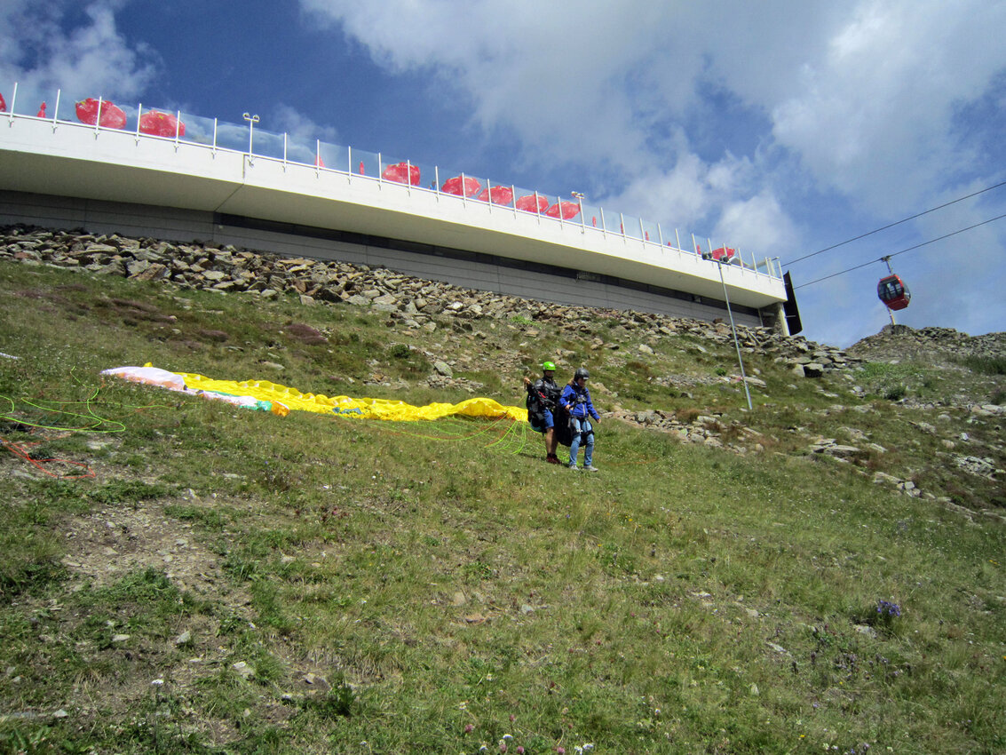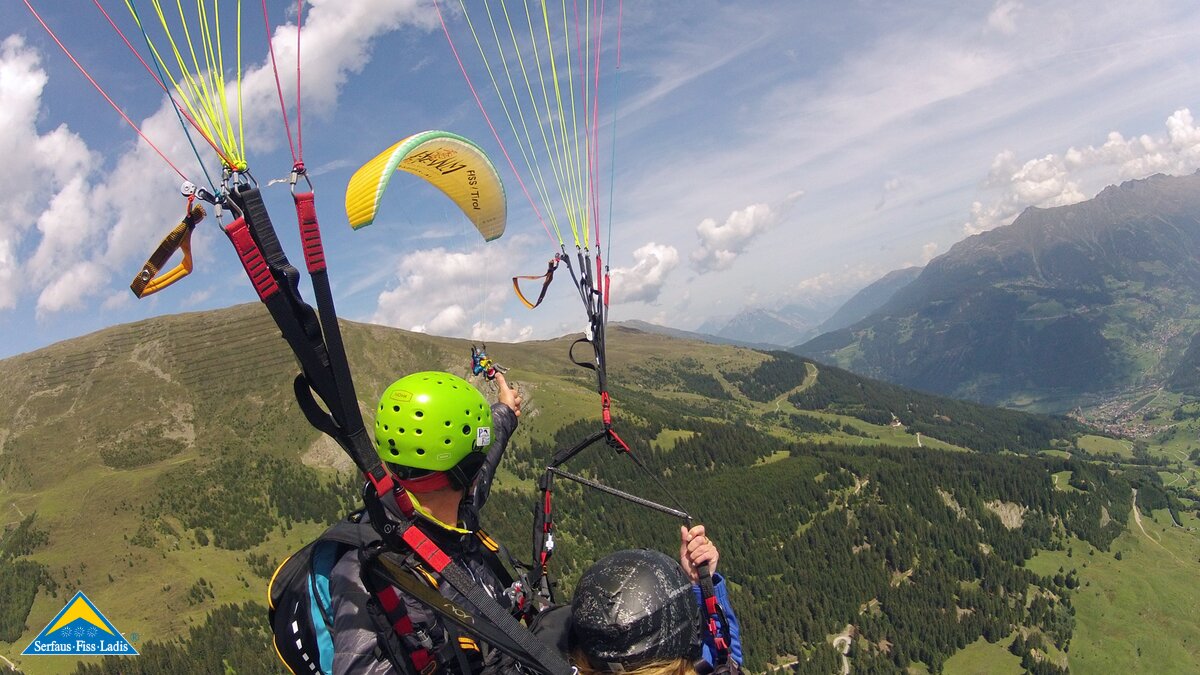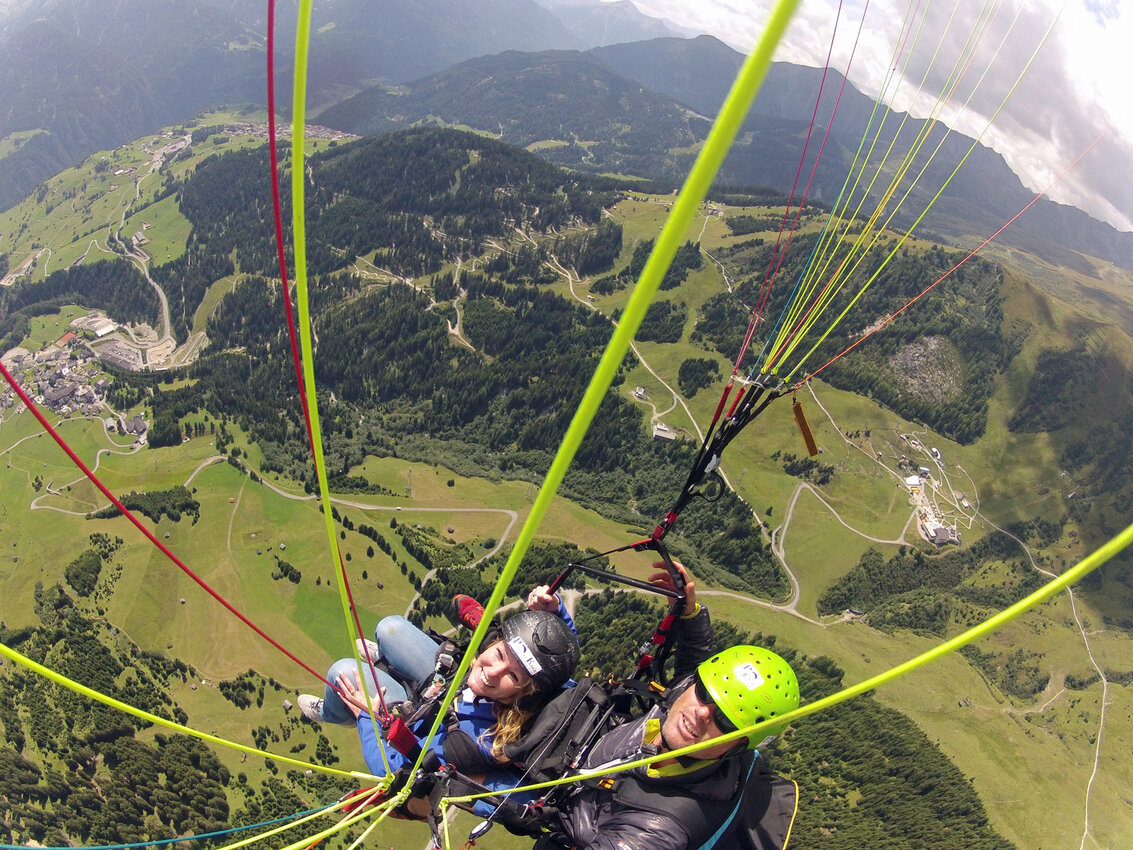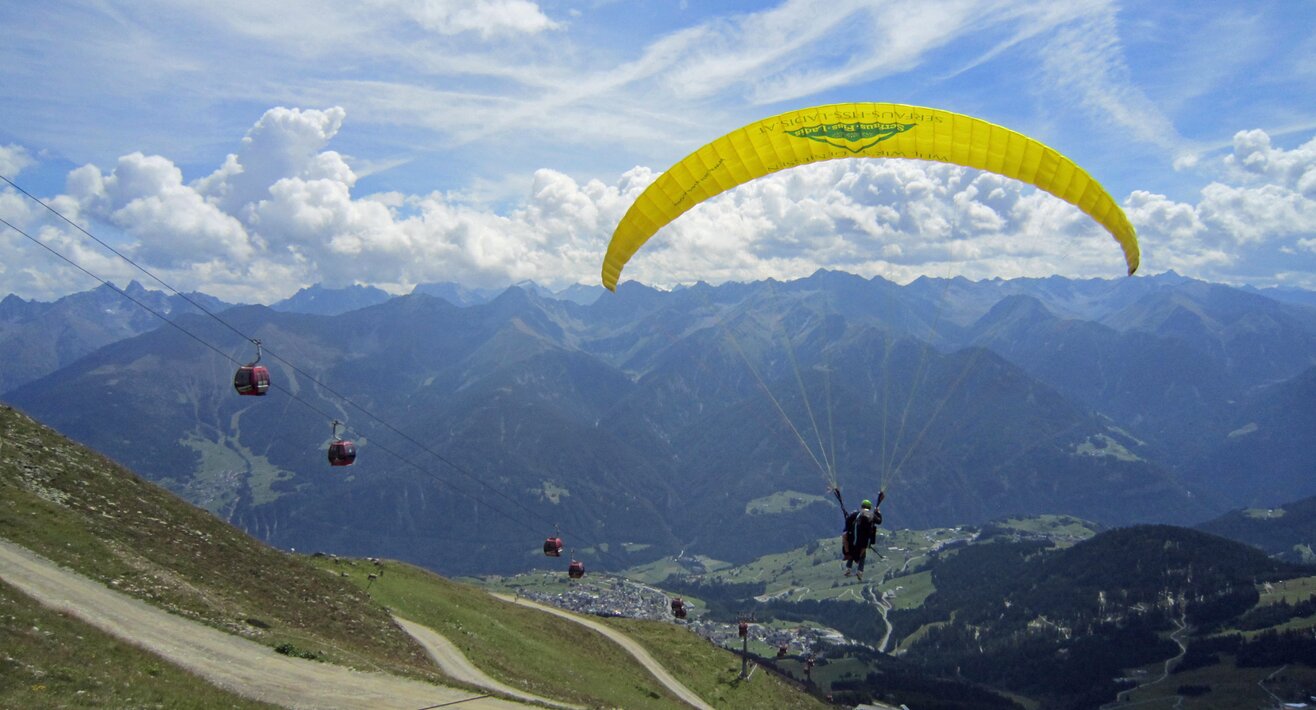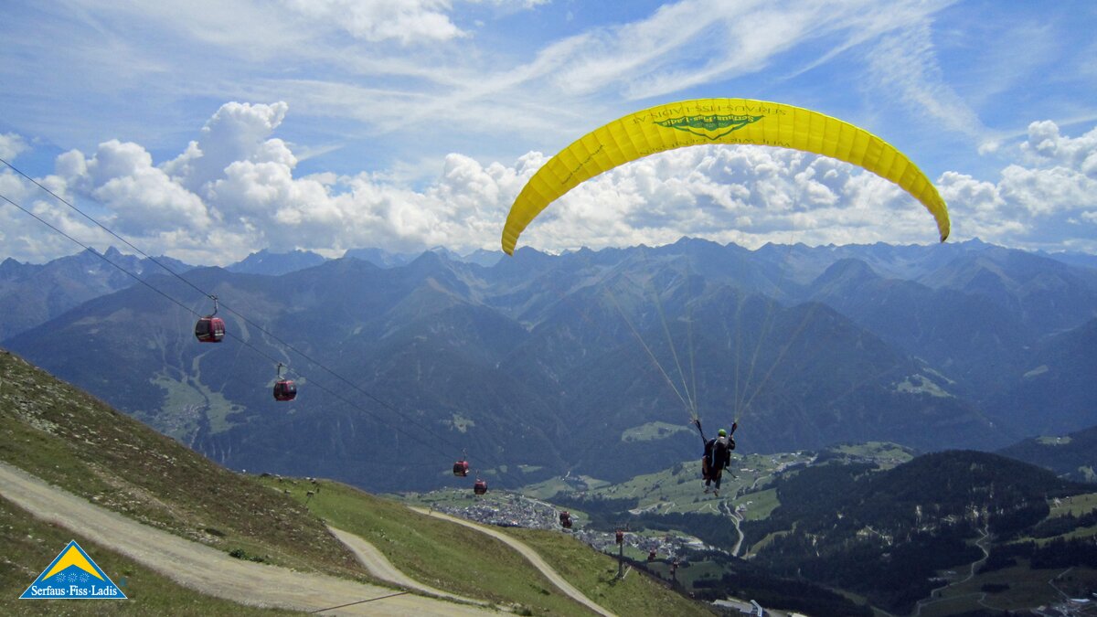 Alexandra: Als der Fluglehrer Roland vormittags anrief und uns sagte, dass an diesem Tag optimale Flugbedingungen herrschten und er noch 2 Plätze frei hätte, sagte ich sofort zu und die Vorfreude war sehr groß. Dennoch fing mein Herz an zu rasen und ich wurde sehr aufgeregt. Besonders als wir mit der Gondel zum „Abflugpunkt“ am Schönjoch in Fiss auf 2.436 m Seehöhe fuhren, gingen mir auf einmal tausend Gedanken durch den Kopf: Passt die Thermik? Hoffentlich kommt keine starke Windböe? Bin ich warm genug oder doch zu warm angezogen? Wird es mir tatsächlich Spaß machen? Kurzum: Wird alles gut gehen?