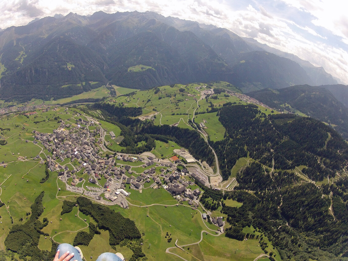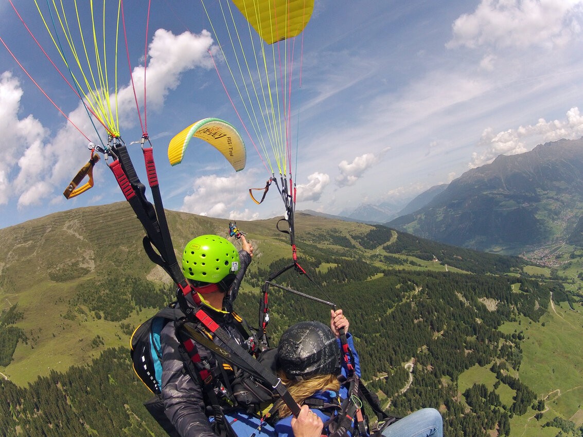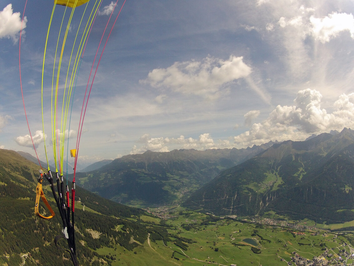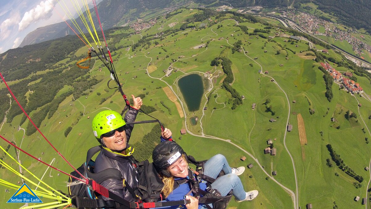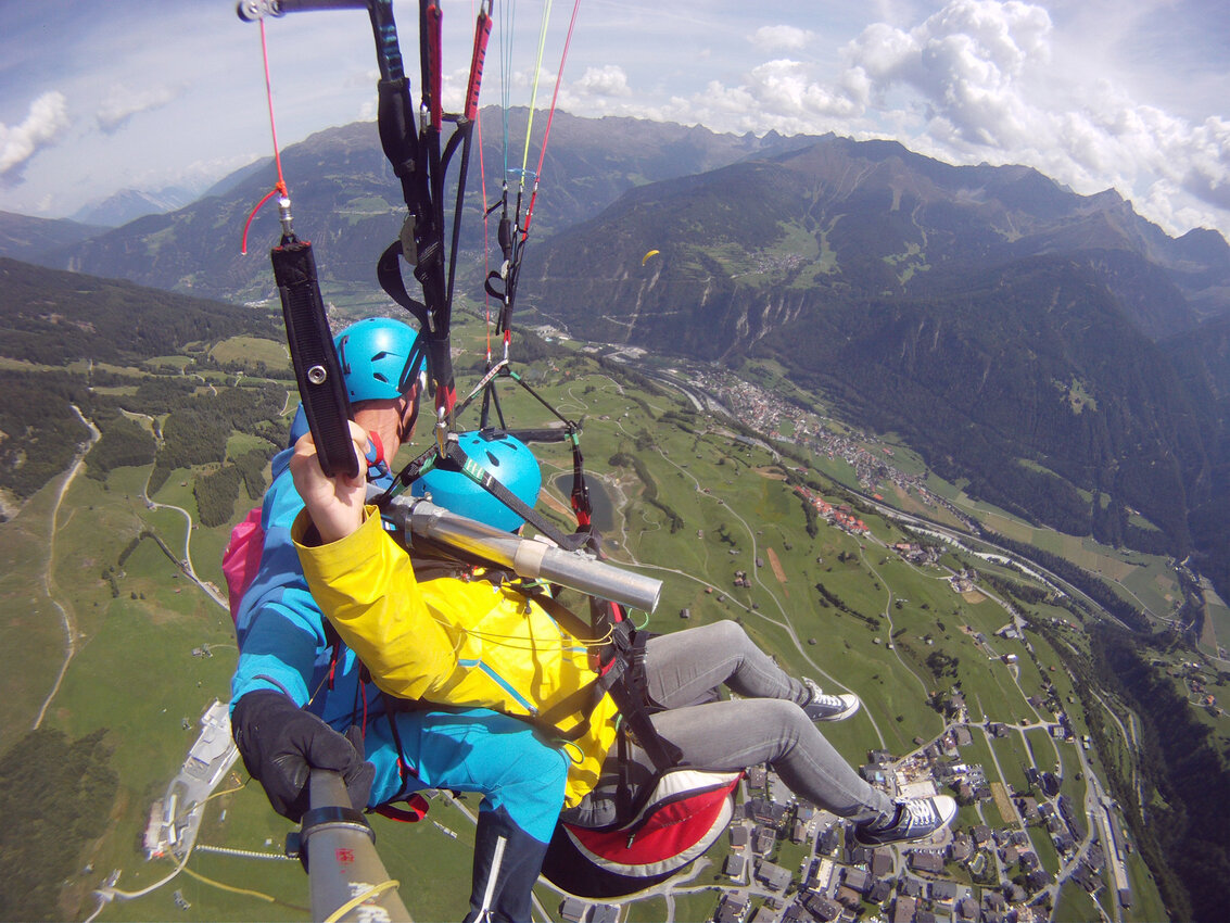Elena: Noch nie habe ich etwas Schöneres erlebt, als die Landschaft aus dieser Perspektive bestaunen zu dürfen. Der Wolfsee in Fiss glitzerte faszinierend und unter uns herrschte reges Treiben. Wir machten schnell noch ein paar Schnappschüsse, um diese traumhafte Kulisse festzuhalten. Besonders cool war, dass ich den Schirm nach einer kurzen Instruktion von meinen Fluglehrer Jo selber lenken durfte. Durch meinen Kopf raste kurz der Gedanke: Hoffentlich mache ich nichts falsch und lasse die Lenkseile nicht los. Nichtsdestotrotz spürte ich ein Gefühl von grenzenloser Freiheit. Mich überraschte, wie schnell der Schirm auf jeden kleinsten meiner „Befehle“ reagierte.