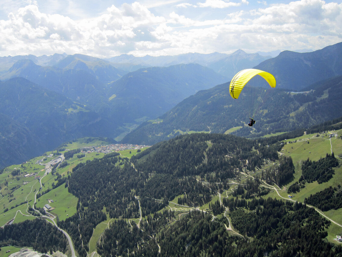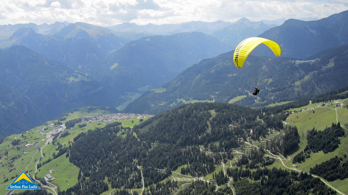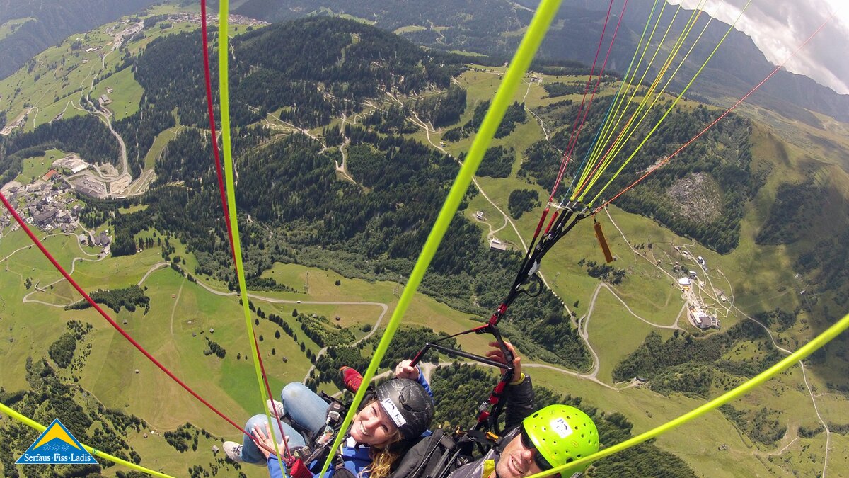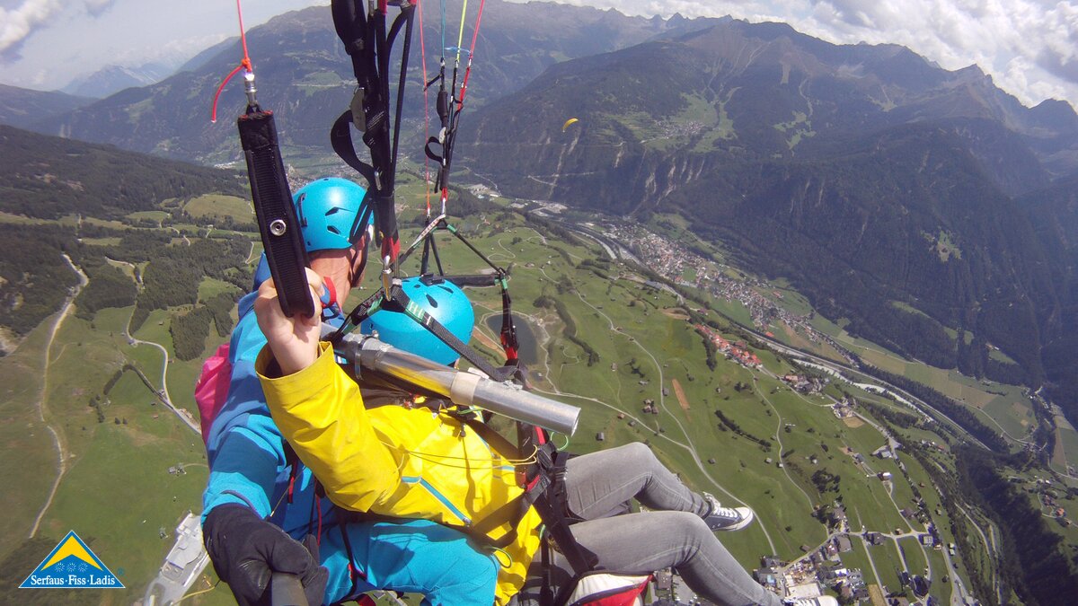 Alexandra: Erstmal war ich überrascht, wie bequem ich in dem Sitzgurt saß – fast wie in einem TV-Sessel. Es war überwältigend: Über mir sah ich den blitzblauen Himmel und unter mir das Plateau mit all seiner Faszination. Die Thermik ließ uns noch ein bisschen höher steigen und ich konnte das Panoramarestaurant BergDiamant in Fiss von oben betrachten. Auch über das neu eröffnete Kinder Bergwerk machten wir einen Schwenker und ich konnte sehen, wie Kinder und Erwachsene jede Menge Spaß hatten. Nun ging es weiter Richtung Süden – vor mir breitete sich das gesamte Panorama mit den mächtigen 3.000er Bergen aus. Rechts von uns lag der Högsee. Dieser spiegelte sich wunderschön. Links von uns zeigte sich prachtvoll das Dörfchen Ladis mit der Burg Laudeck und unter uns das gesamte Dorf Fiss. Ich fühlte mich wie ein Vogel in der Luft. Es war so still – ich hörte nur den Wind säuseln.