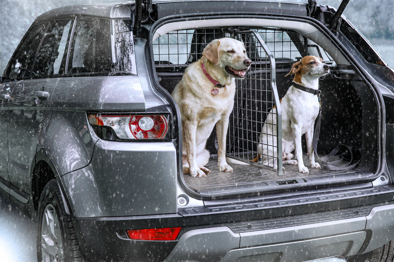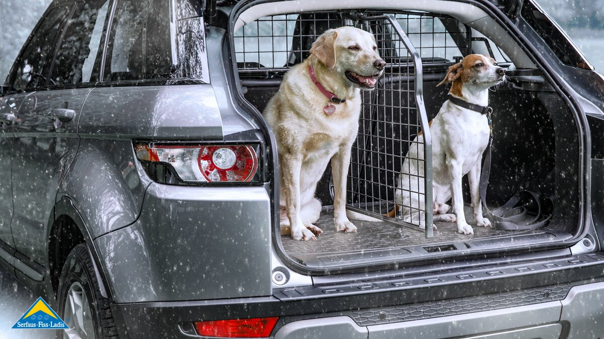Ein fahrzeugspezifisches Hundegitter hat den Vorteil, dass der Hund ausreichend Platz und bei einer längeren Fahrt in den Winterurlaub auch Bewegungsfreiheit hat. Besonders für ältere Hunde oder größere Rassen ist es angenehmer, wenn sie sich zwischendurch umdrehen oder lang ausstrecken können. Ein Laderaumteiler, der am Trenngitter befestigt wird, schützt vor Gefahren durch verrutschende Ladungen.