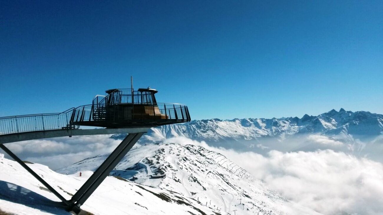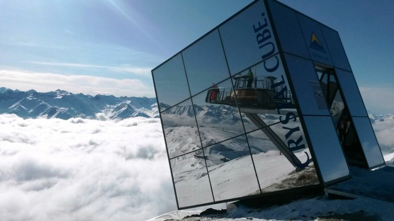Der Crystal Cube ist ein verspiegelter Glaswürfel, der schräg am Berg klebt und neben der Aussichtsplatform Z1 in Fiss auf 2.600 Metern liegt.