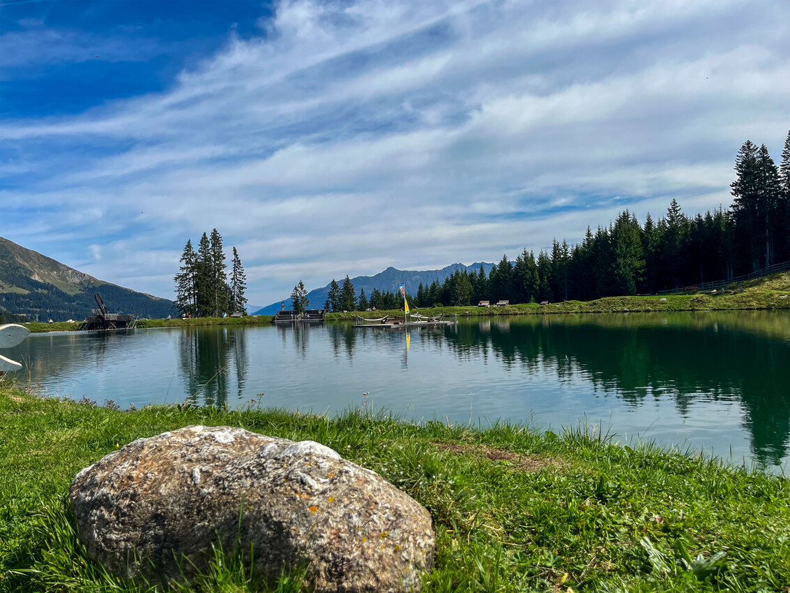 Je näher wir der Außerhög kommen, desto weiter wird der Blick, die Bäume treten langsam zurück und die Landschaft öffnet sich. Ab hier führt ein breiter Fahrweg sanft hinauf zum Högsee – unserem Ziel an diesem Tag. Der See liegt ruhig und glasklar vor uns, eingebettet in die umliegende Berglandschaft – einfach wunderschön. Wir haben uns ein stilles Plätzchen am Ufer gesucht, die Schuhe ausgezogen und die Füße im kühlen Wasser gebadet. Auch Ylvie hat sich mutig ins kühle Blau gewagt und genüsslich geplantscht.