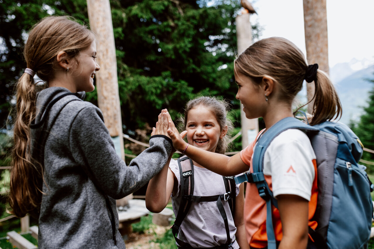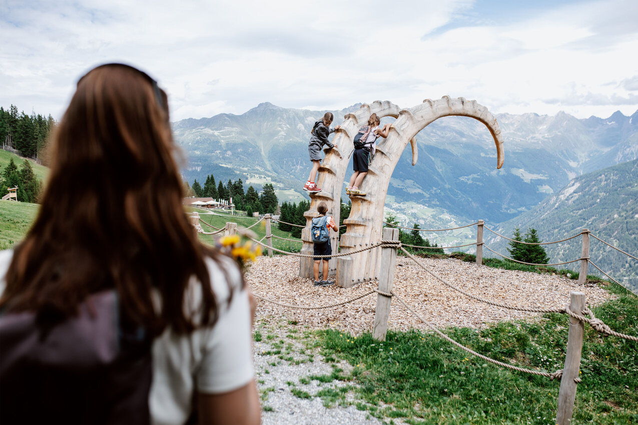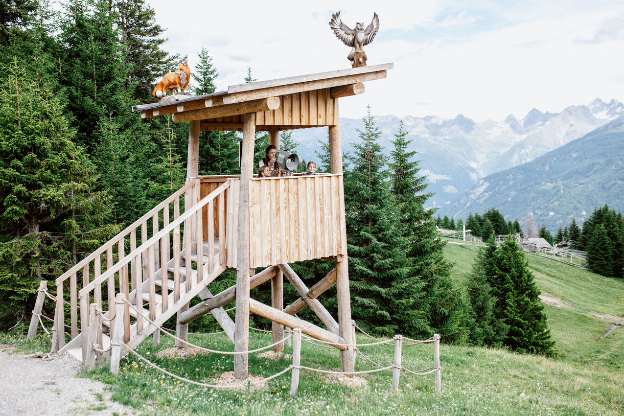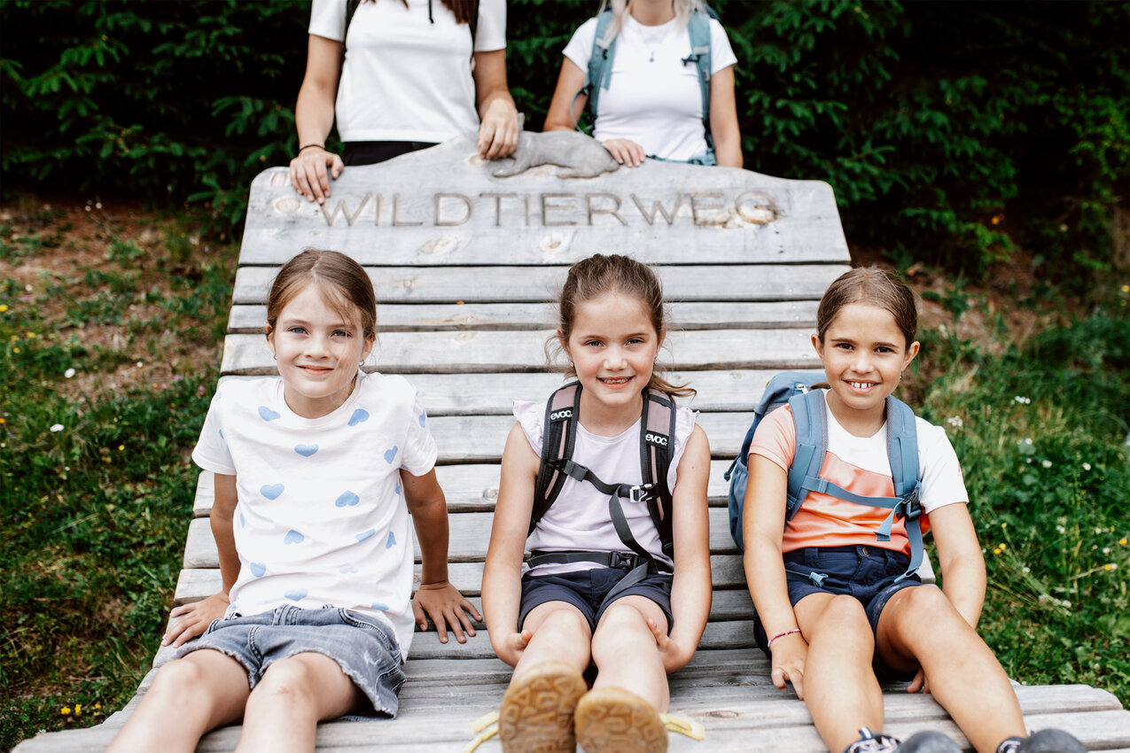 Den neuen Wildwanderweg entdecken: Da müssen Magdalena, Maria und Selina nicht zweimal gefragt werden! Schnell ist der Rucksack gepackt und die drei Mädchen im Alter von sieben bis neun Jahren sitzen in der Gondel der Schönjochbahn. An der Mittelstation endet die Fahrt und das Abenteuer beginnt: Das erste Teilstück führt über den Fisser Kraft- und Sinnesweg, der direkt zum Wildtierweg leitet. Keine Sorge, auch dieser Abschnitt ist kurzweilig. An den abwechslungsreichen Erlebnisstationen gibt es schon hier viel zu entdecken und bald ist der Startpunkt des Wildtierwegs erreicht.