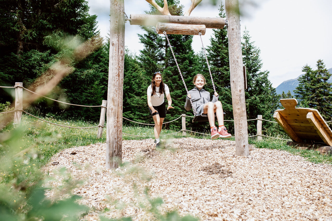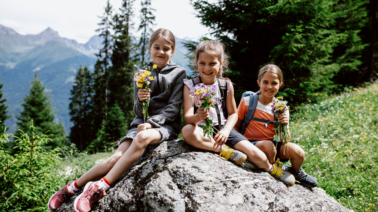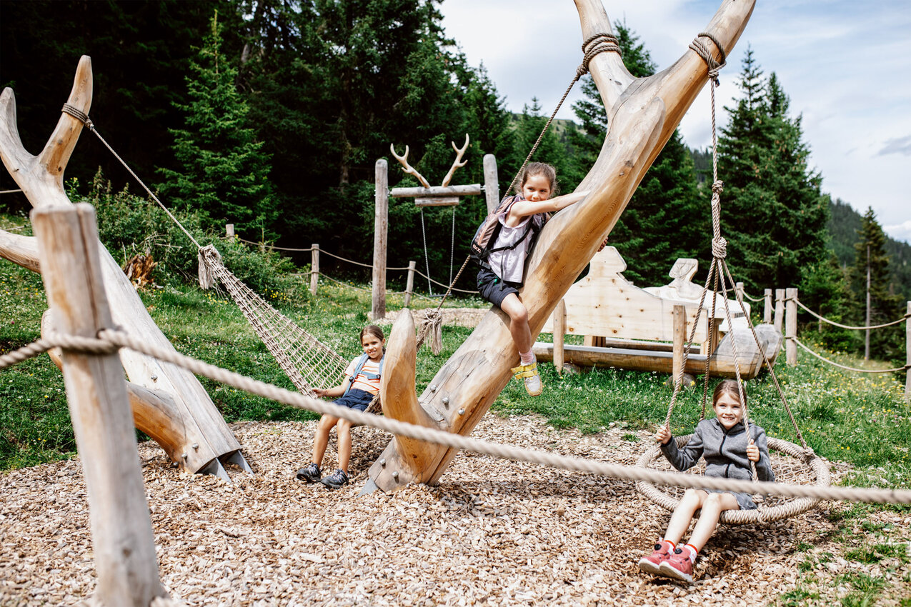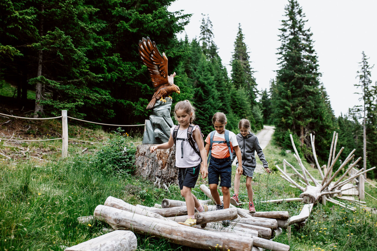 Den neuen Wildwanderweg entdecken: Da müssen Magdalena, Maria und Selina nicht zweimal gefragt werden! Schnell ist der Rucksack gepackt und die drei Mädchen im Alter von sieben bis neun Jahren sitzen in der Gondel der Schönjochbahn. An der Mittelstation endet die Fahrt und das Abenteuer beginnt: Das erste Teilstück führt über den Fisser Kraft- und Sinnesweg, der direkt zum Wildtierweg leitet. Keine Sorge, auch dieser Abschnitt ist kurzweilig. An den abwechslungsreichen Erlebnisstationen gibt es schon hier viel zu entdecken und bald ist der Startpunkt des Wildtierwegs erreicht.