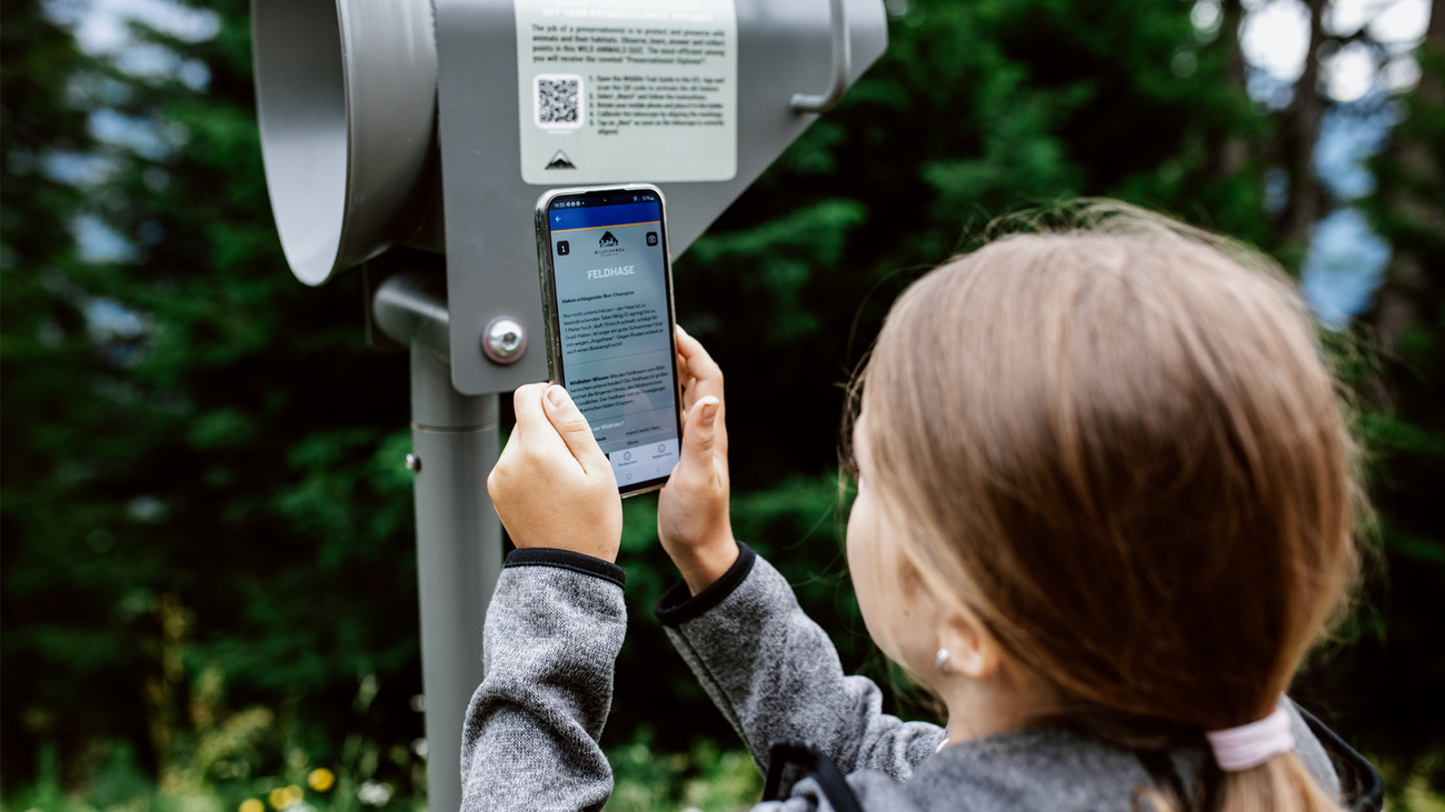 Insgesamt acht Stationen mit Fernrohren und spannenden Quizfragen warten auf die kleinen Entdeckerinnen. Mit Mamas Smartphone in der Hand versammeln sich die Mädchen um das erste Fernrohr. Ein QR-Code wird mit der App gescannt, das Handy in die vorgesehene Halterung gelegt – und schon hoppeln virtuelle Wildhasen über den Bildschirm. „Schau, da ist noch einer!“, ruft Magdalena begeistert, als ein weiteres Tier auftaucht. „Aber in Wirklichkeit sind die Hasen gar nicht da“, wundert sich Selina.