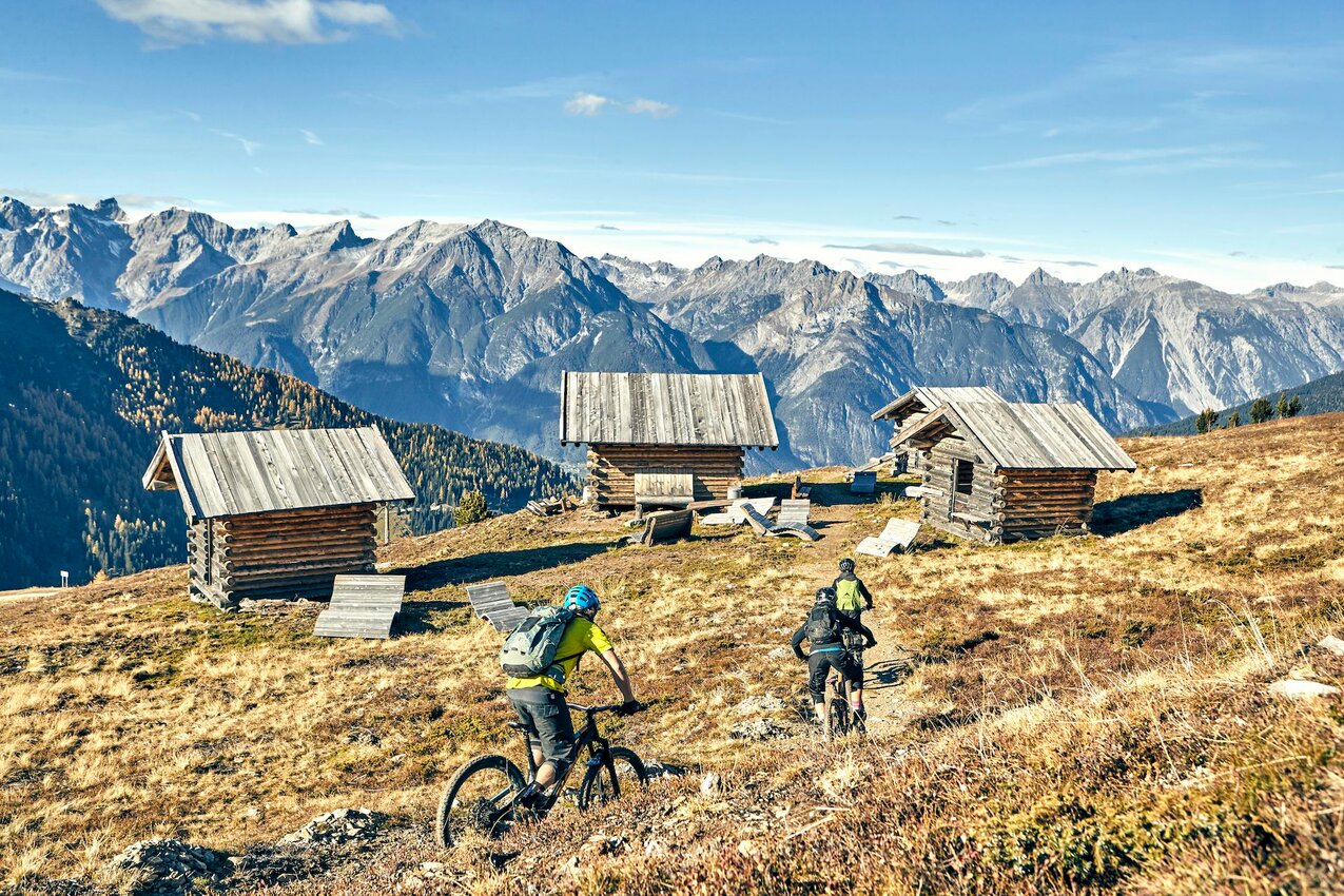 Sind dir die rustikalen Hütten mit ihren dicken runden Hölzern auf der Fisser Nordseite schon mal aufgefallen? Im Sommer führt der Zirbentrail an ihnen vorbei. Sie laden ein, den Puls der Biker für einen kurzen Augenblick zu mäßigen und das Glück, sich in der Natur bewegen zu dürfen, zu begreifen. Die Aussicht hier oben ist nämlich ganz schön grandios.