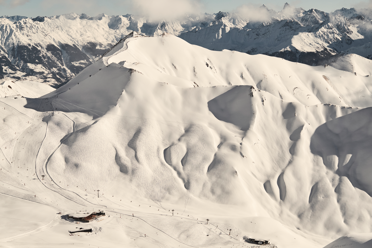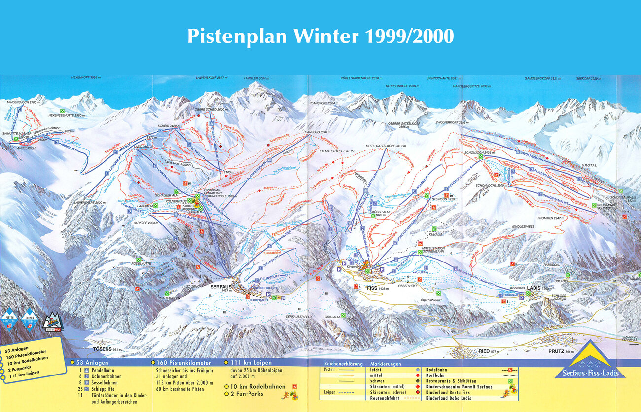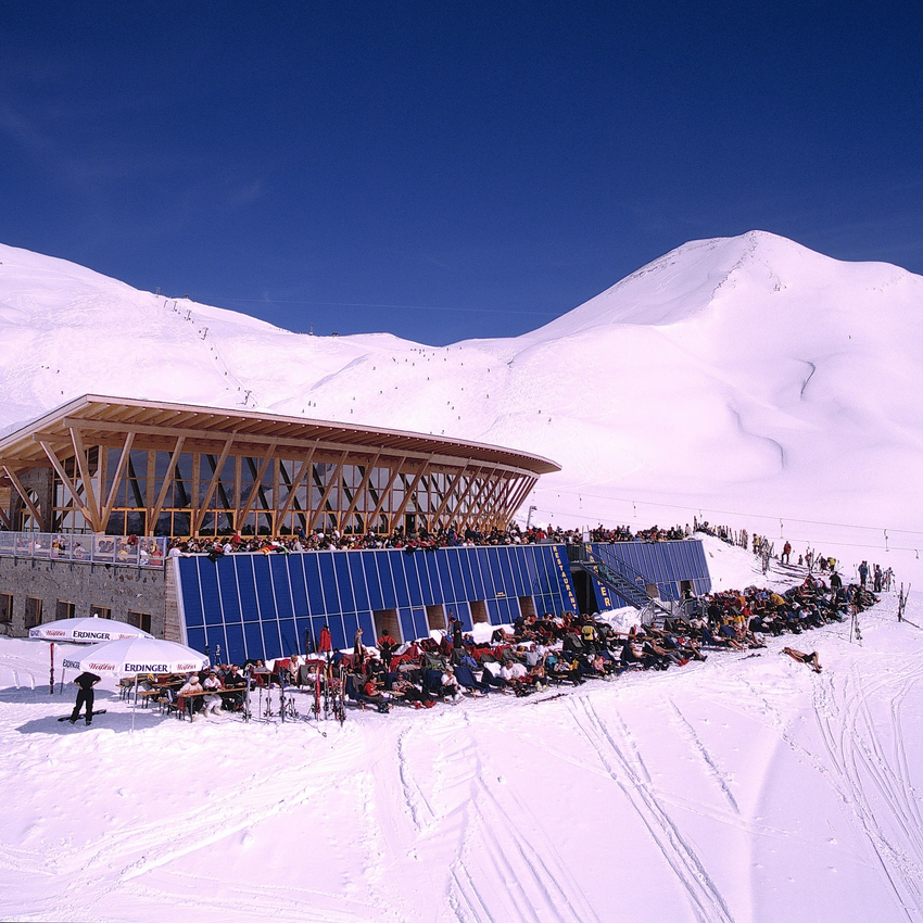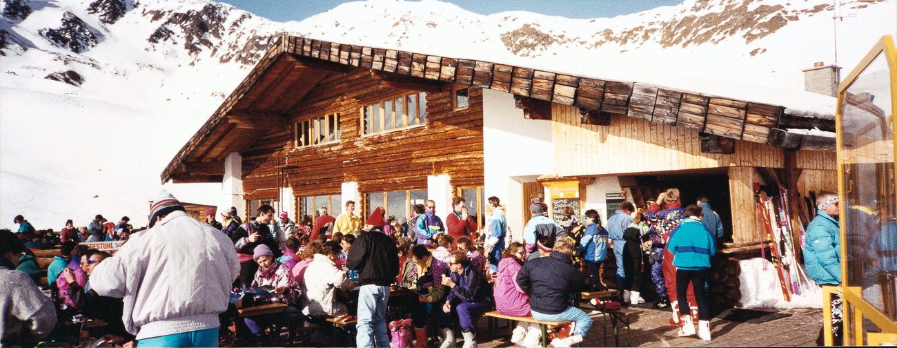 Blick nach Serfaus: Im November 1998, ein Jahr vor dem Zusammenschluss, wurde die SKIHÜTTE MASNER auf 2.400 m ein Raub der FLAMMEN. Innerhalb kürzester Zeit wurde ein Provisorium aus Baracken und einem Küchencontainer errichtet. In dem Provisorium konnten Gäste einen Winter lang notdürftig versorgt werden. PÜNKTLICH zu Beginn der ersten gemeinsamen Wintersaison 1999/2000 wurde schließlich mit viel Arbeitseinsatz das neue Restaurant im schneereichen Masner eröffnet. Die Skihütte Masner 2.0 erhielt den Niedrigenergiehauspreis und war somit am Puls der Zeit. Und das bereits vor 20 Jahren
