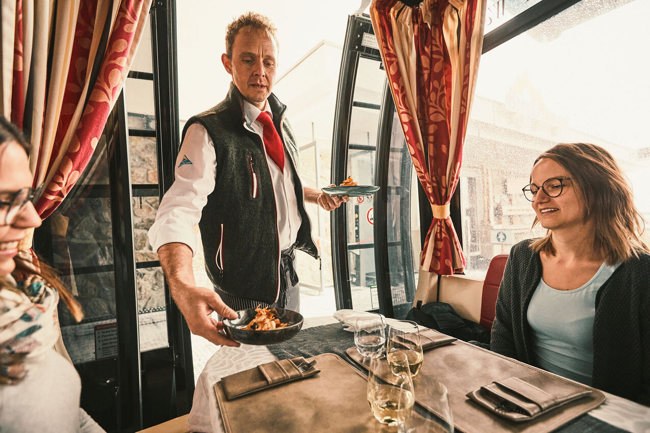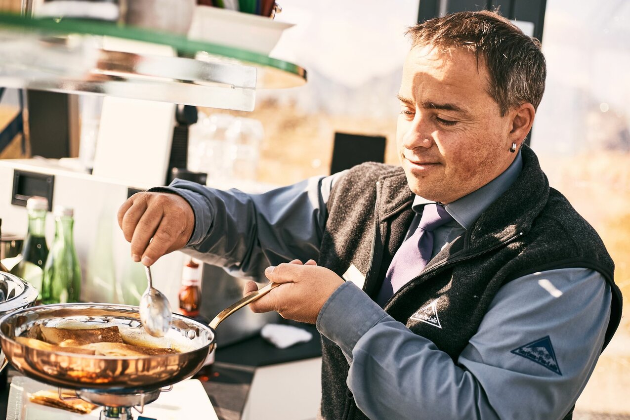 Seit Winter 2012/13 arbeitet der Niederländer bei den Bergbahnen. „Jeder Arbeitstag in den Bergrestaurants wartet mit neuen Überraschungen auf mich. Natürlich kommen auch einige bekannte Gesichter zu uns, in der Regel sind es aber immer neue Menschen, denen ich begegne. Es wird also nie langweilig. Morgen heiratet beispielsweise ein Paar in unserem Cube“, so der sportliche Kellner, der im Sommer in der Woche gerne mal 3.000-5.000 Höhenmeter mit seinem Rad zurücklegt. Wo fühlt er sich am wohlsten? Auf den etwas abgelegeneren Routen in SFL, um den Kopf ordentlich freizubekommen. „Mein Job ist sehr vielfältig. Wenn es morgens noch ruhig ist, unterstütze ich die Küche und rolle Knödel oder räume im Winter den Schnee von den Terrassen."