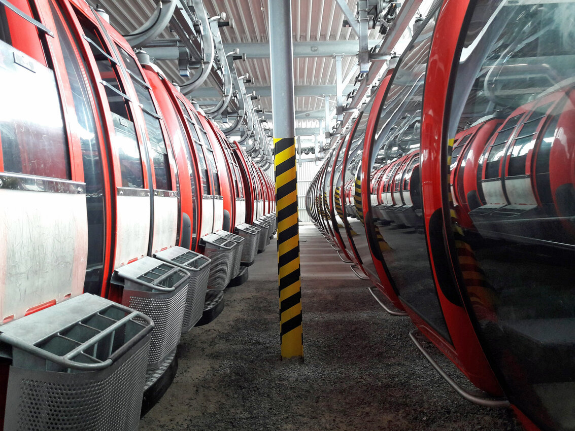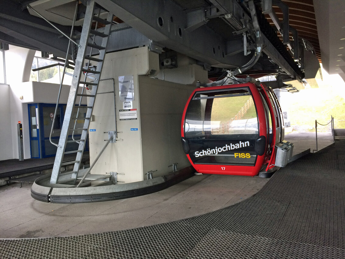 Der Gondelbahnhof an der Mittelstation der Schönjochbahn beherbergt in den Zwischensaisonen 117 rote 8er-Kabinen. Die Möglichkeit durch die Gänge zwischen den Gondelreihen in der Bahnhofshalle zu schlendern, hat man nicht alle Tage. Ich war ganz schön beeindruckt. Zwischen den roten „Schafen“ versteckte sich bei meinem Besuch auch ein schwarzes in der Gondelherde – die elegante Genussgondel. In der luxuriösen Genussgondel können Genießer im Sommer kulinarisch über die Tiroler Wiesen schweben. Ein besonderes gastronomisches Erlebnis, das ich unbedingt einmal ausprobieren möchte. Innerhalb der wenigen Wochen vor Saisonstart müssen auch diese Gondeln unter die Lupe genommen werden.