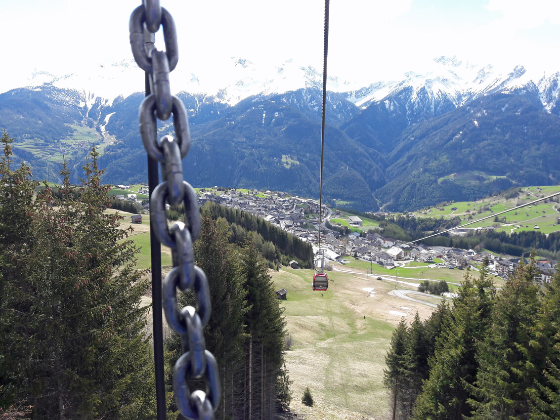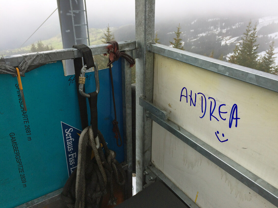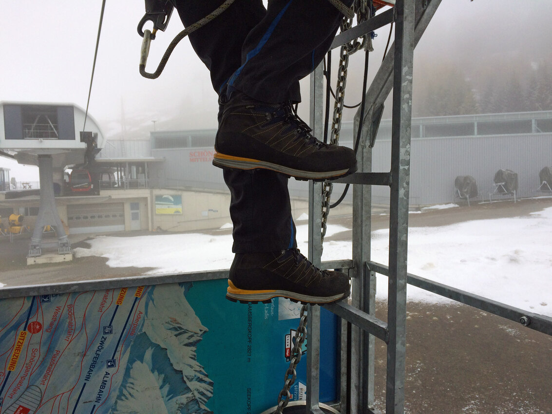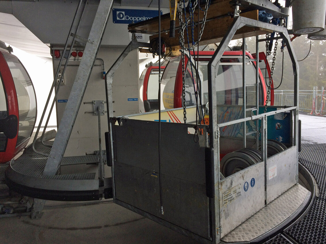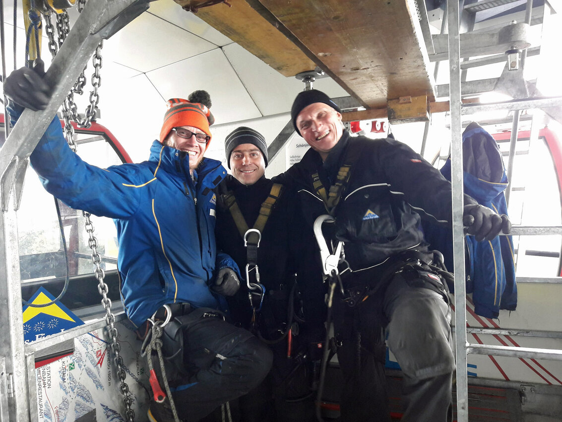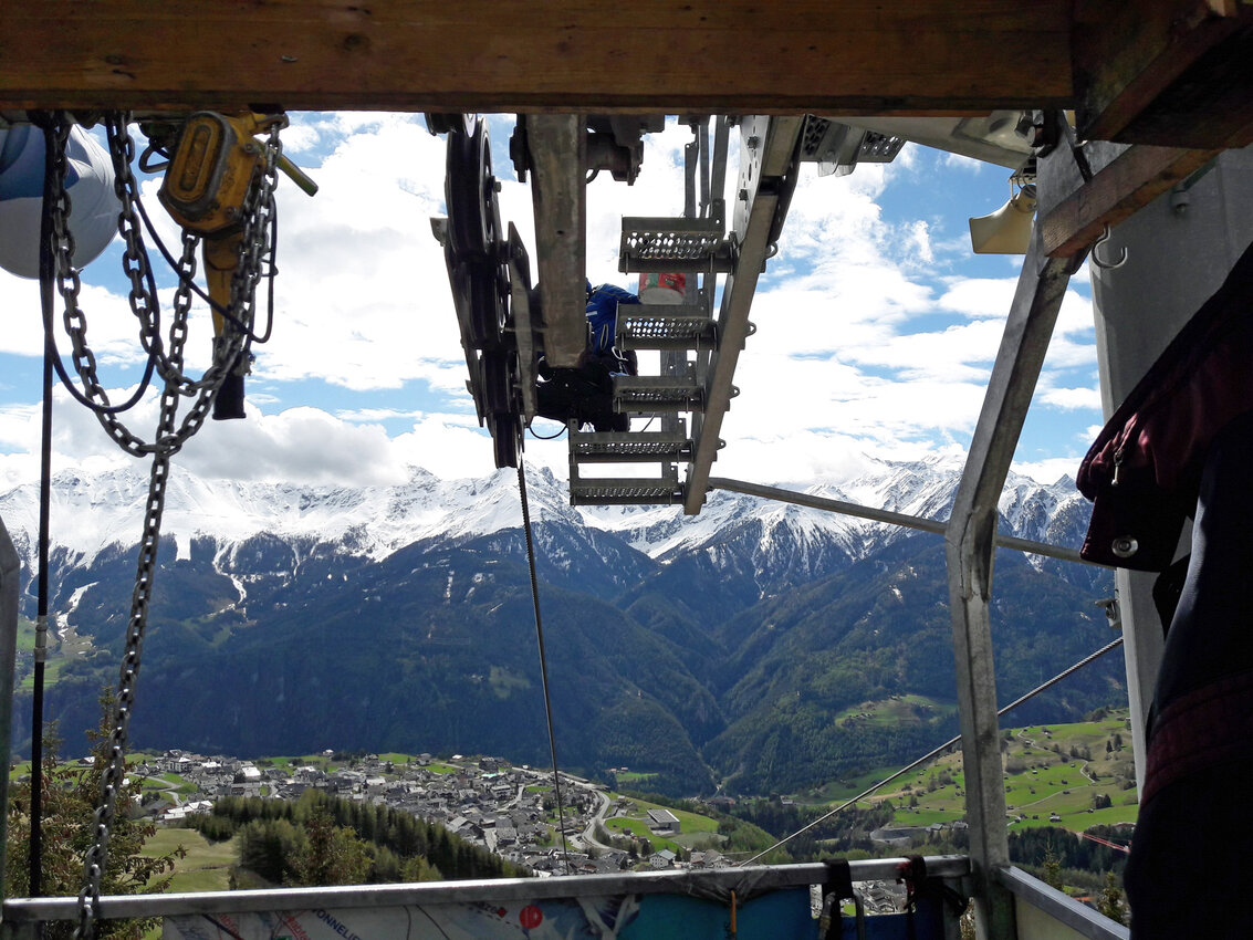 „Bitte einsteigen“ hieß es vom Revisionstrupp der Schönjochbahn, dem ich über die Schultern blicken durfte. Gebi, Andi und Nobs wiesen mir den Weg in den offenen Revisionskorb, der in die Seilbahn eingehängt war. Die „drei Musketiere“ waren ein eingespieltes Team und kletterten, gut gesichert mit einem Klettergurt, sogleich die Leiter hinauf auf den Korb bzw. das Wartungspodest an der Stütze. Der Korb wurde dabei von Christoph von der Mittelstation aus an die jeweilige Stütze navigiert. Wir fuhren mit einer Minimalgeschwindigkeit von 0,3 m/s an die Doppelstütze 10a/10b. Die Maximalgeschwindigkeit einer Gondelbahn beträgt schon etwas mehr: Bis zu 6 Meter pro Sekunde bringen einige Seilbahnen auf den Tacho.